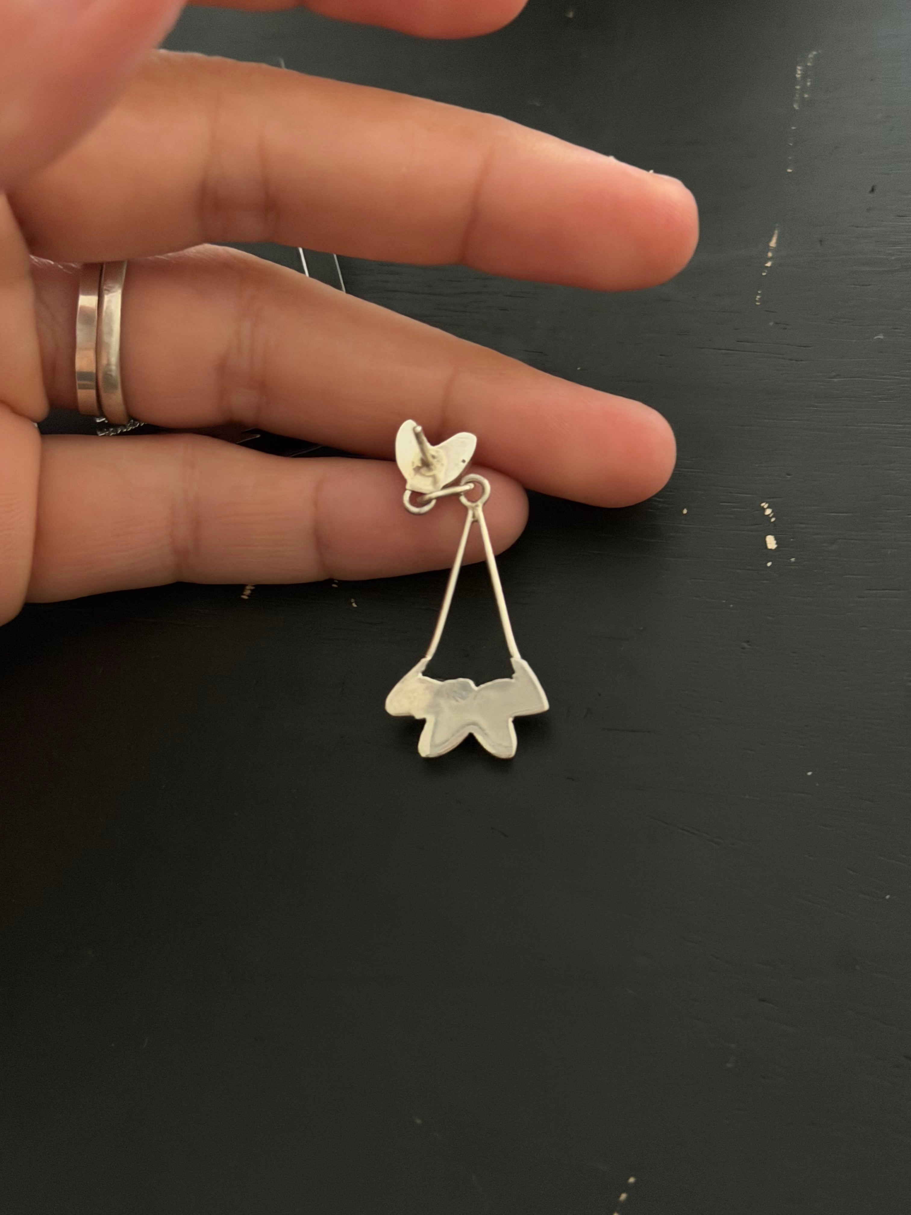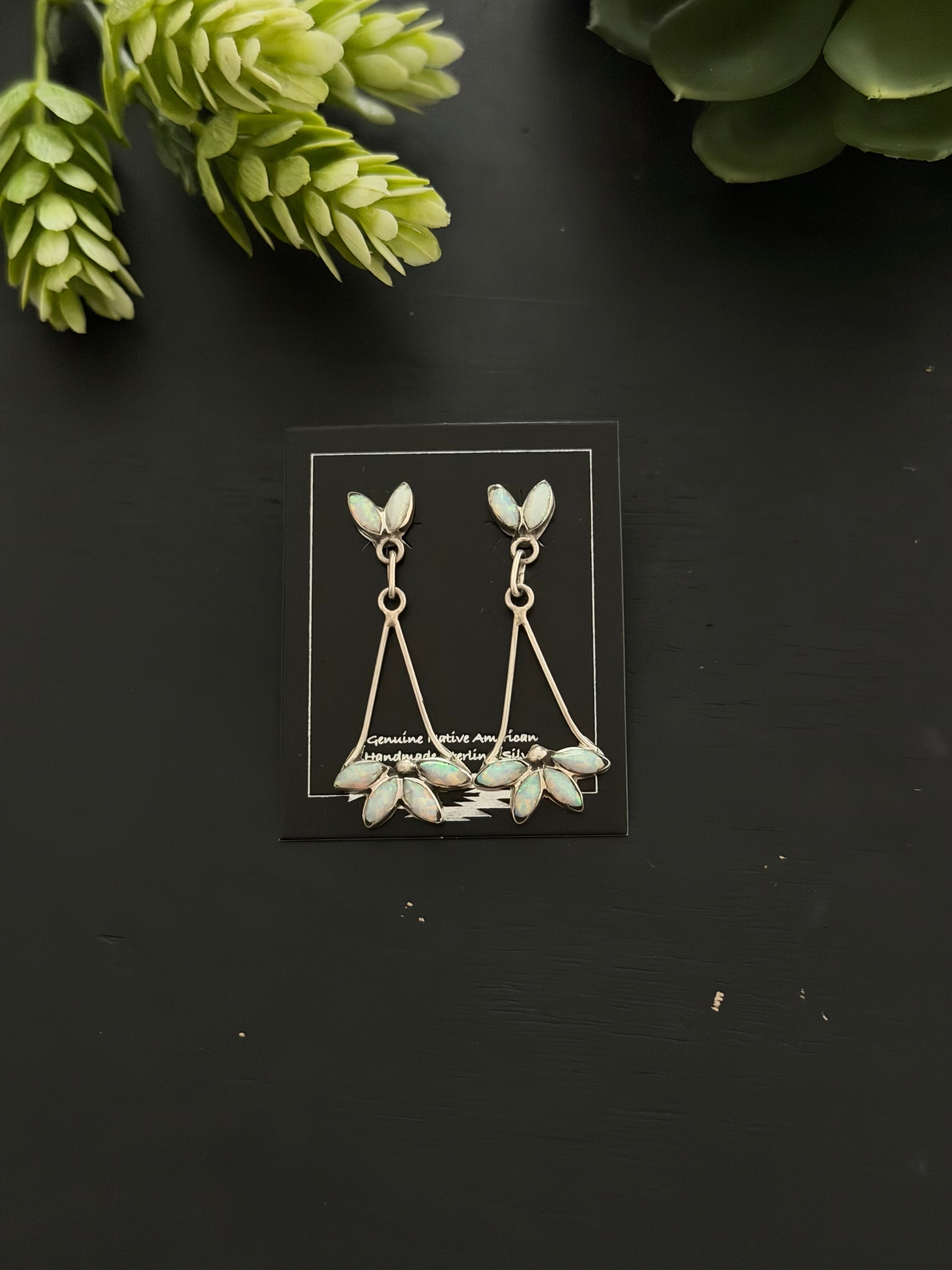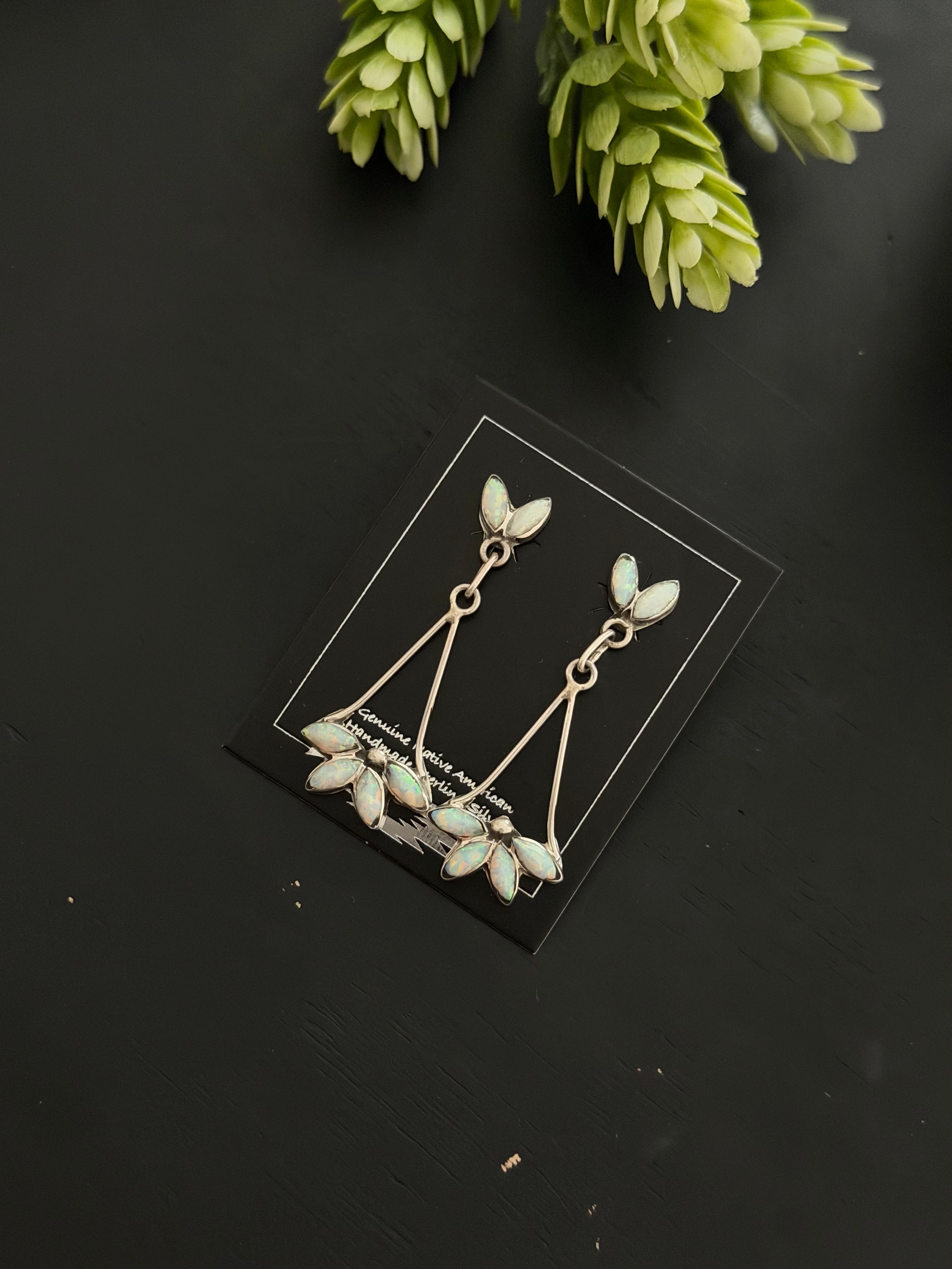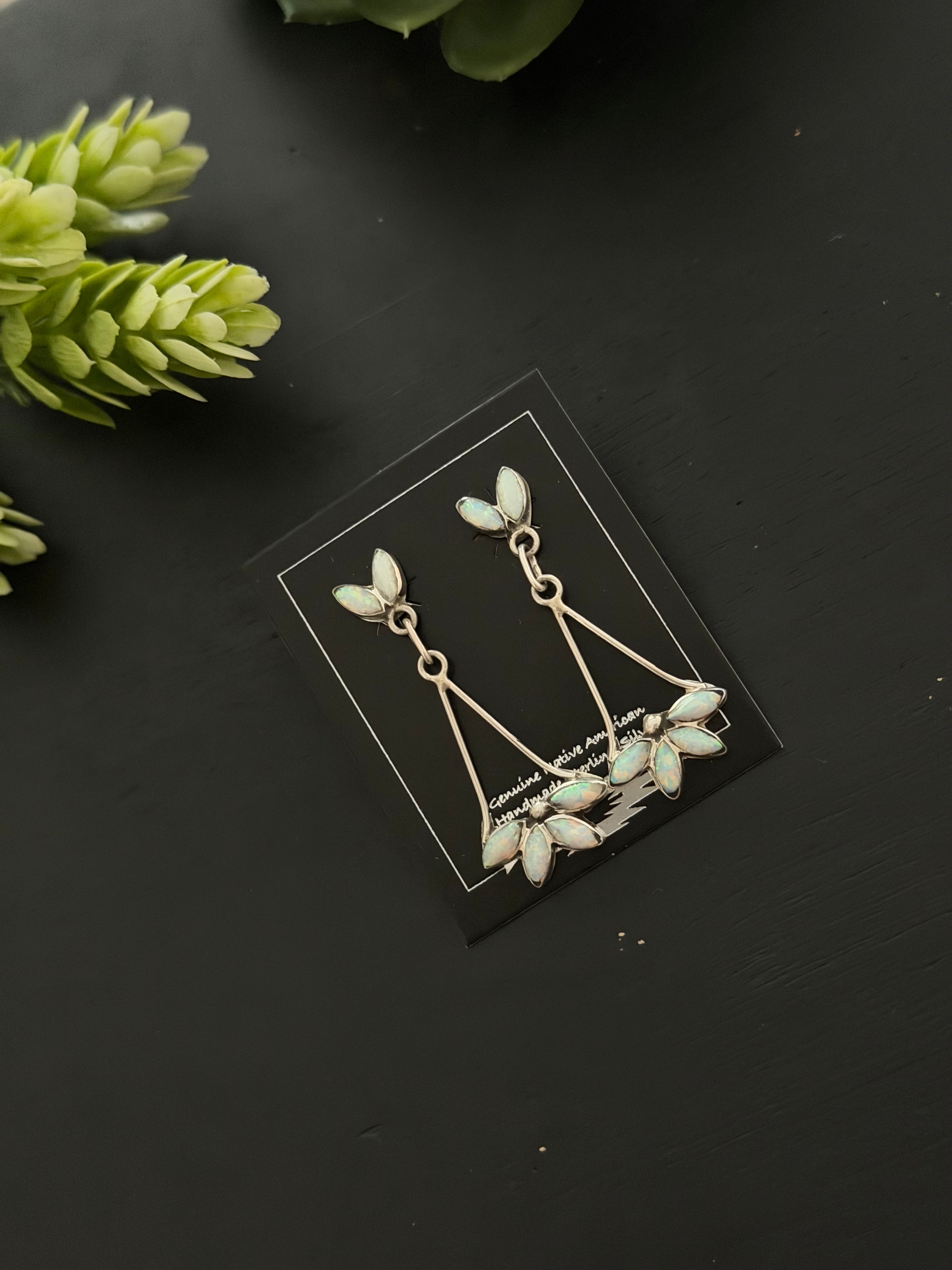Zuni Made Opal (Man Made) & Sterling Silver Post Dangle Earrings. It measures 1 5/8 inches long and just over 5/8 of an inch wide.