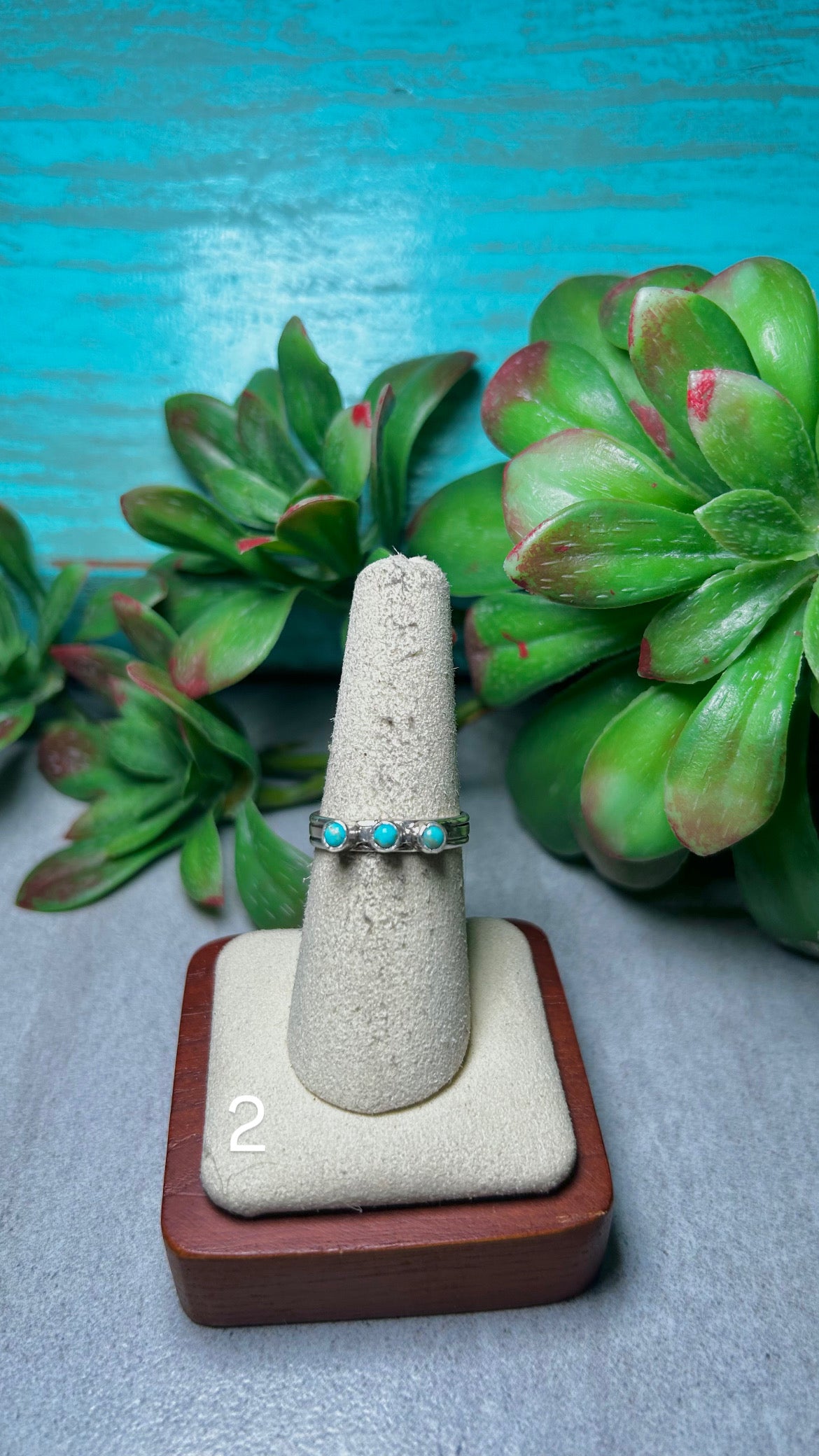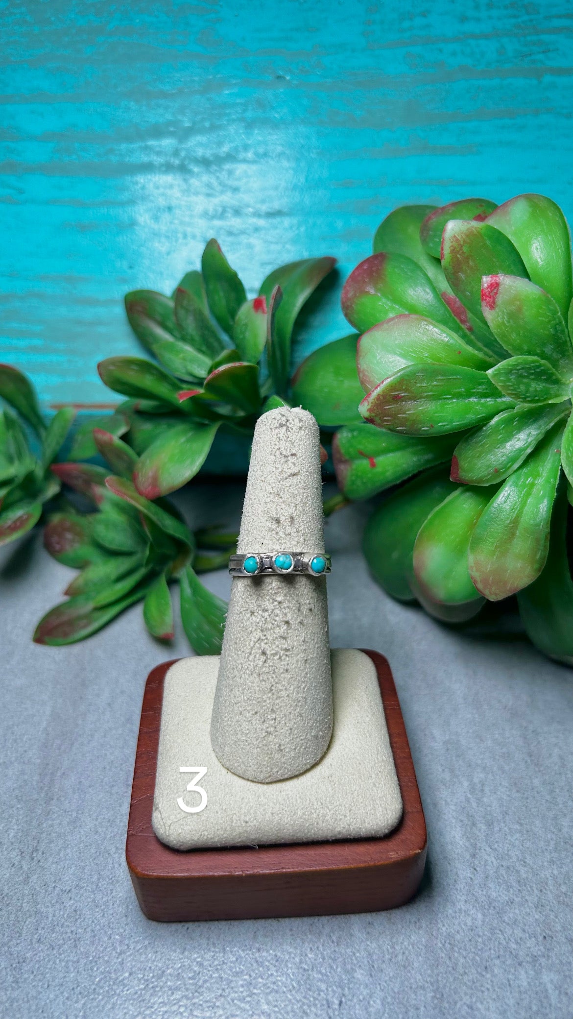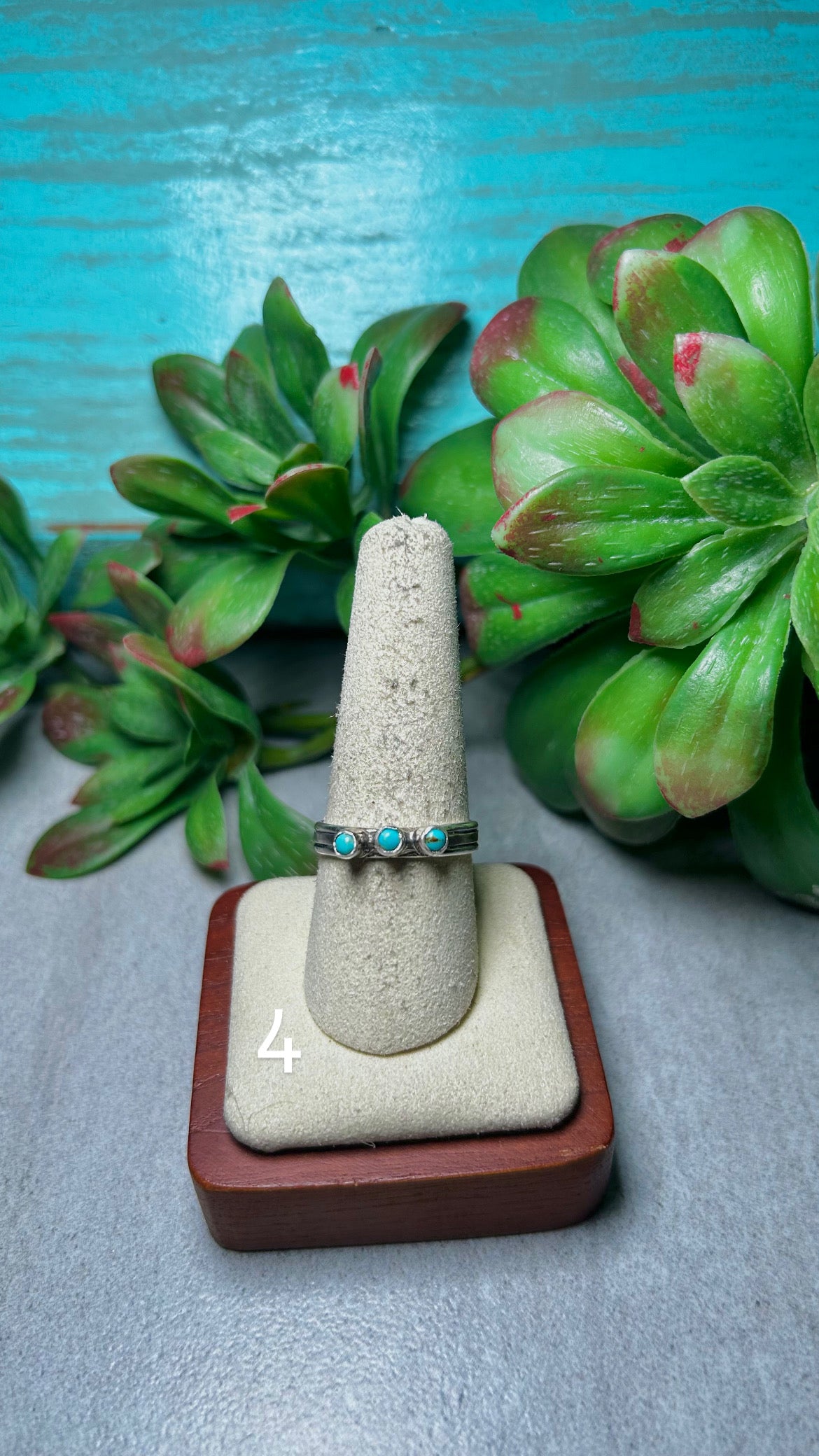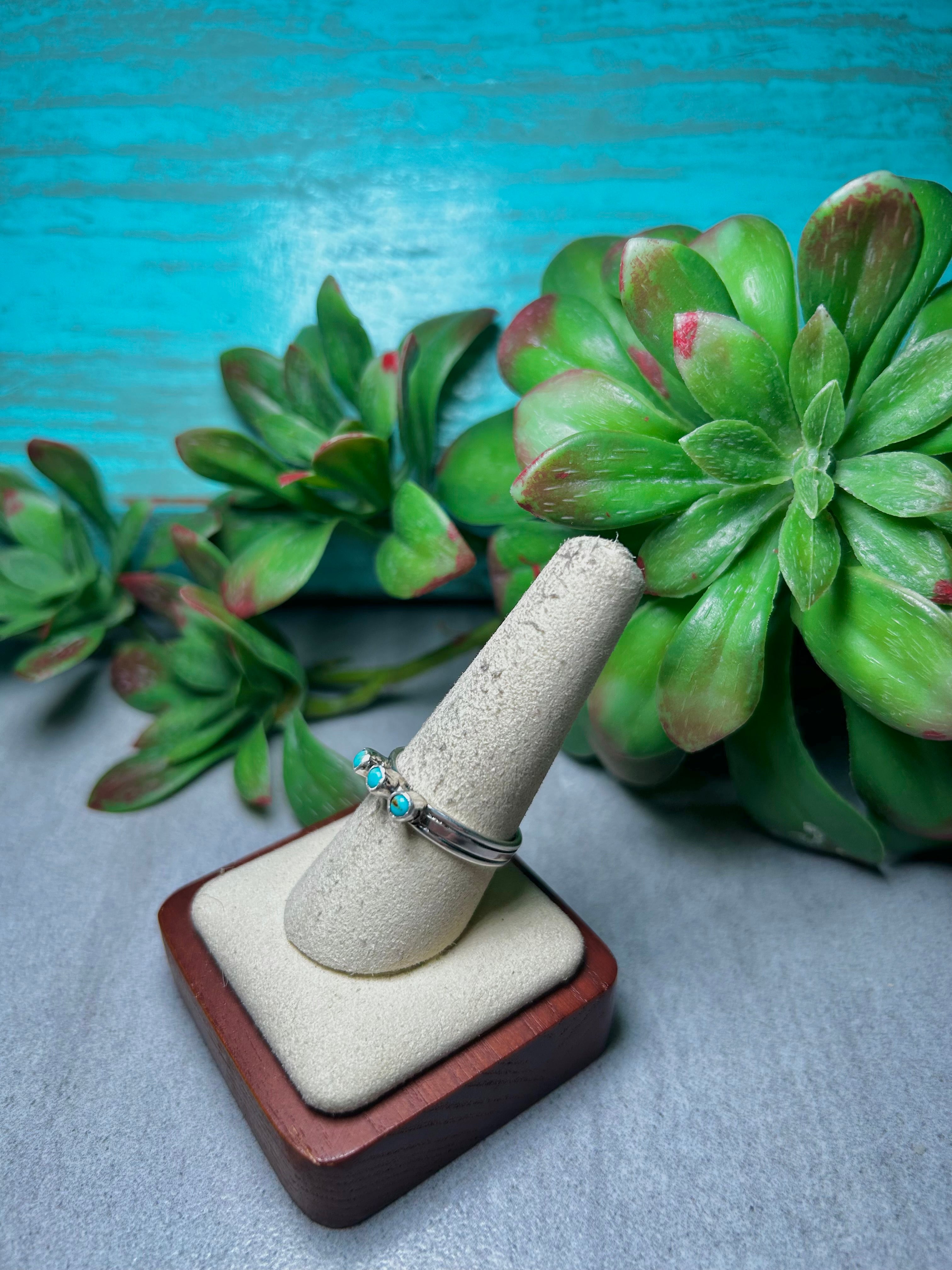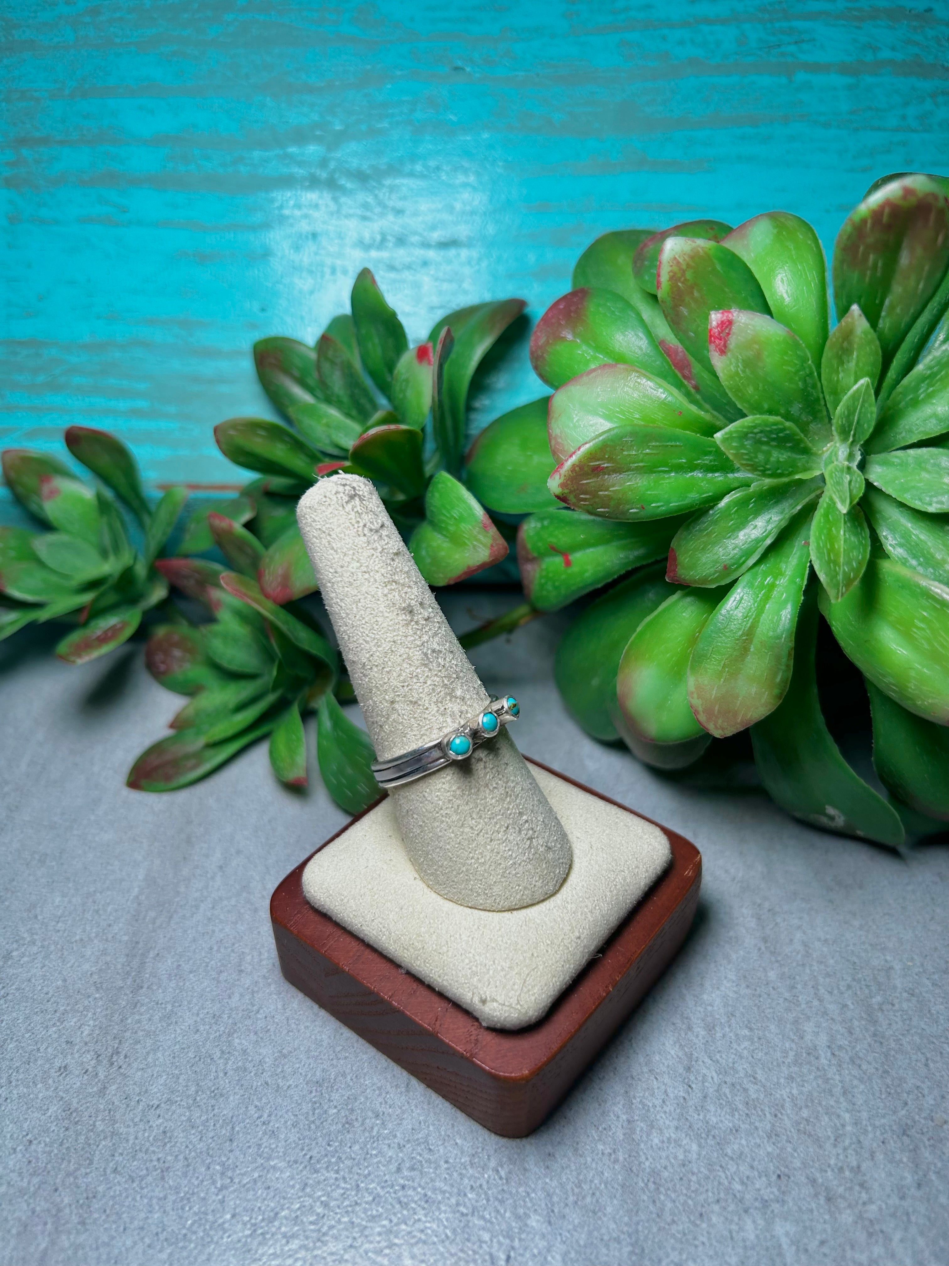 Arlene Lewis Kingman Turquoise & Sterling Silver Cluster Ring. It measures 1/8 of an inch long and 5/8 of an inch wide. Signed by the artist and stamped sterling silver.