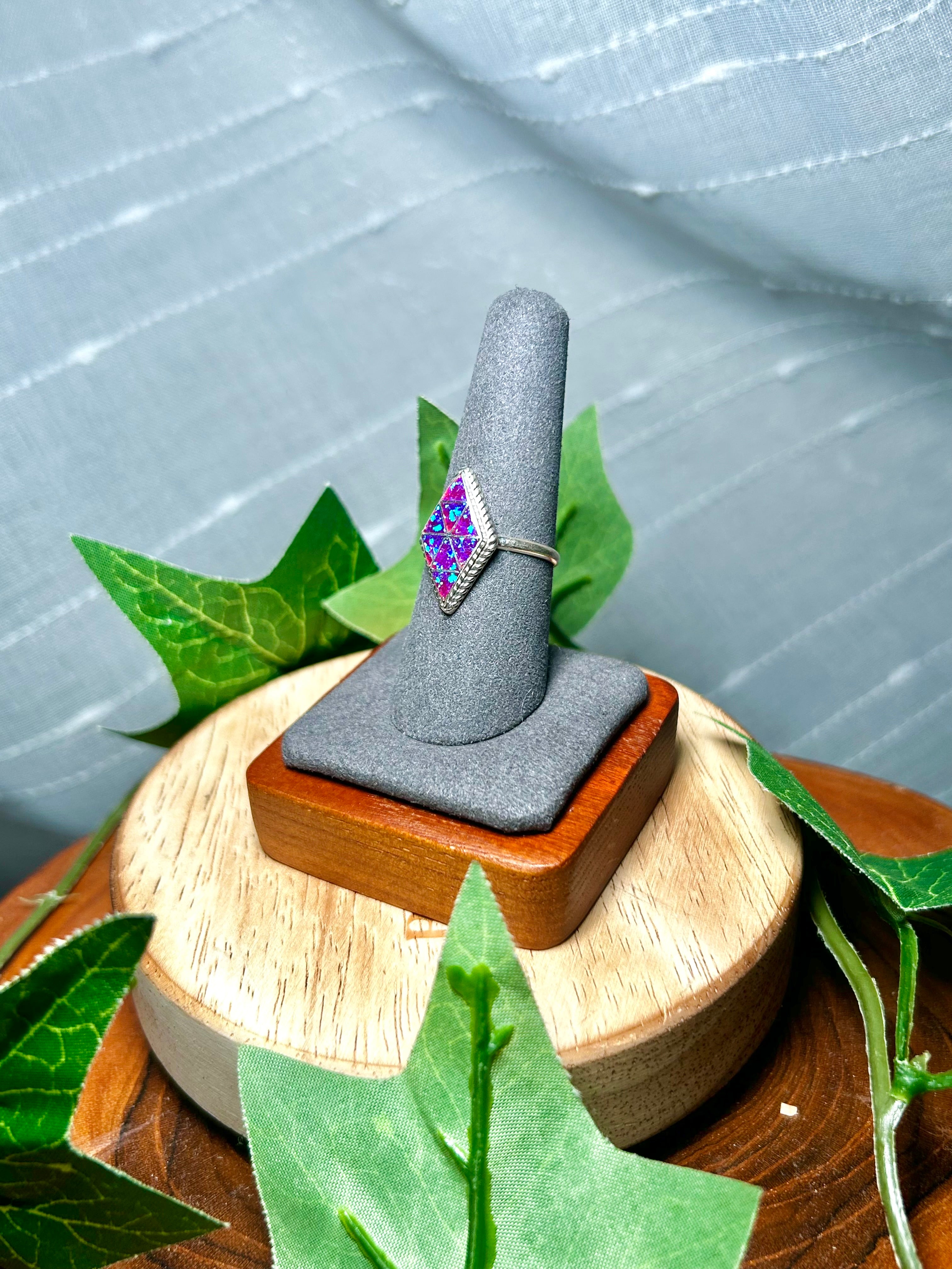 Zuni Made Opal & Sterling Silver Ring Size 9. It measures 7/8 of an inch long and 1/2 of an inch wide. Signed by the artist and stamped sterling silver.