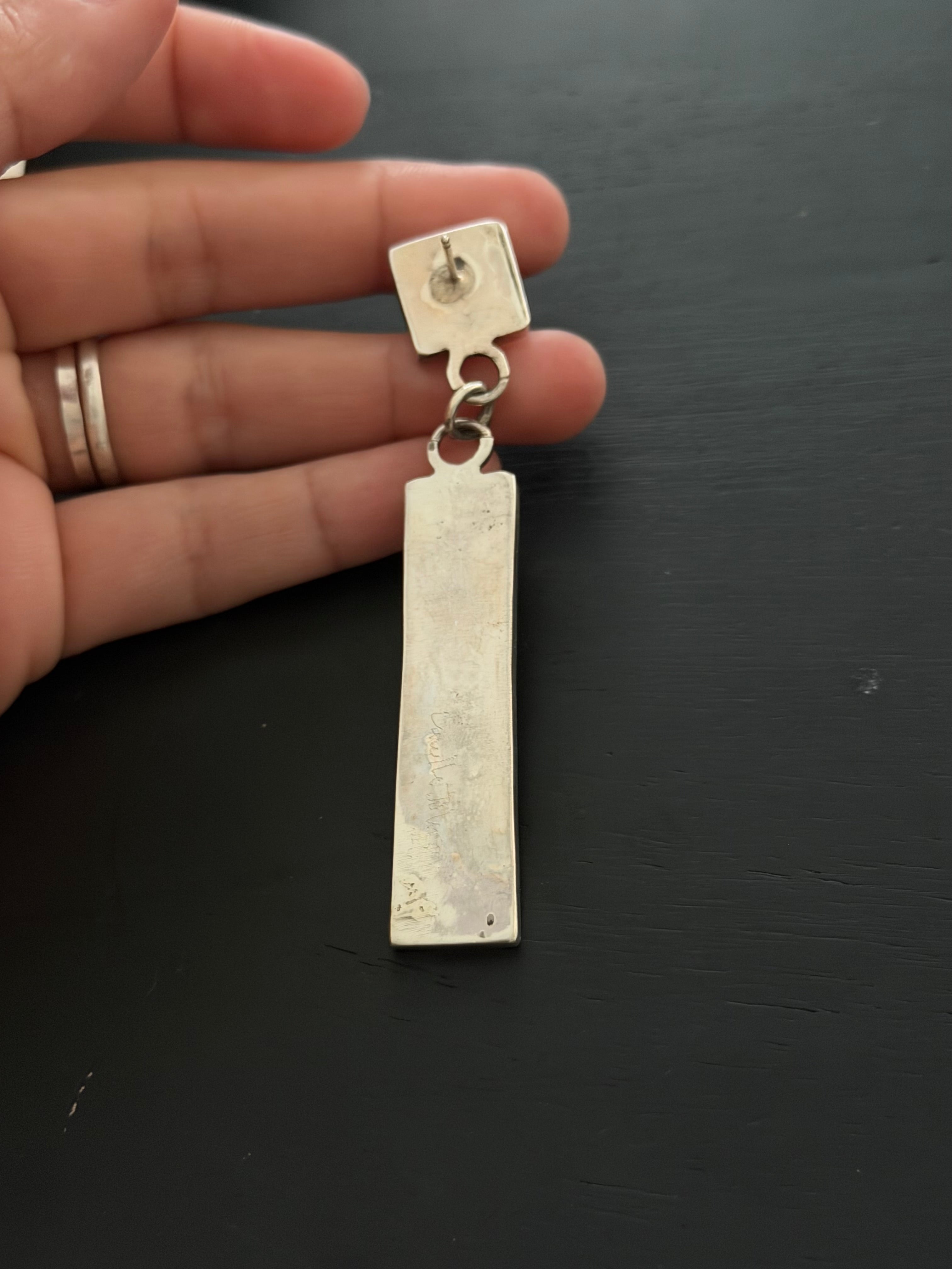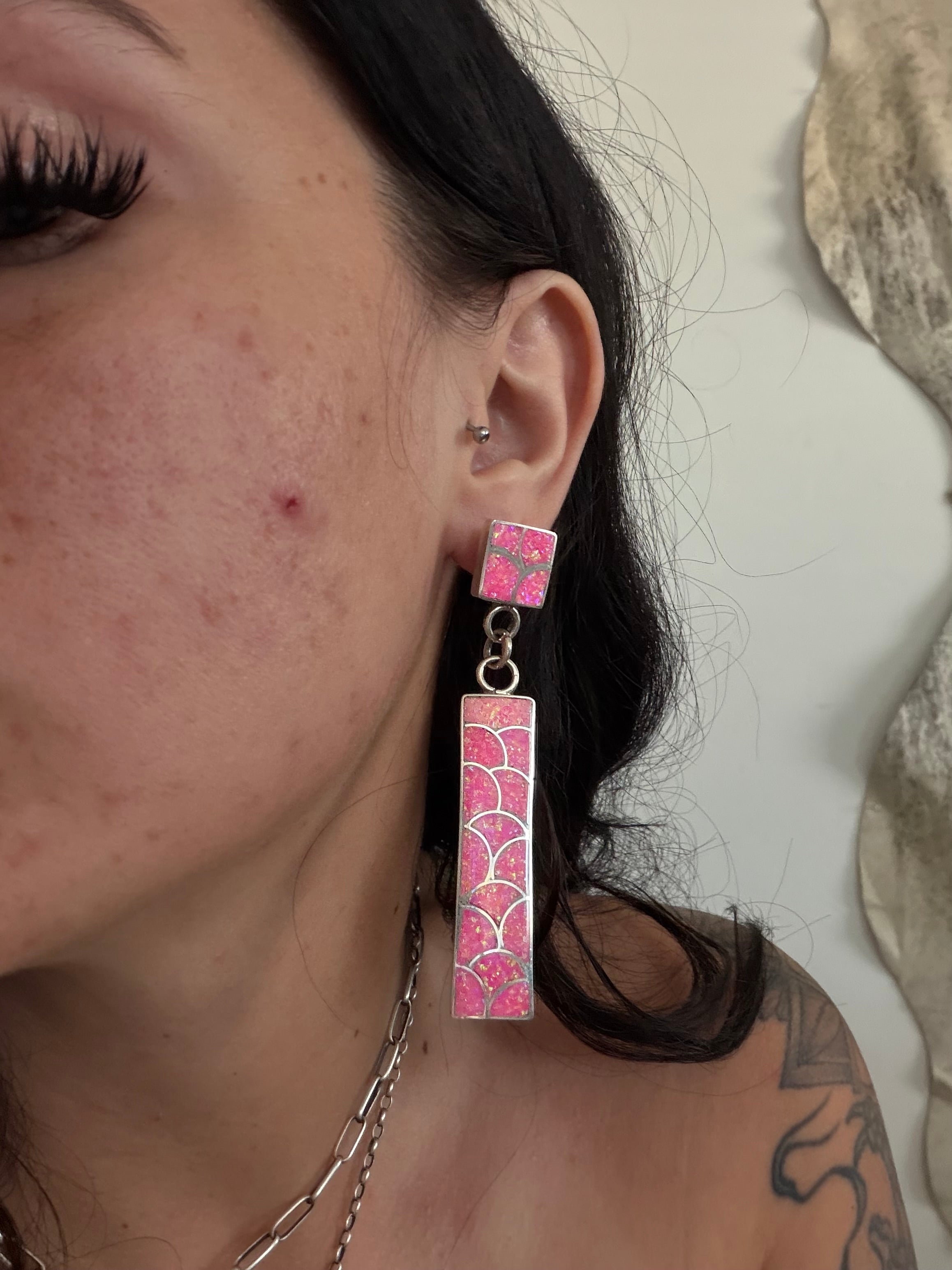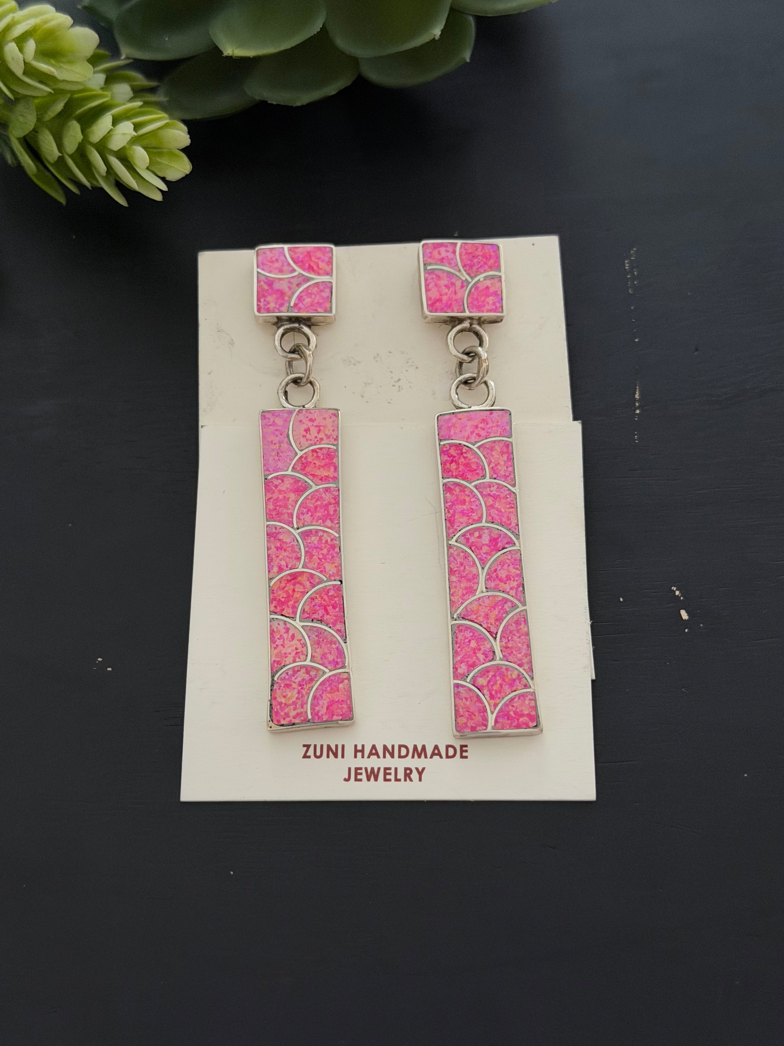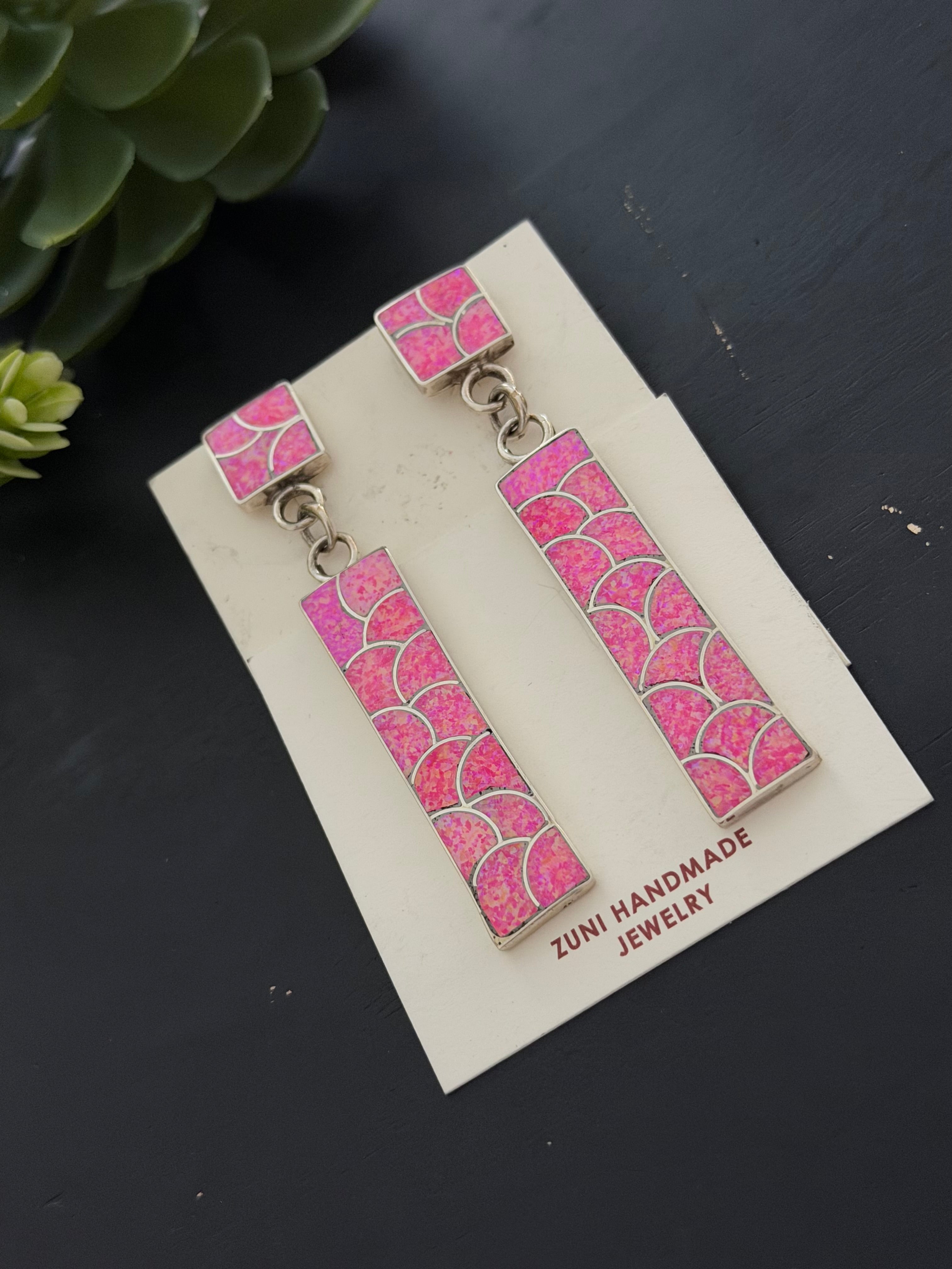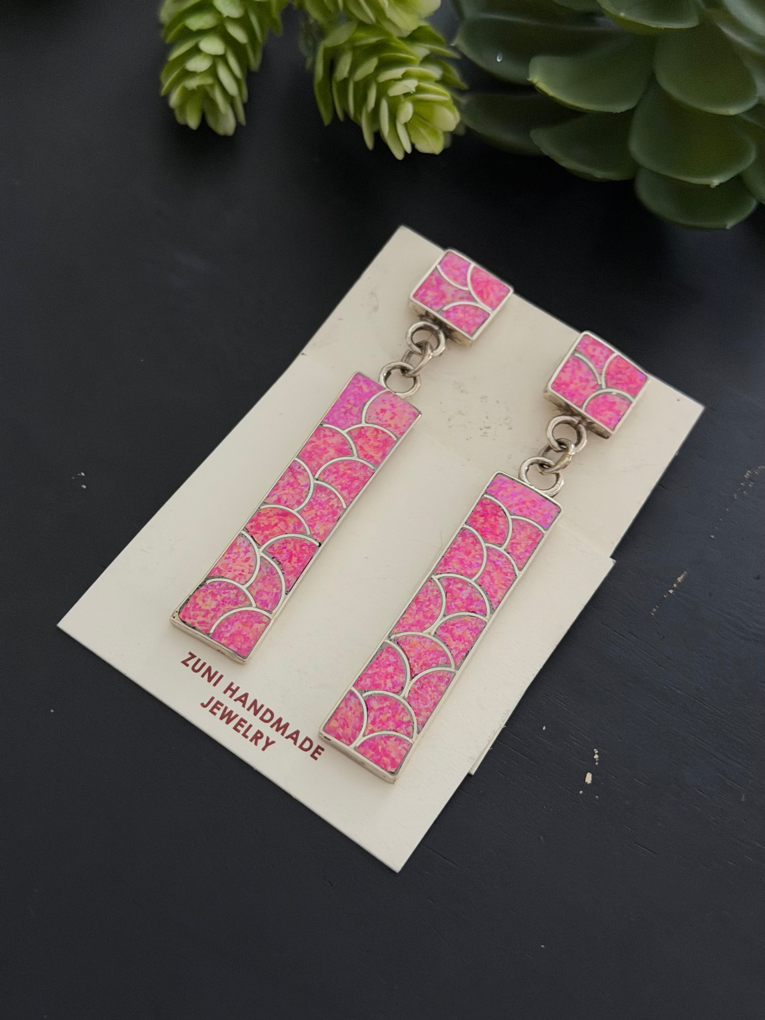 Zuni Made Pink Opal(Man-Made) & Sterling Silver Post Dangle Inlay Earrings. It measures 3 1/4 inches long and just under 5/8 of an inch wide. Signed by artist and stamped sterling silver.