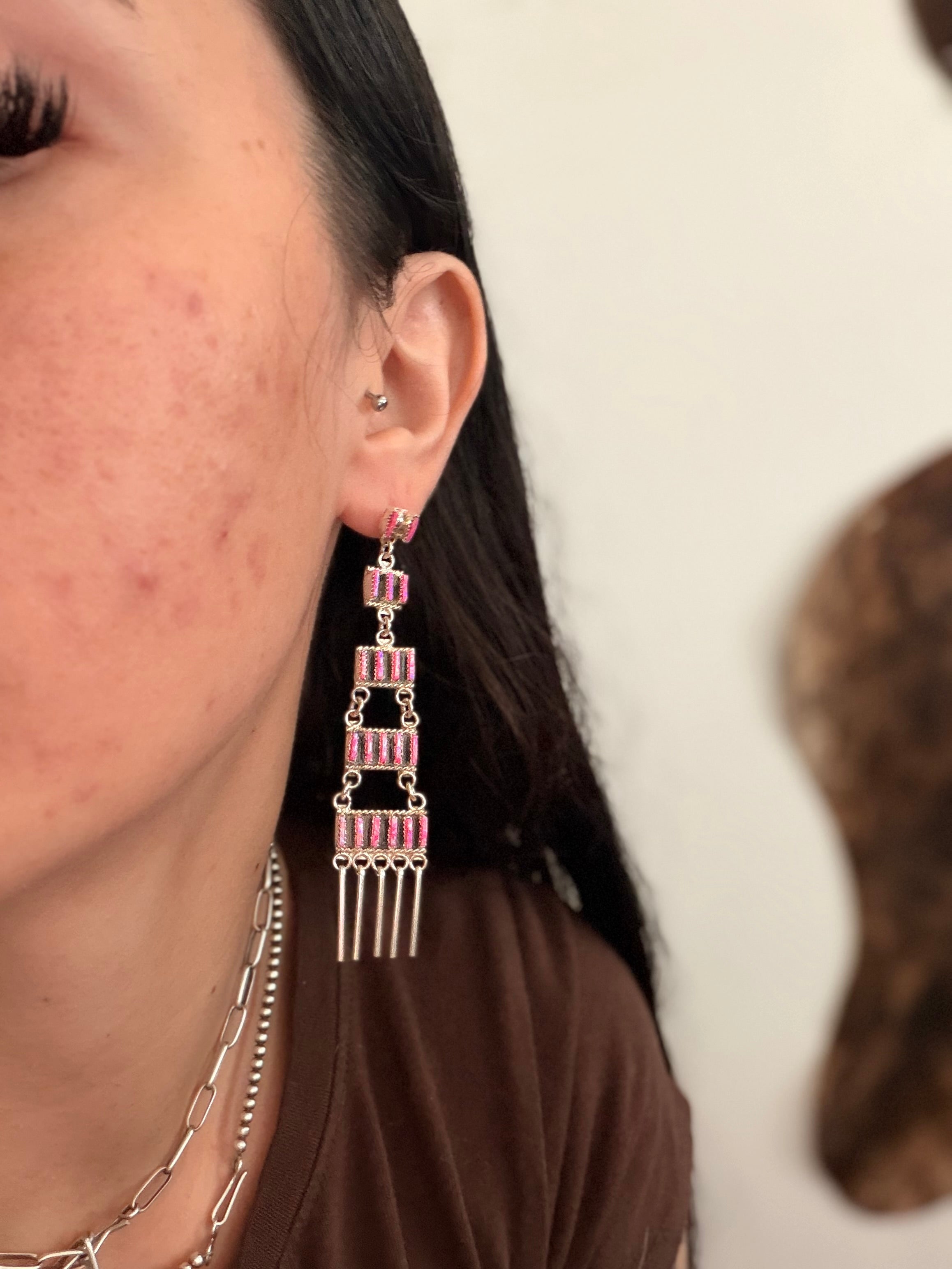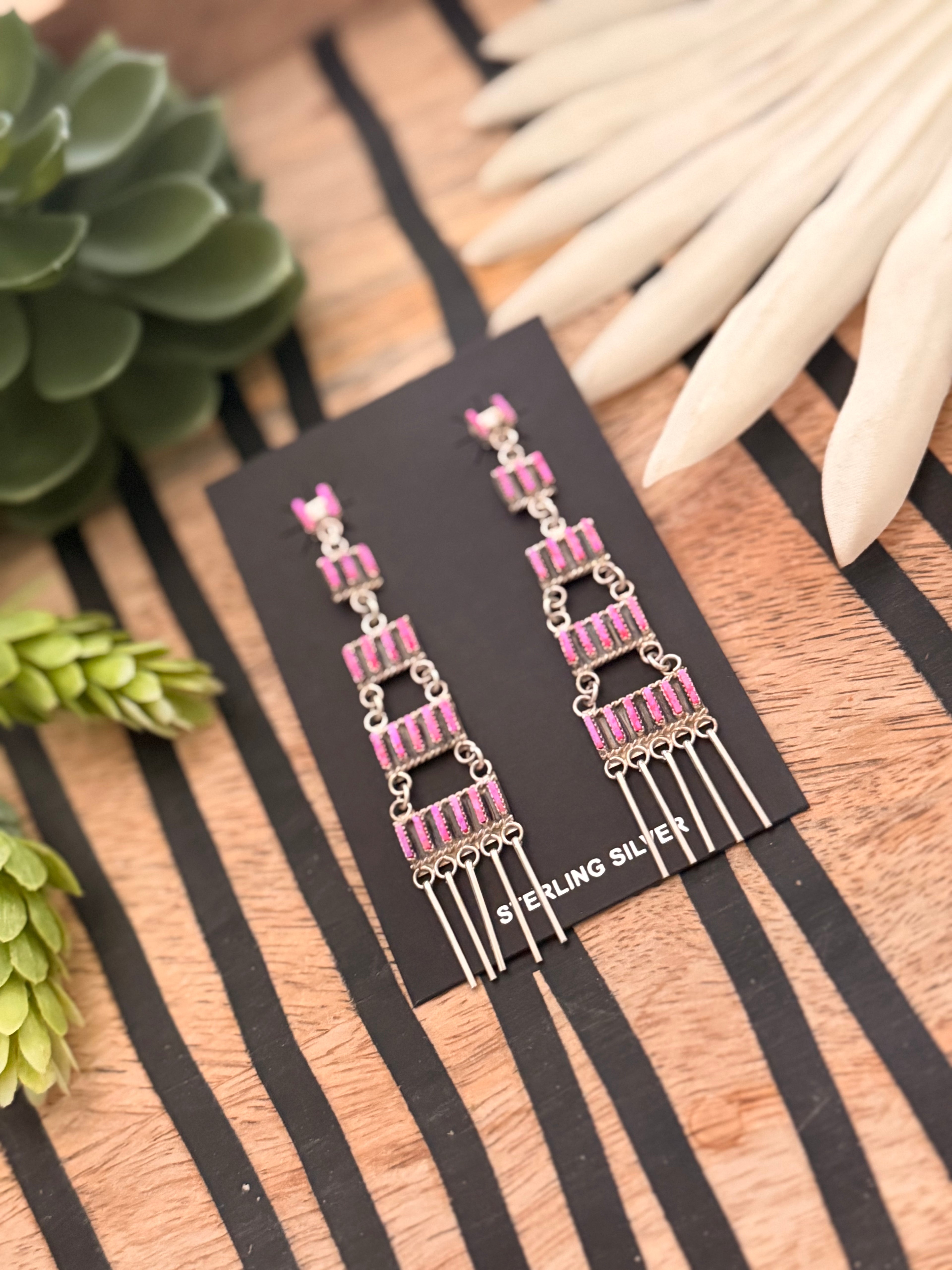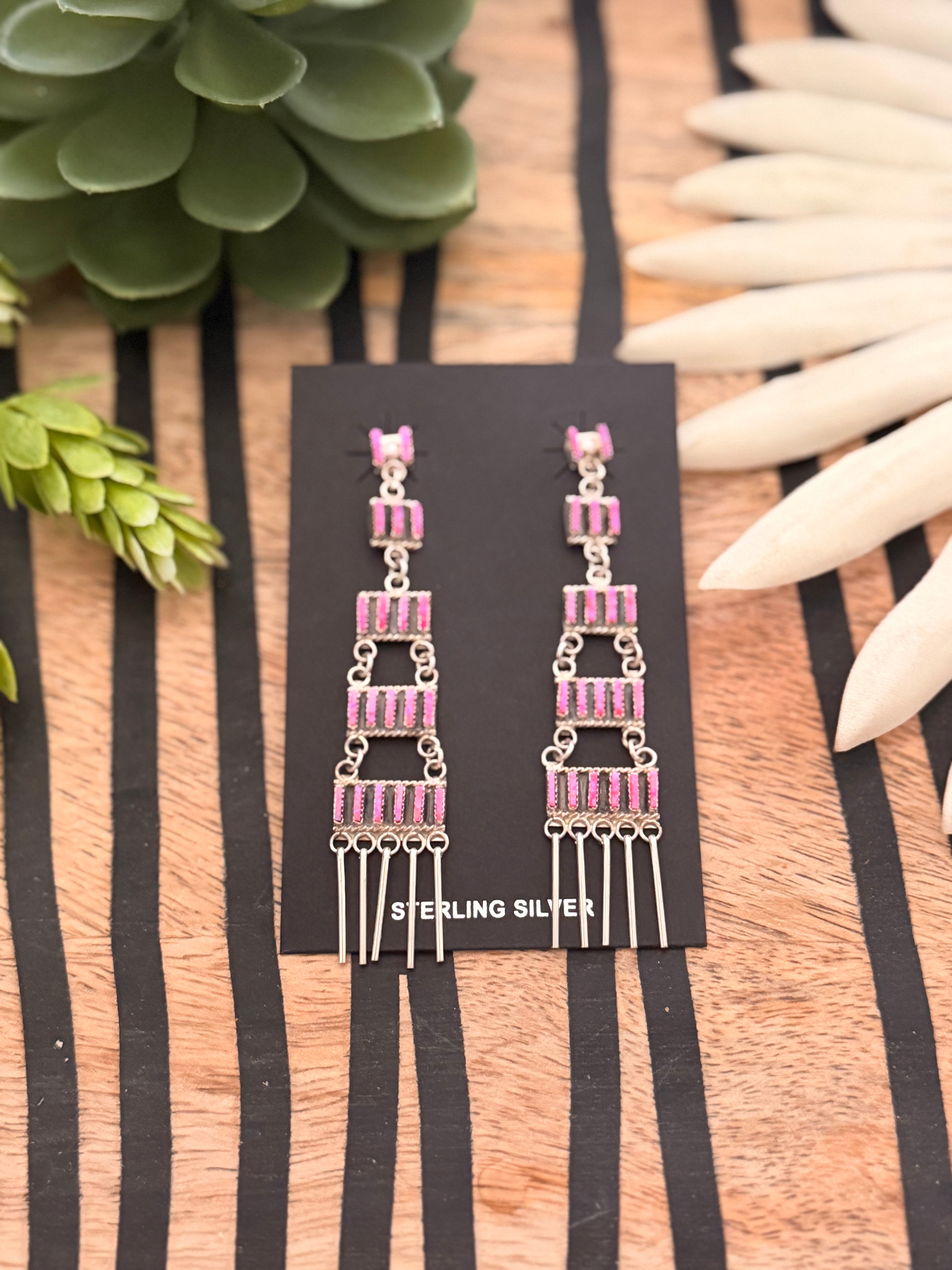 Zuni Made Pink Opal(Man-Made) & Sterling Silver Post Dangle Cluster Earrings. It measures 3 1/8 inches long and just under 5/8 of an inch wide. Signed by artist and stamped sterling silver.