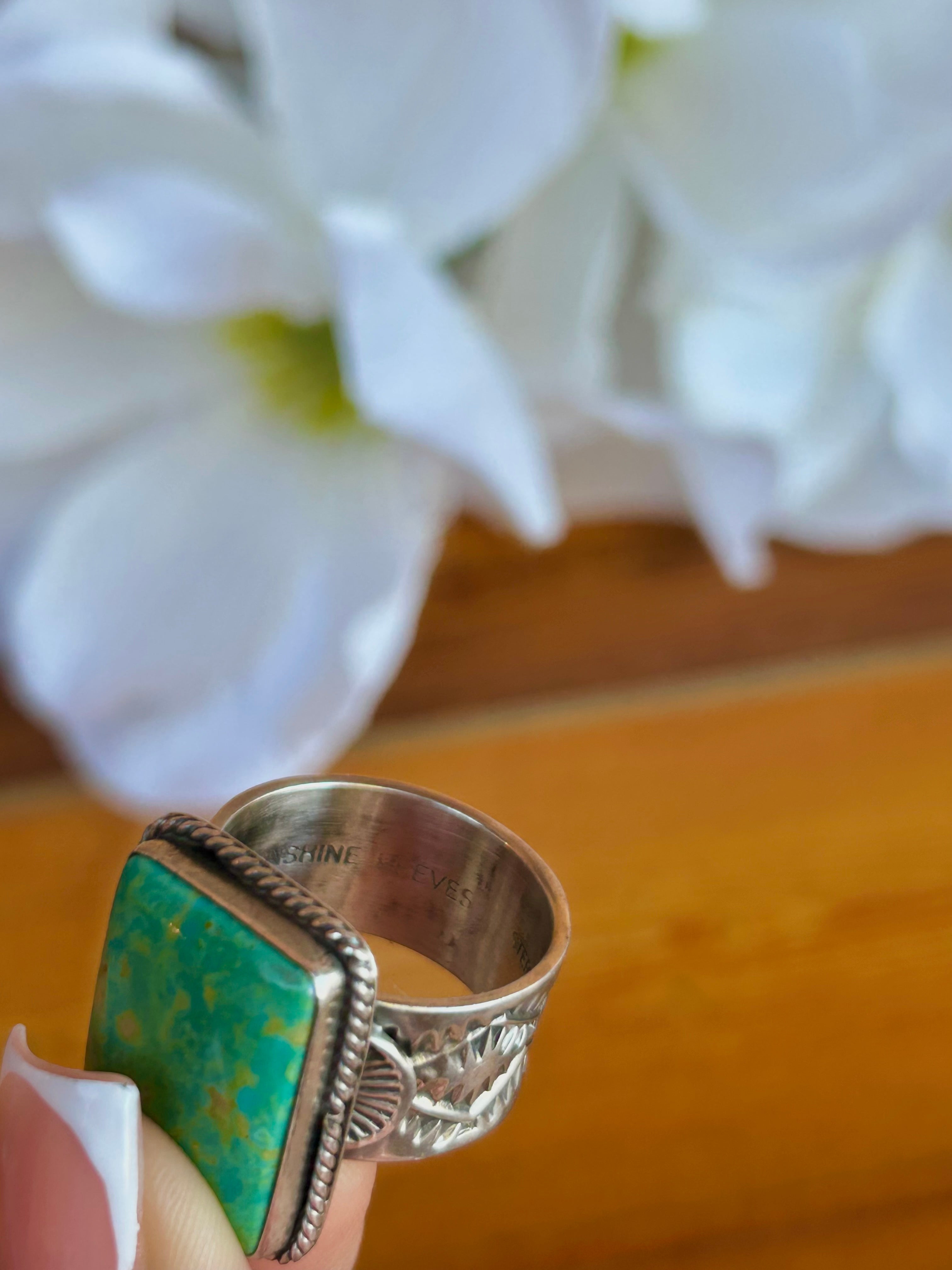 Sunshine Reeves Kingman Turquoise & Sterling Silver Ring Size 10.25. It measures 7/8 of an inch long and 3/4 of an inch wide. Signed by the artist and stamped sterling silver.