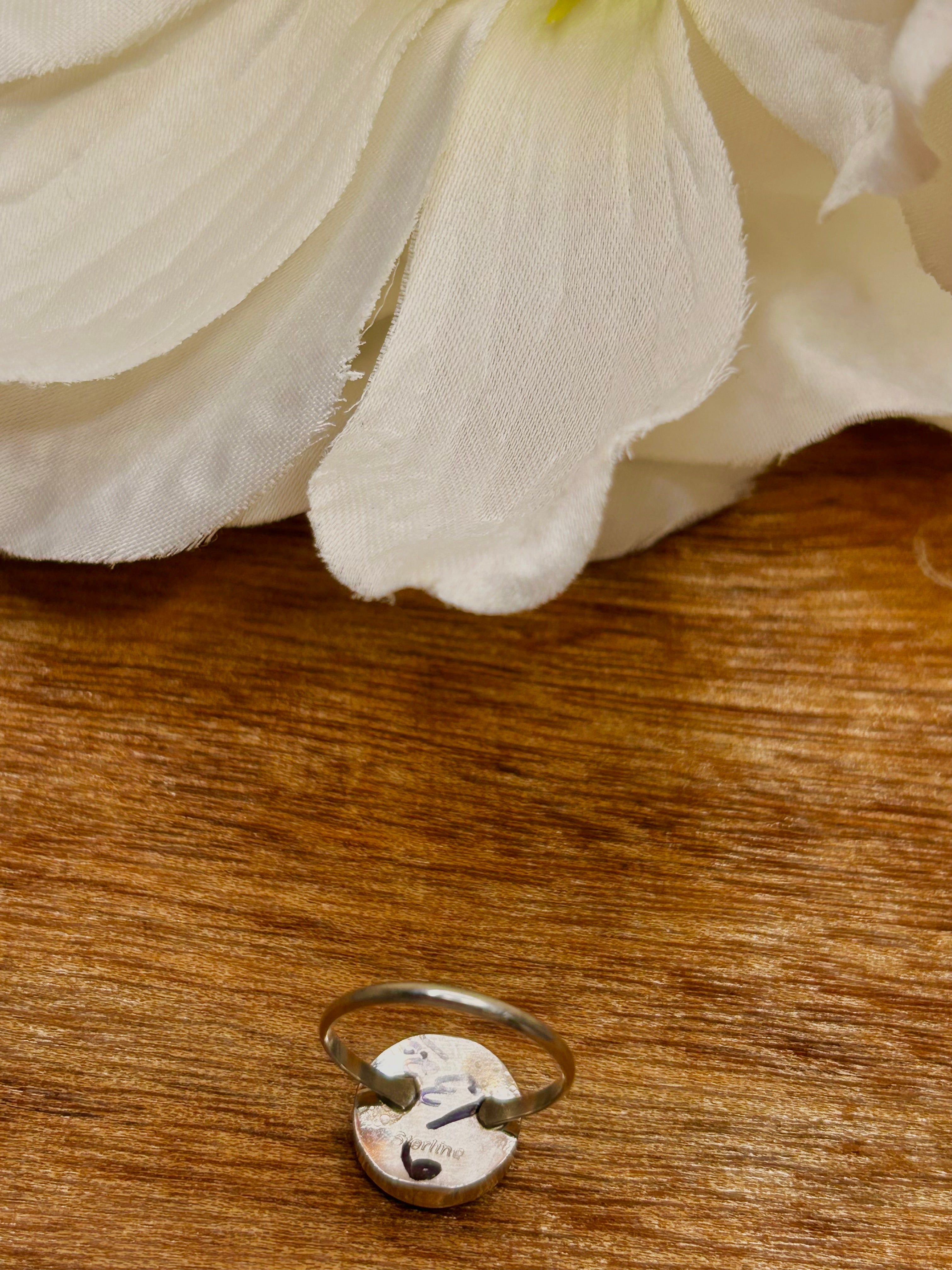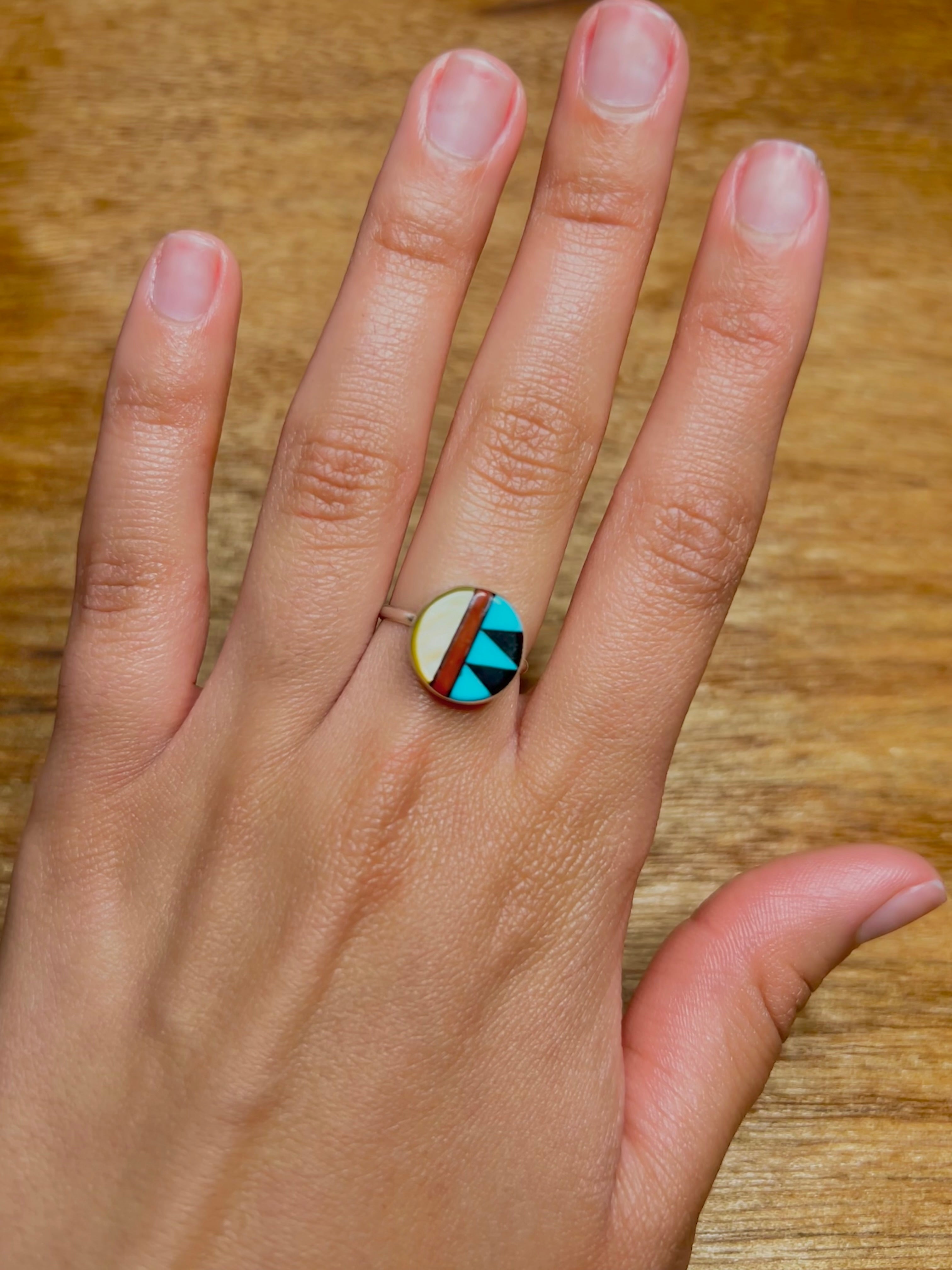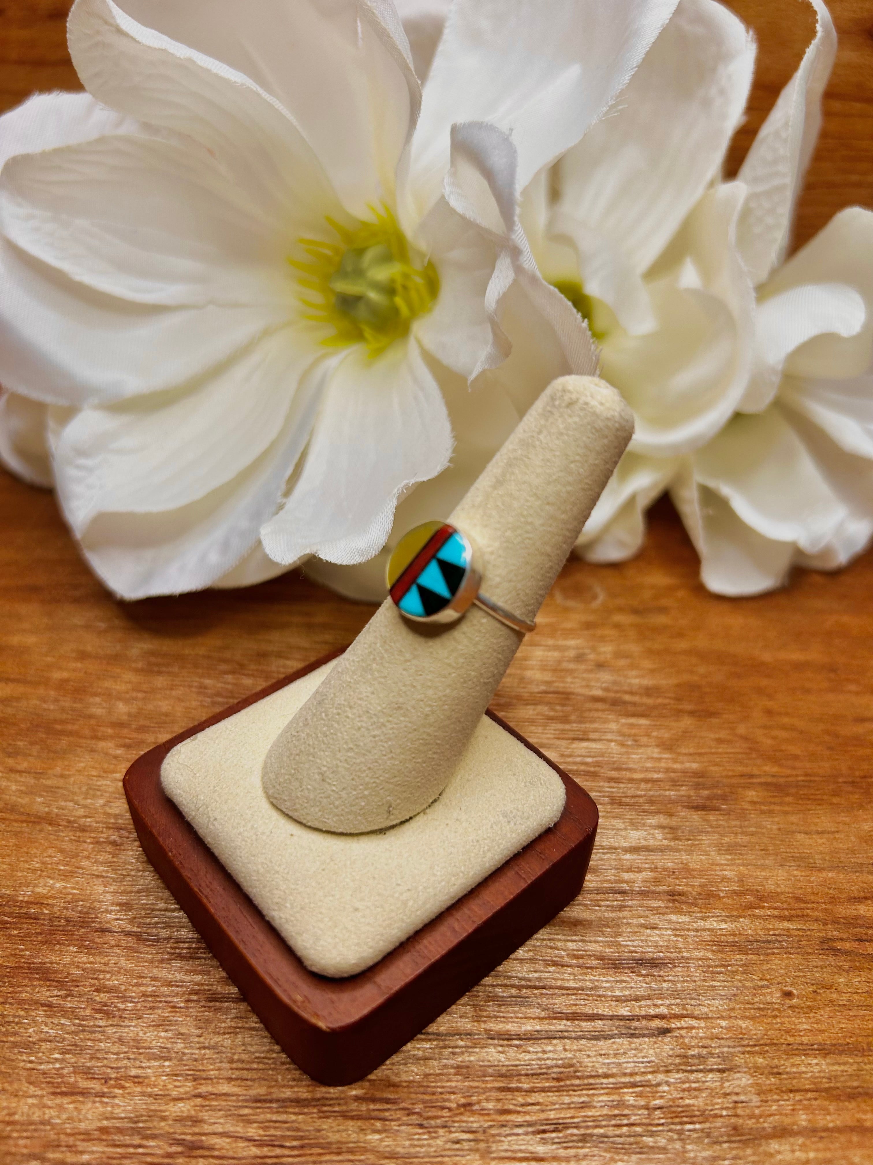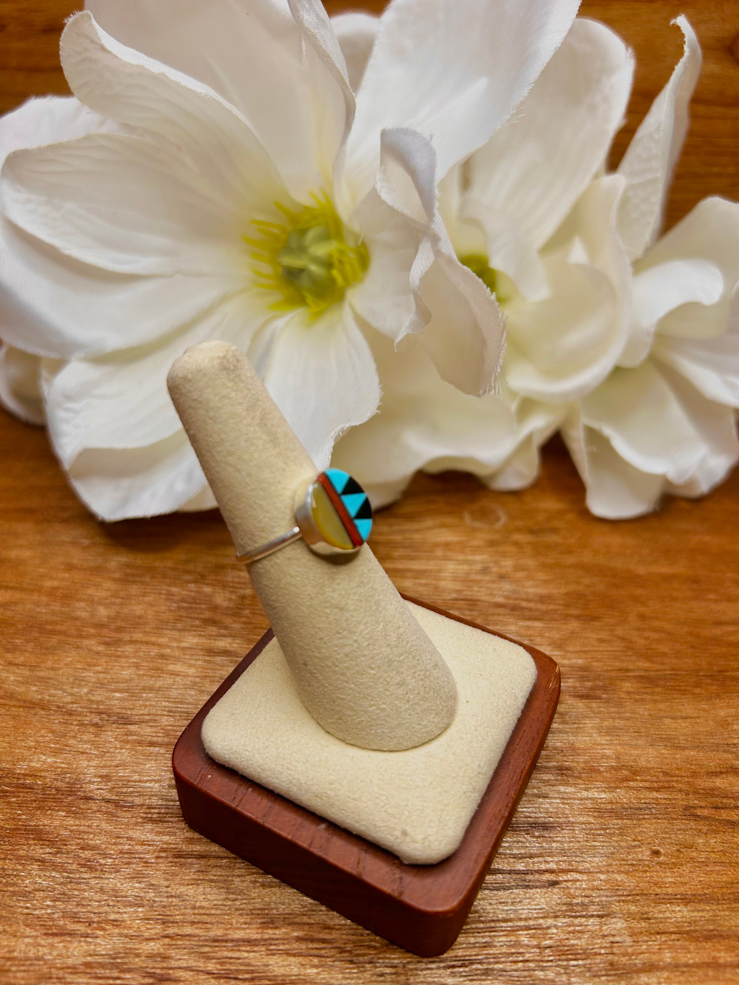 Zuni Navajo Made Multi Stone Inlay & Sterling Sliver Cluster Ring Size 6. It measures 1/2 of an inch long and 1/2 of an inch wide. Signed by the artist and stamped sterling silver.