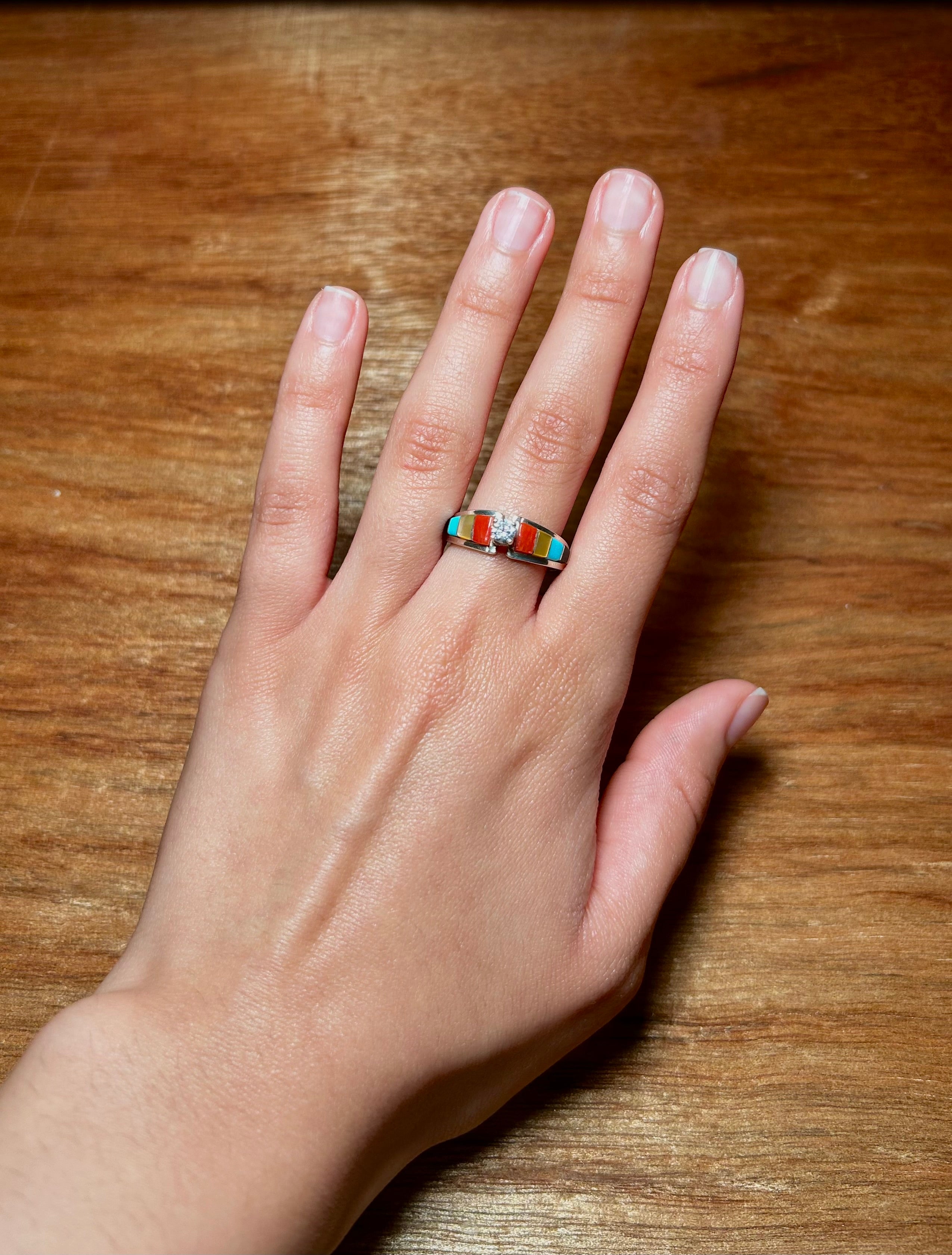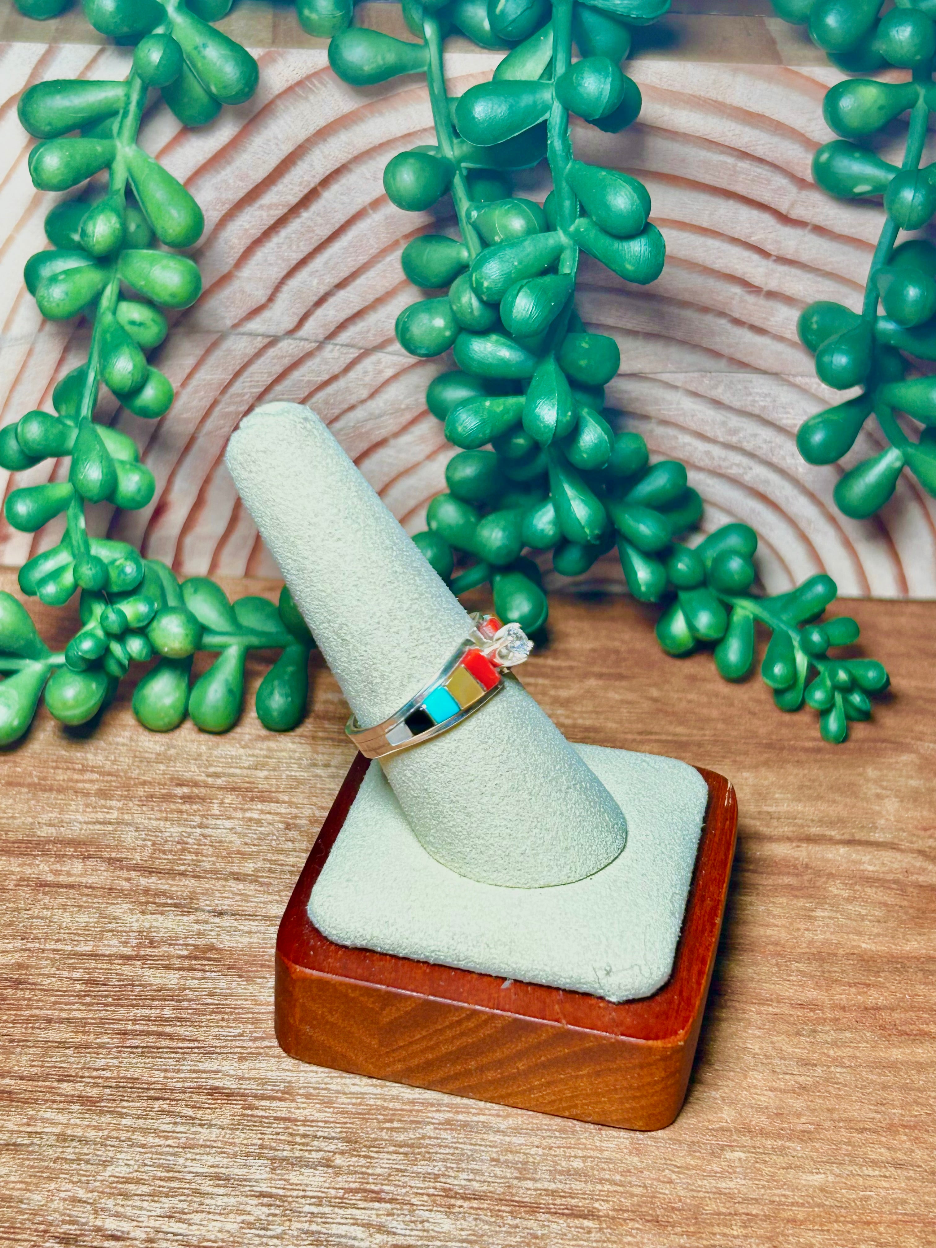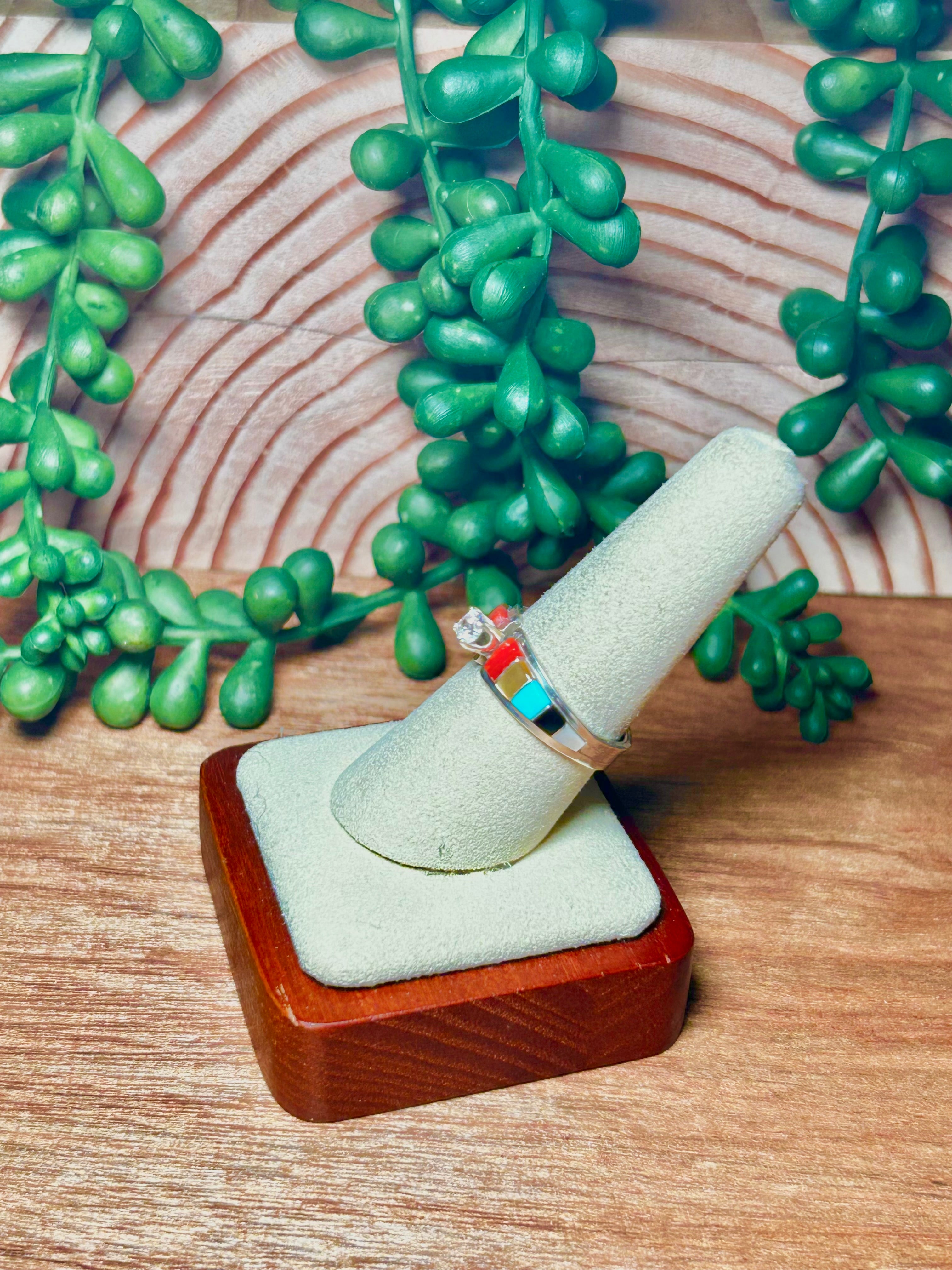 Zunni Made Multi Stone & Sterling Silver Cubic Circunia Ring Size 6. It measures 3/8 of an inch long and 7/8 of an inch wide. Signed by the artist and stamped sterling silver.