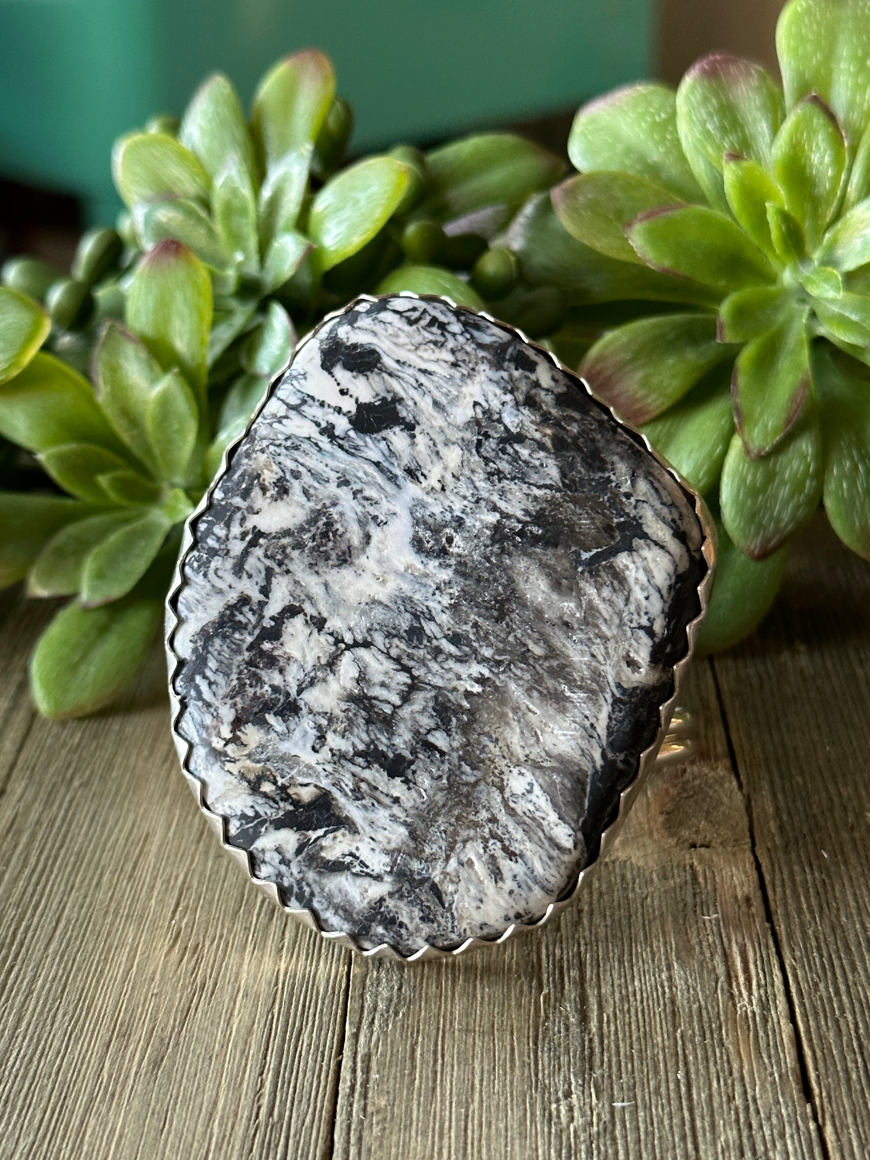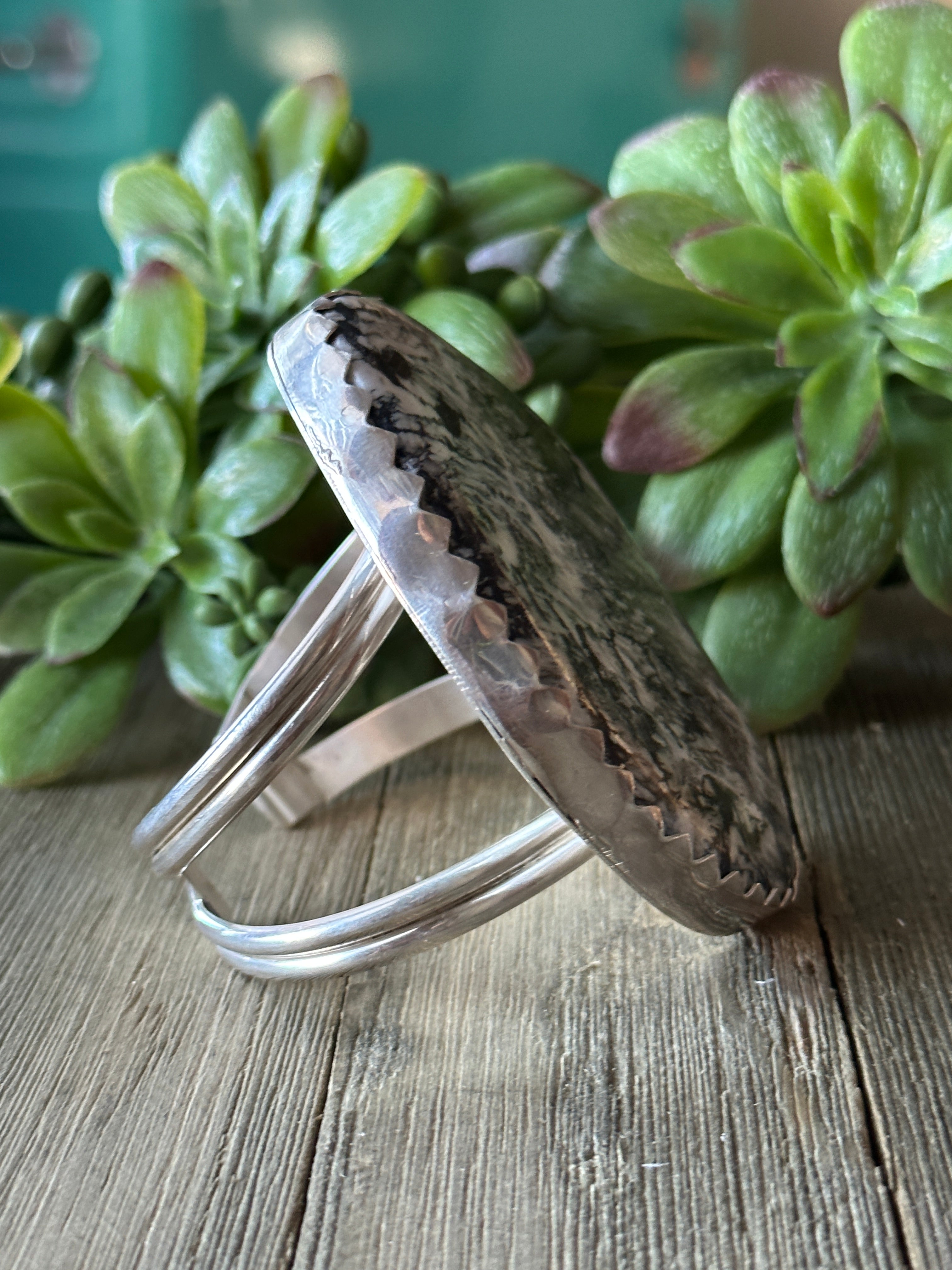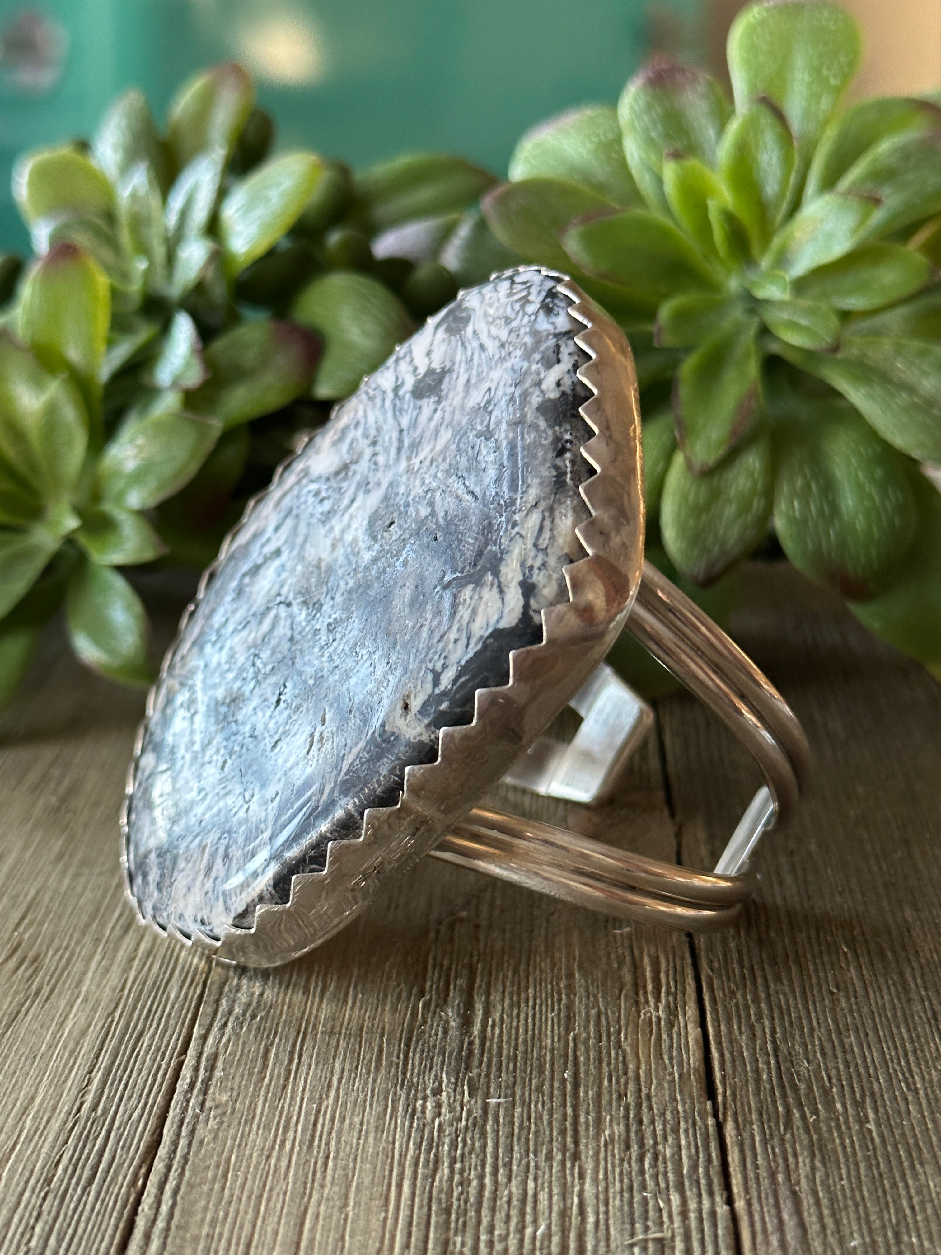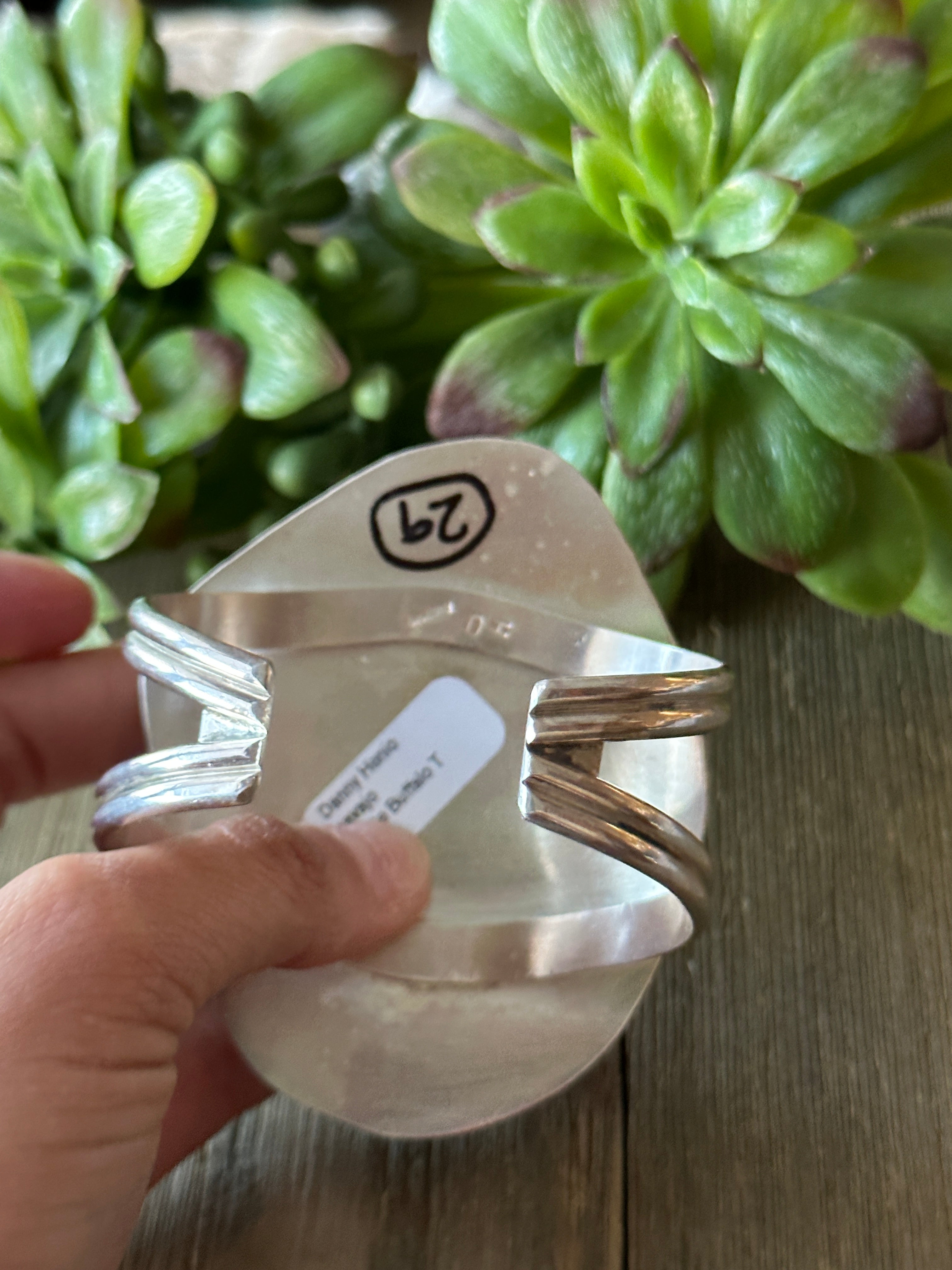 Danny Henio White Buffalo & Sterling Silver Cuff Bracelet. It measures 3 1/4 inches wide with an inside circumference of 5 3/4 inches and a gap of 1 inch. Signed by the artist and stamped sterling silver.