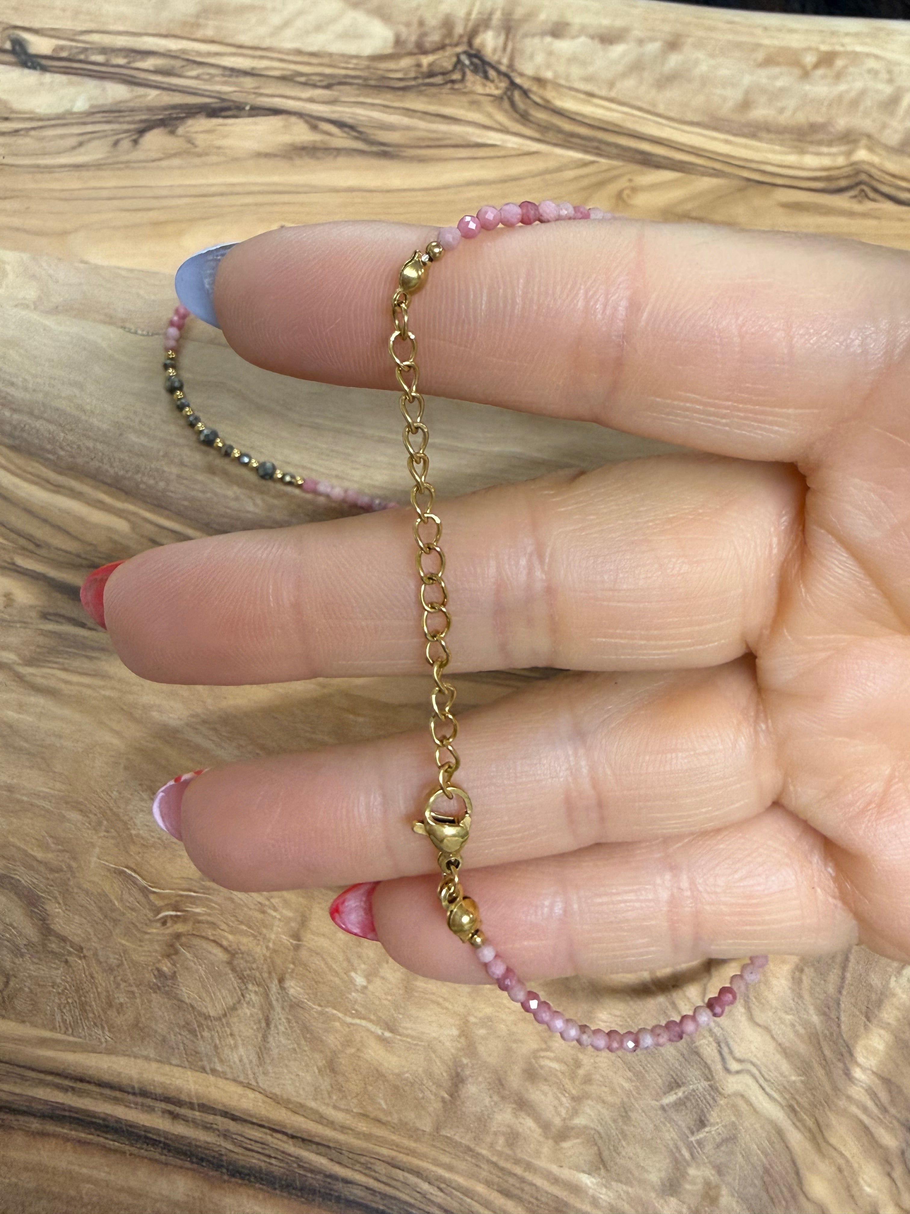 Eileen Quezada Non-Native Watermelon Tourmaline & 14k Gold Plated Sterling Silver Beaded Necklace. It measures from end to end 15” to 17” inches.
