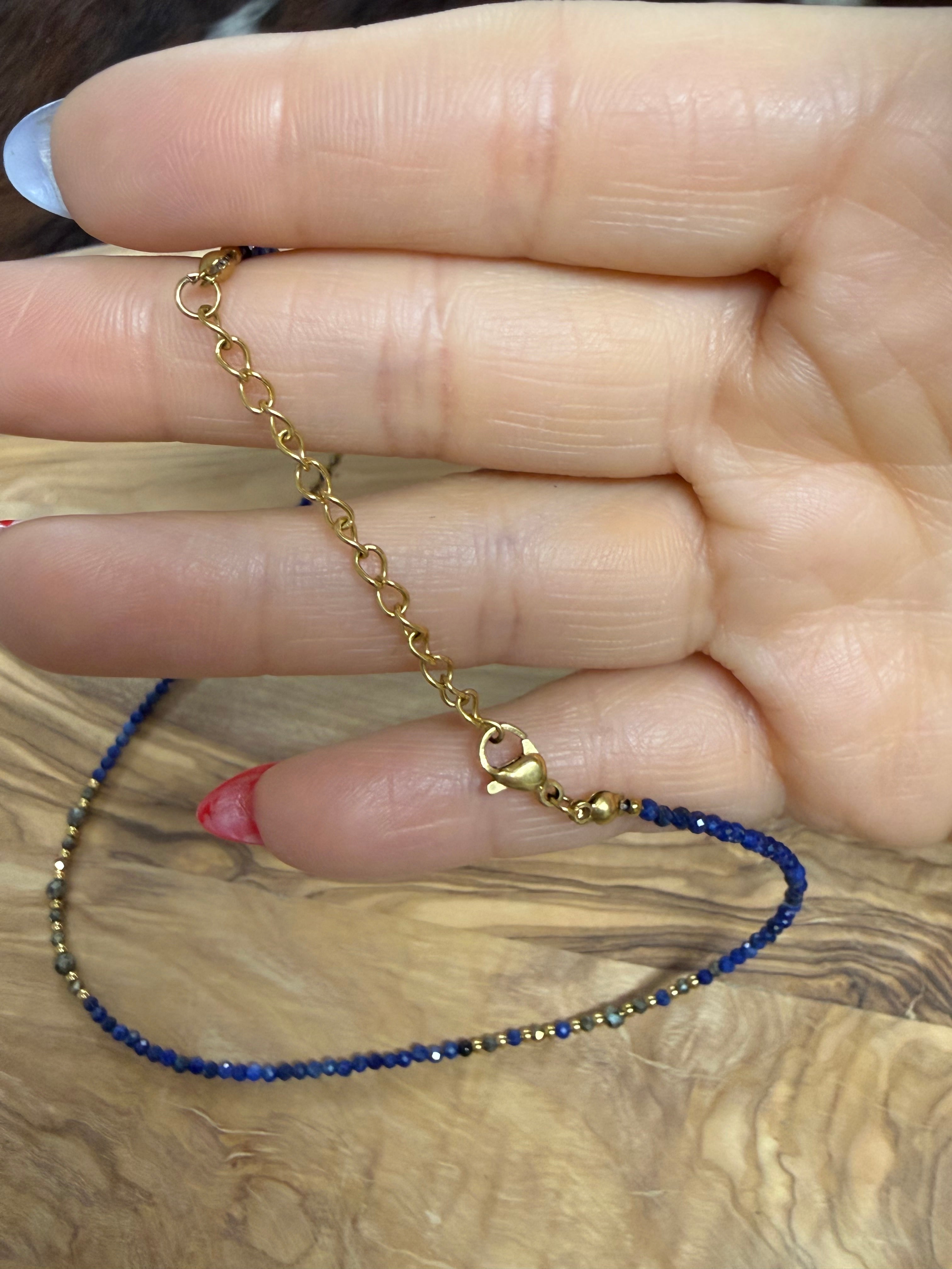 Eileen Quezada Non-Native Blue Lapis & 14k Gold Plated Sterling Silver Beaded Necklace. It measures from end to end 14 1/2” to 16 1/2” inches.
