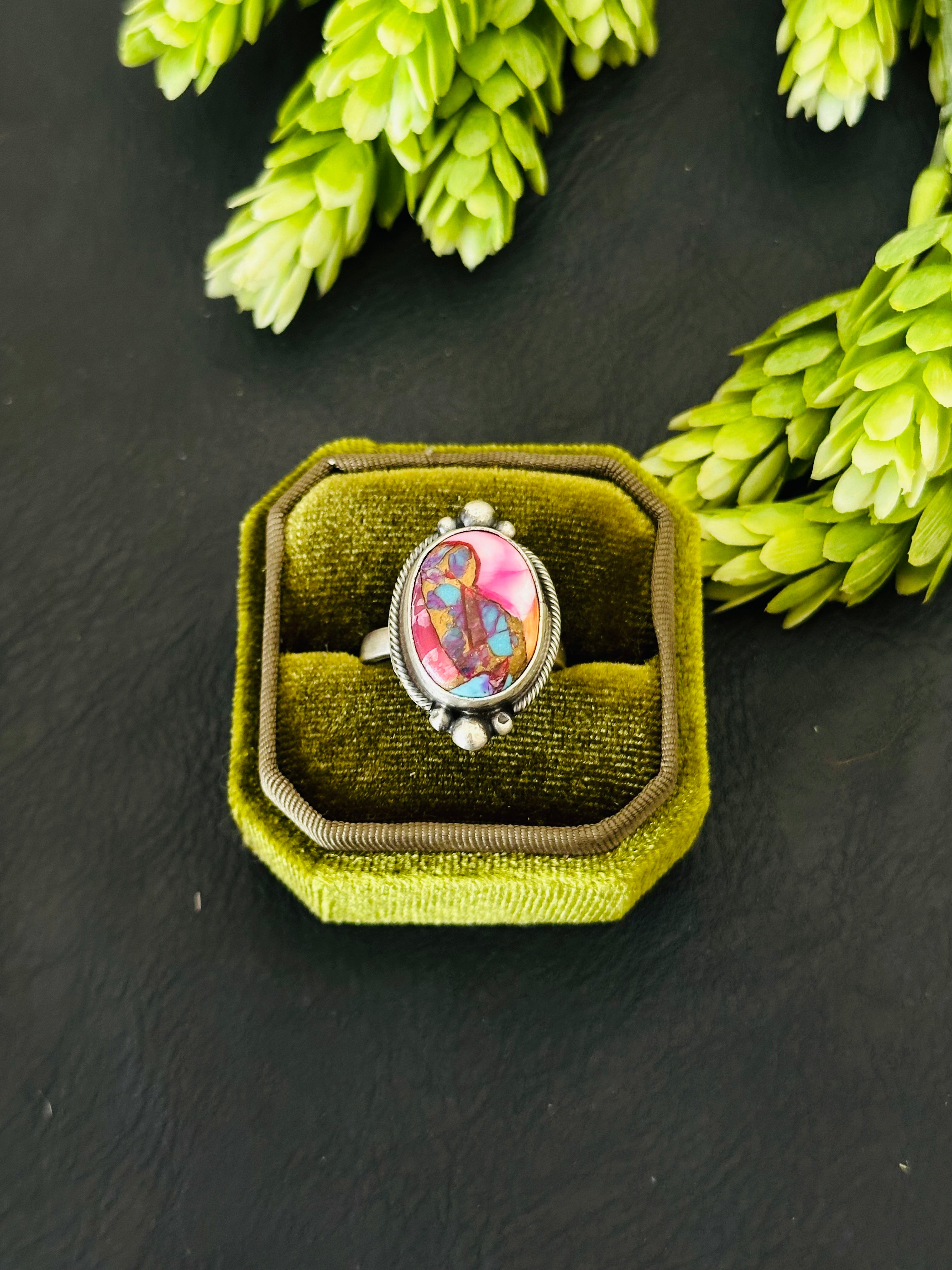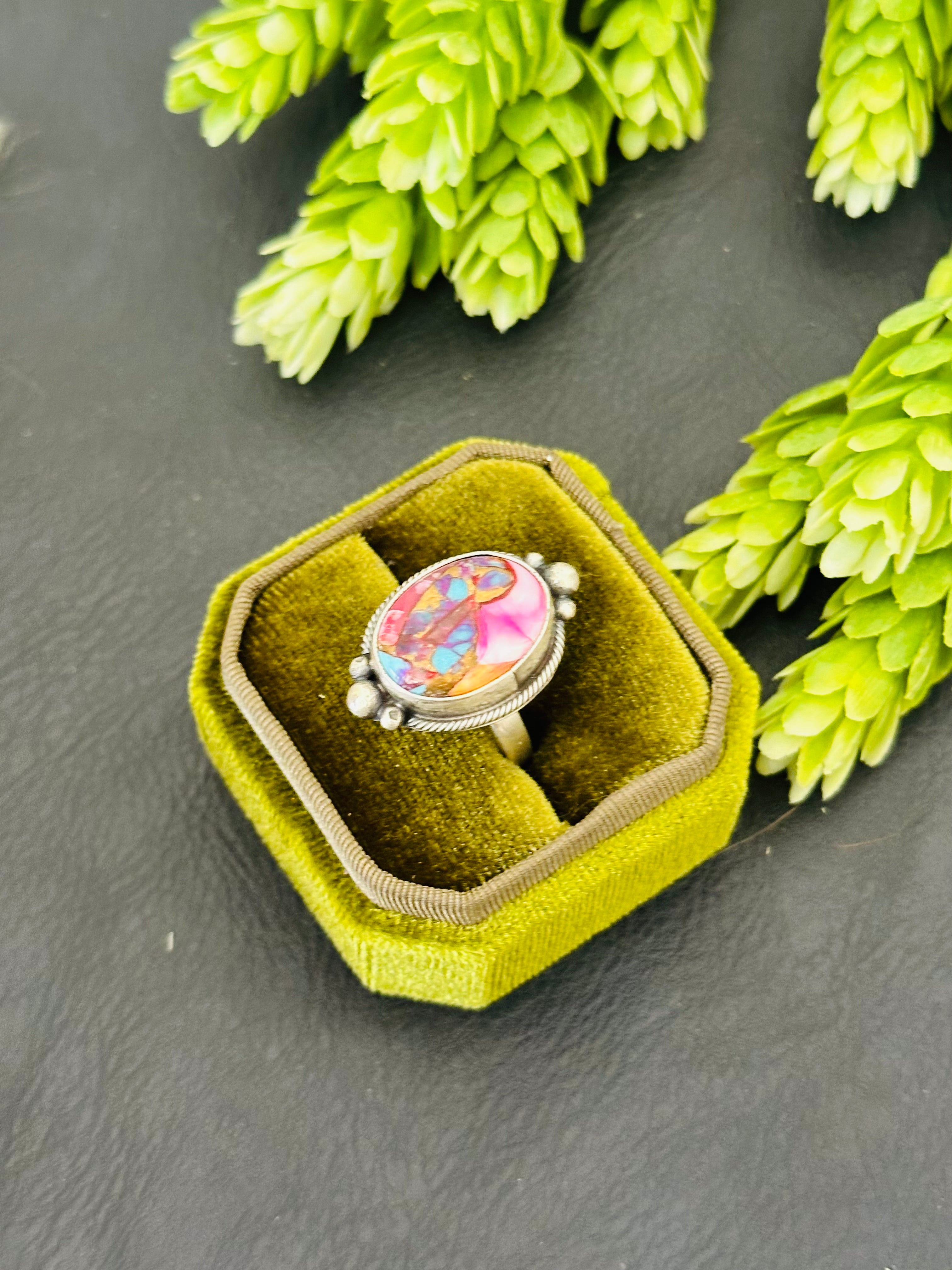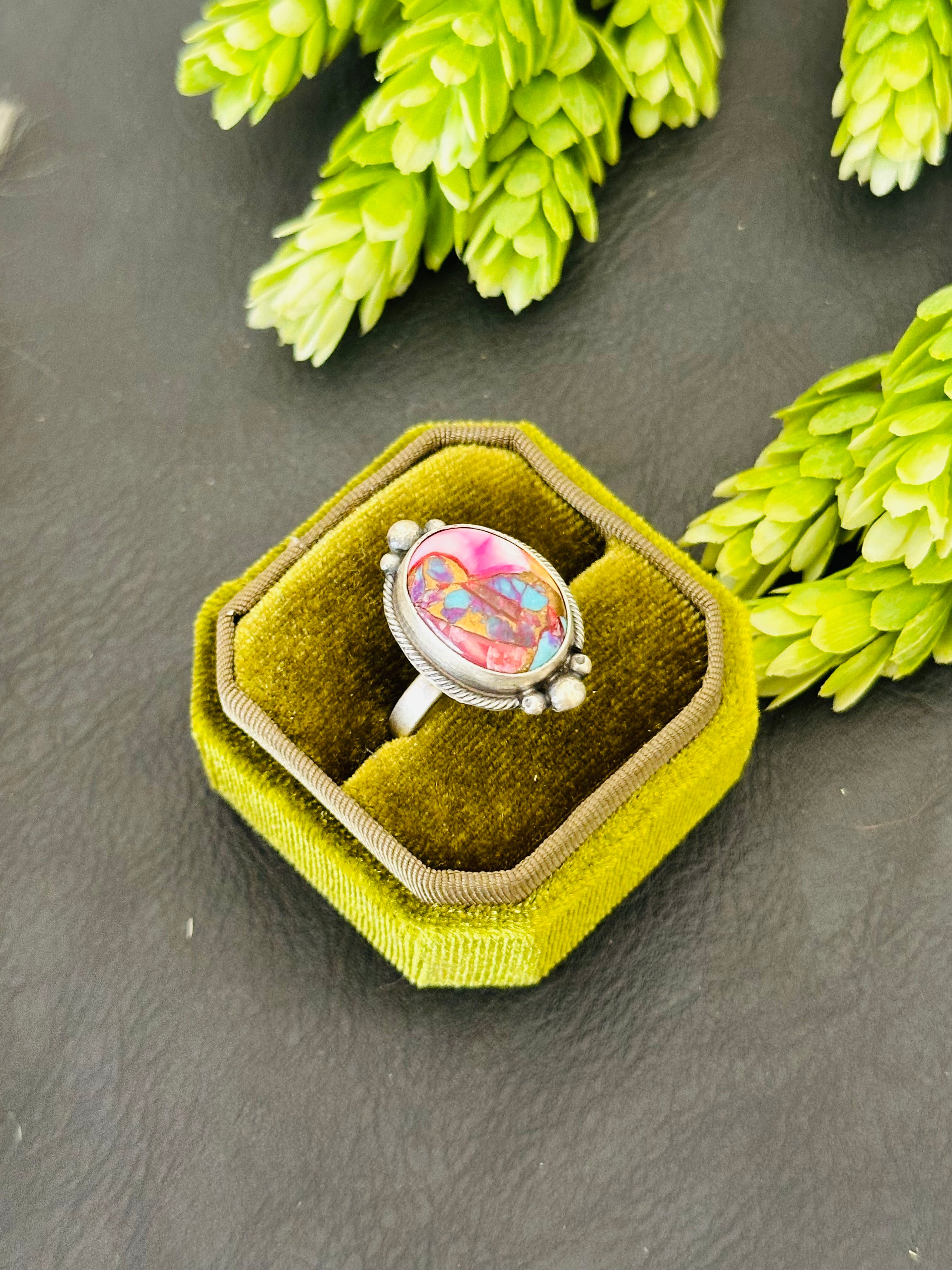Eli Skeets Mohave Turquoise & Sterling Silver Ring Size 8.5. It measures 1 inch long and just under 3/4 of an inch wide. Signed by artist and stamped sterling silver.