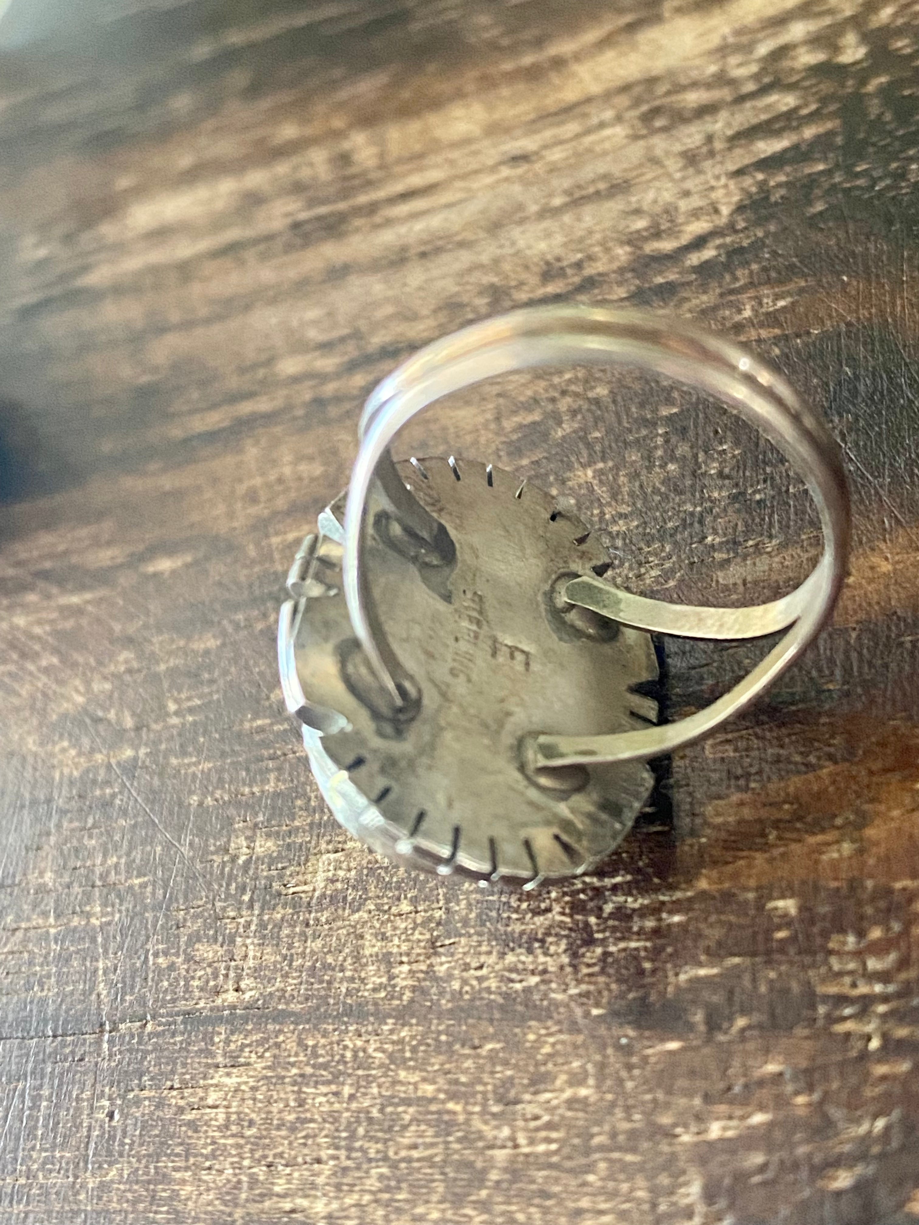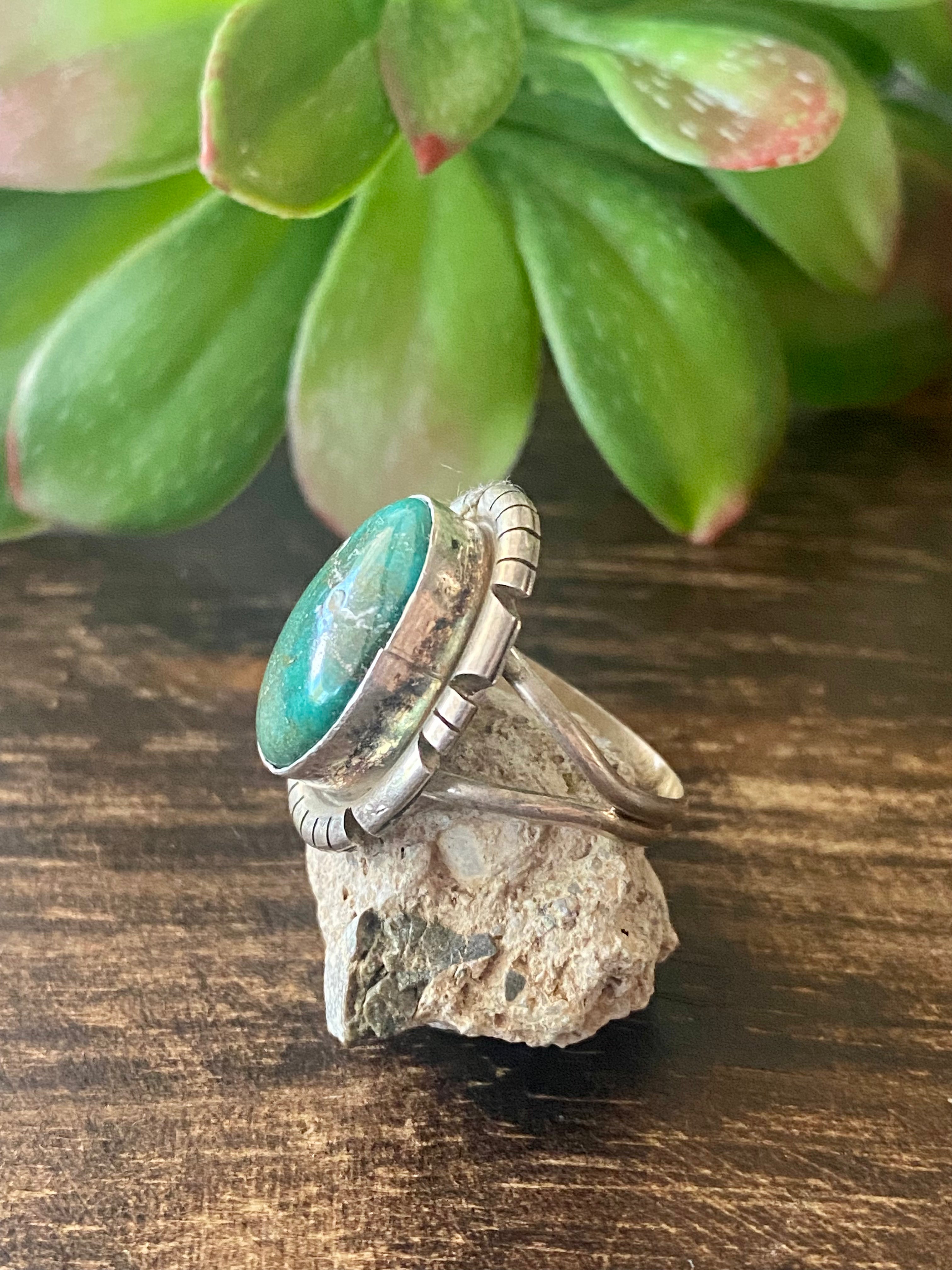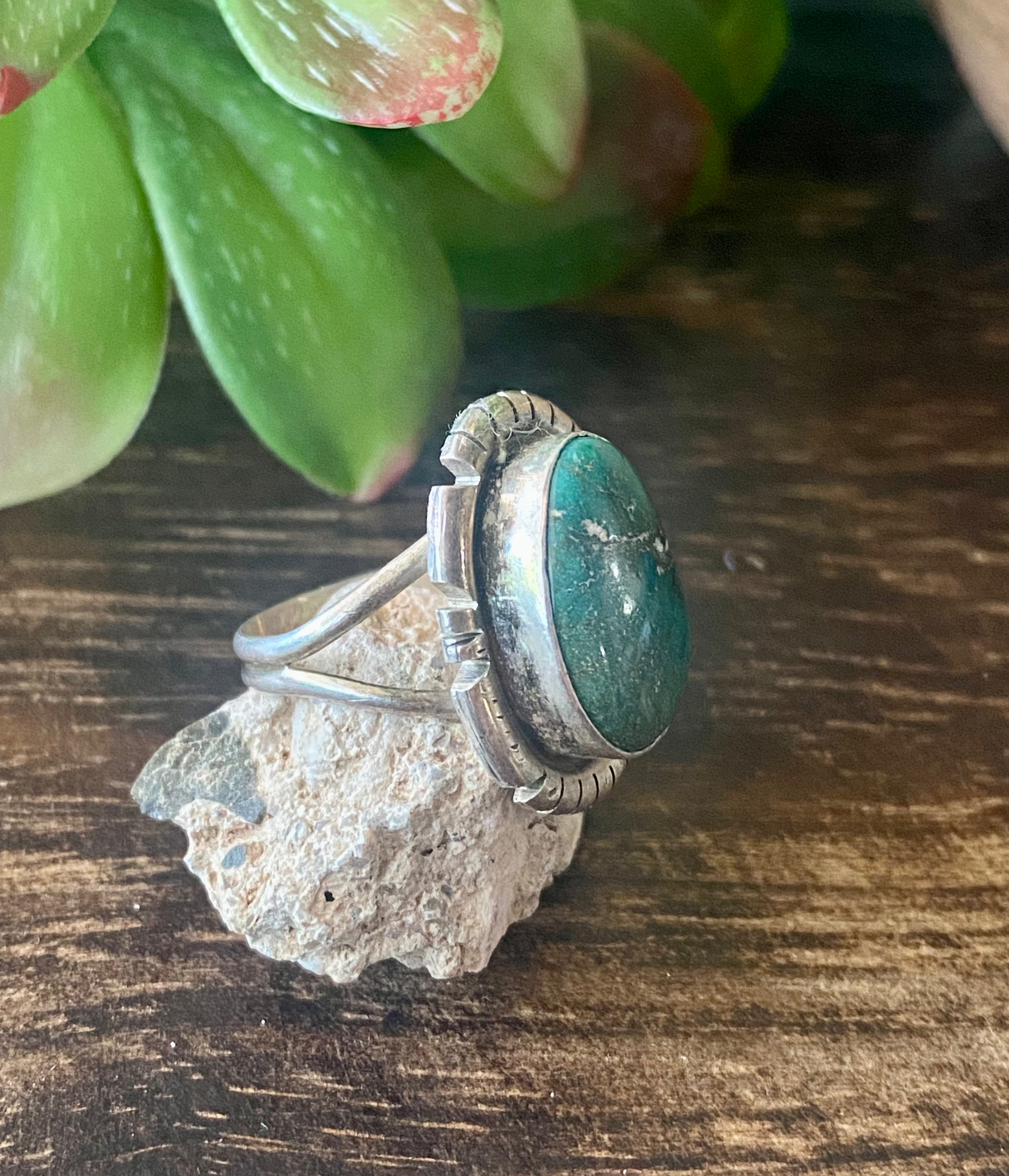 Eli Skeets Royston Turquoise & Sterling Silver Ring Size 6.75. It measures 7/8 of an inch long and 3/4 of an inch wide. Signed by the artist and stamped sterling silver.