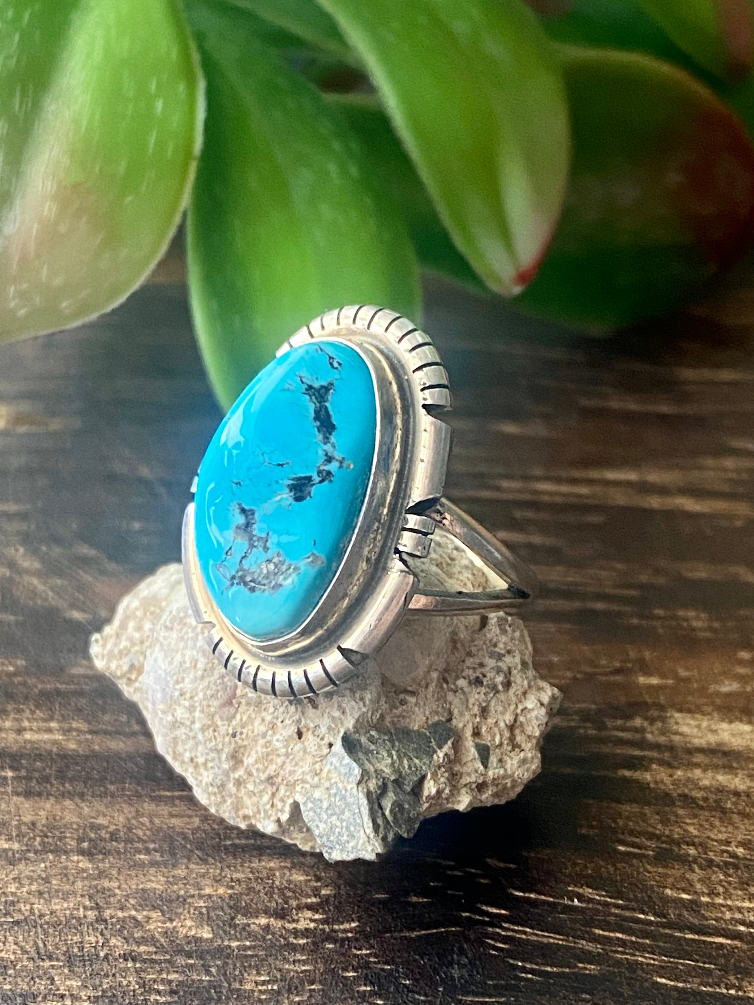 Eli Skeets Sleeping Beauty Turquoise & Sterling Silver Ring Size 5. It measures 7/8 of an inch long and 5/8 of an inch wide. Signed by the artist and stamped sterling silver.