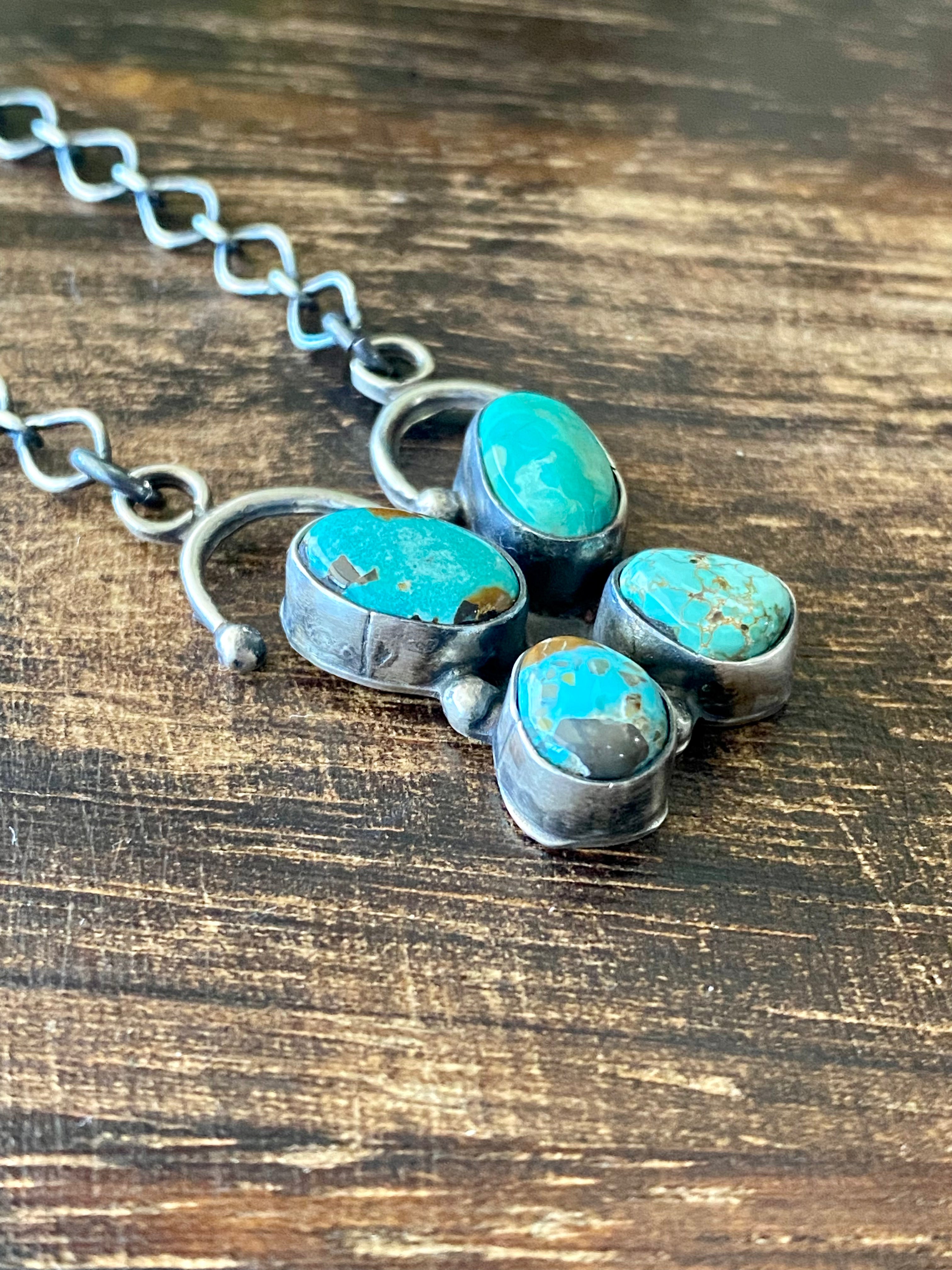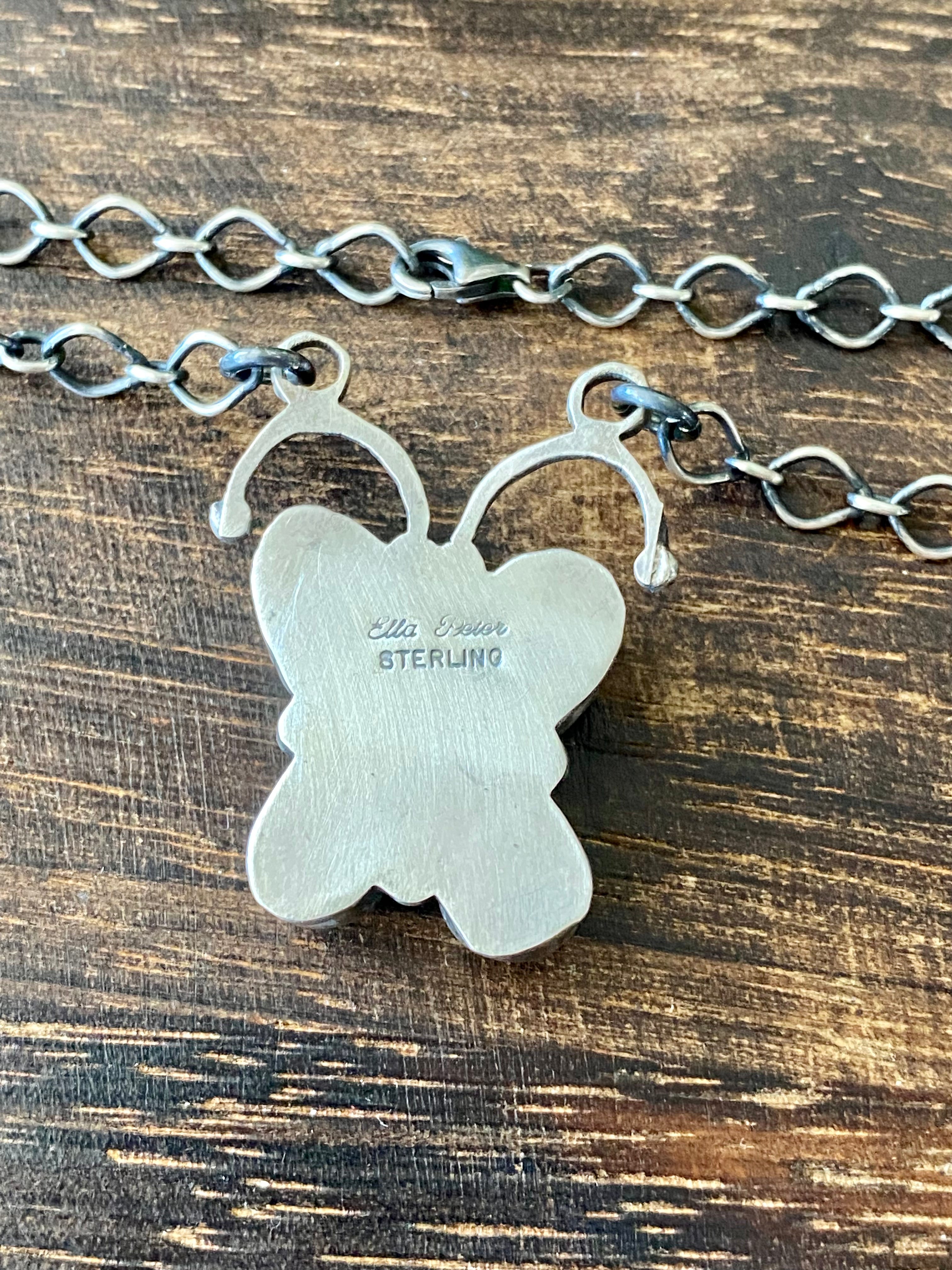 Ella Peters Dry Creek Turquoise & Sterling Silver Butterfly Necklace. It measures 21 inches long with hang while the chain measures 18 inches long. Signed by the artist and stamped sterling silver.