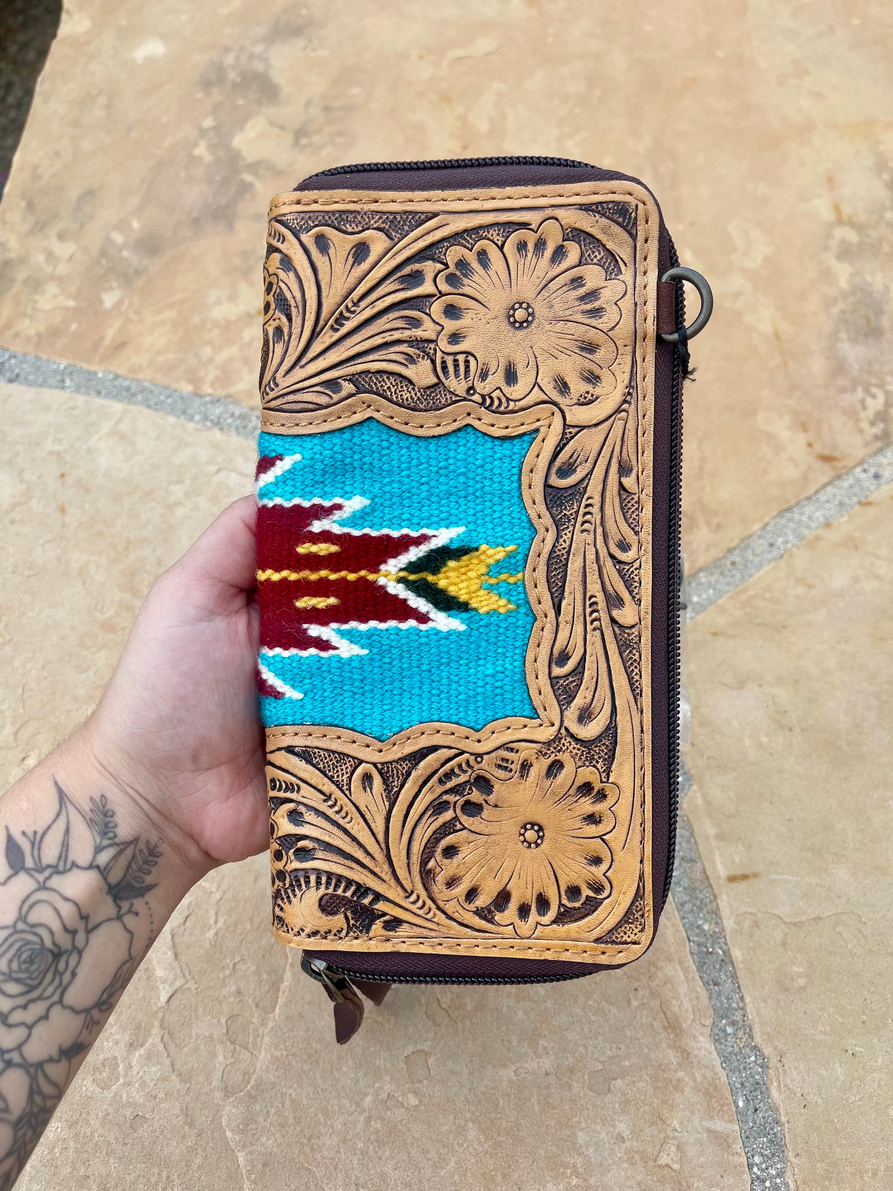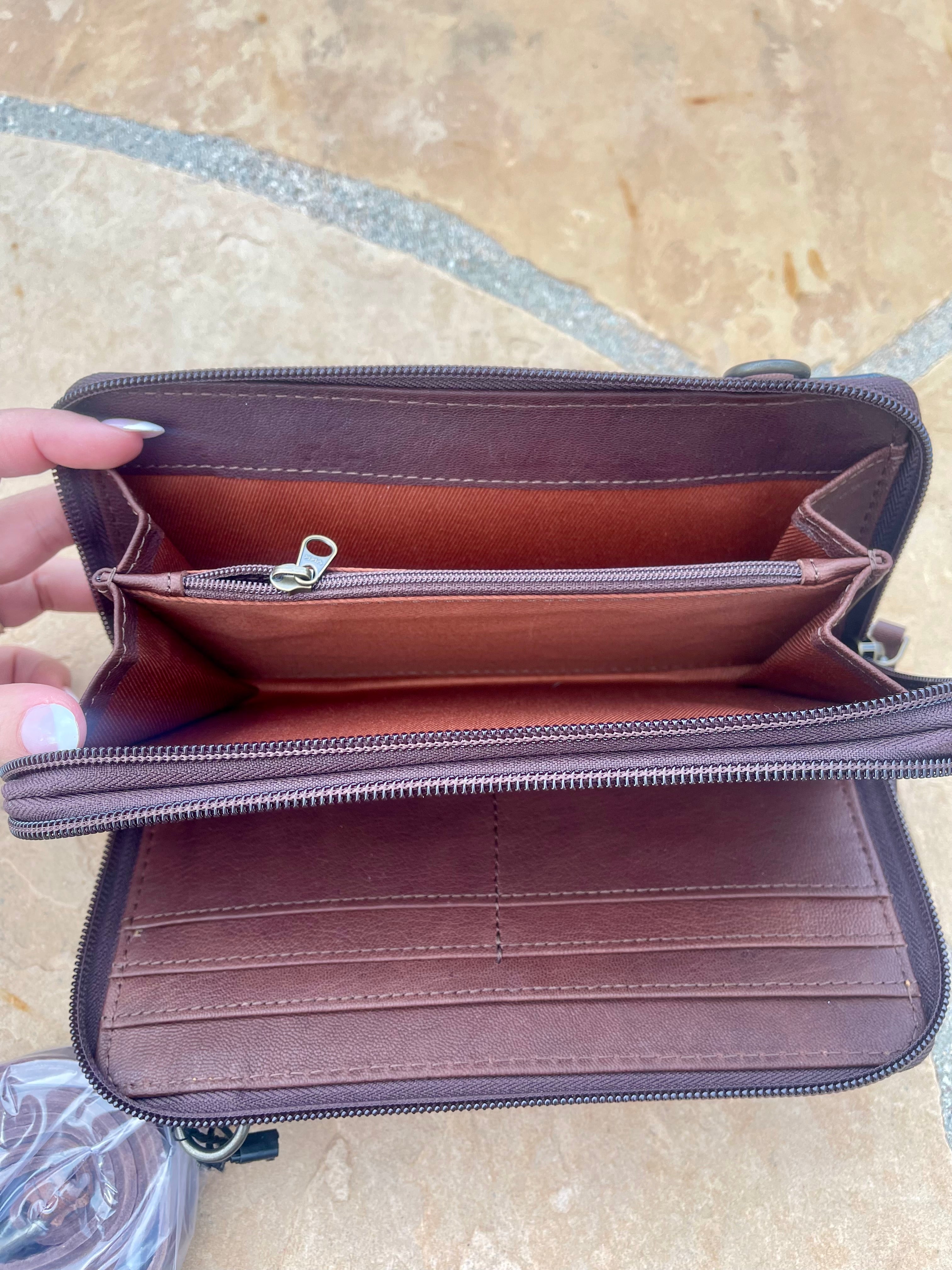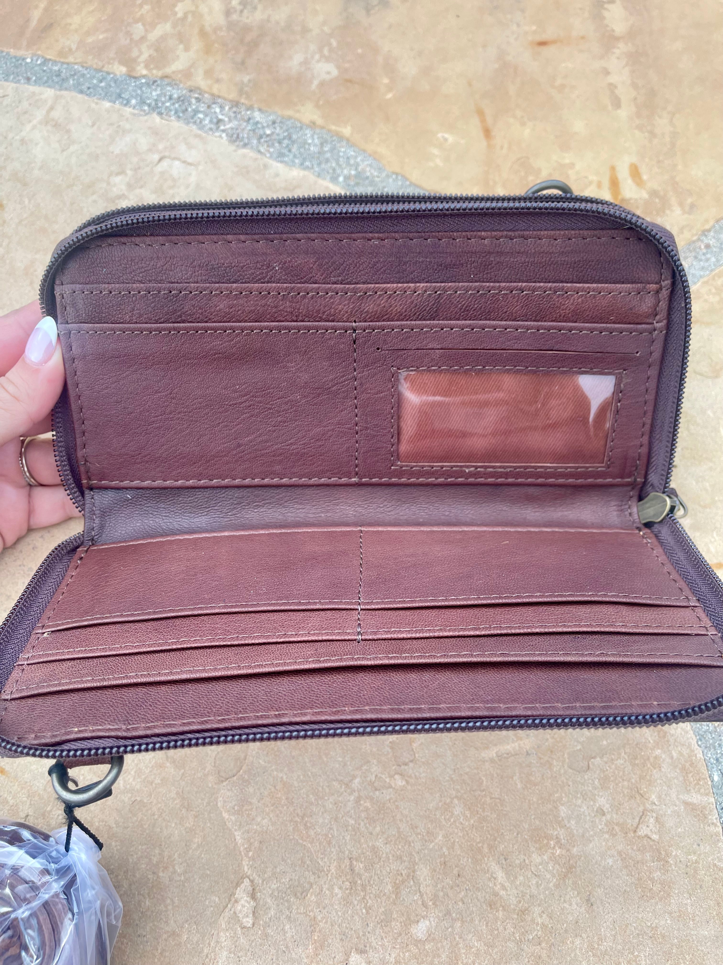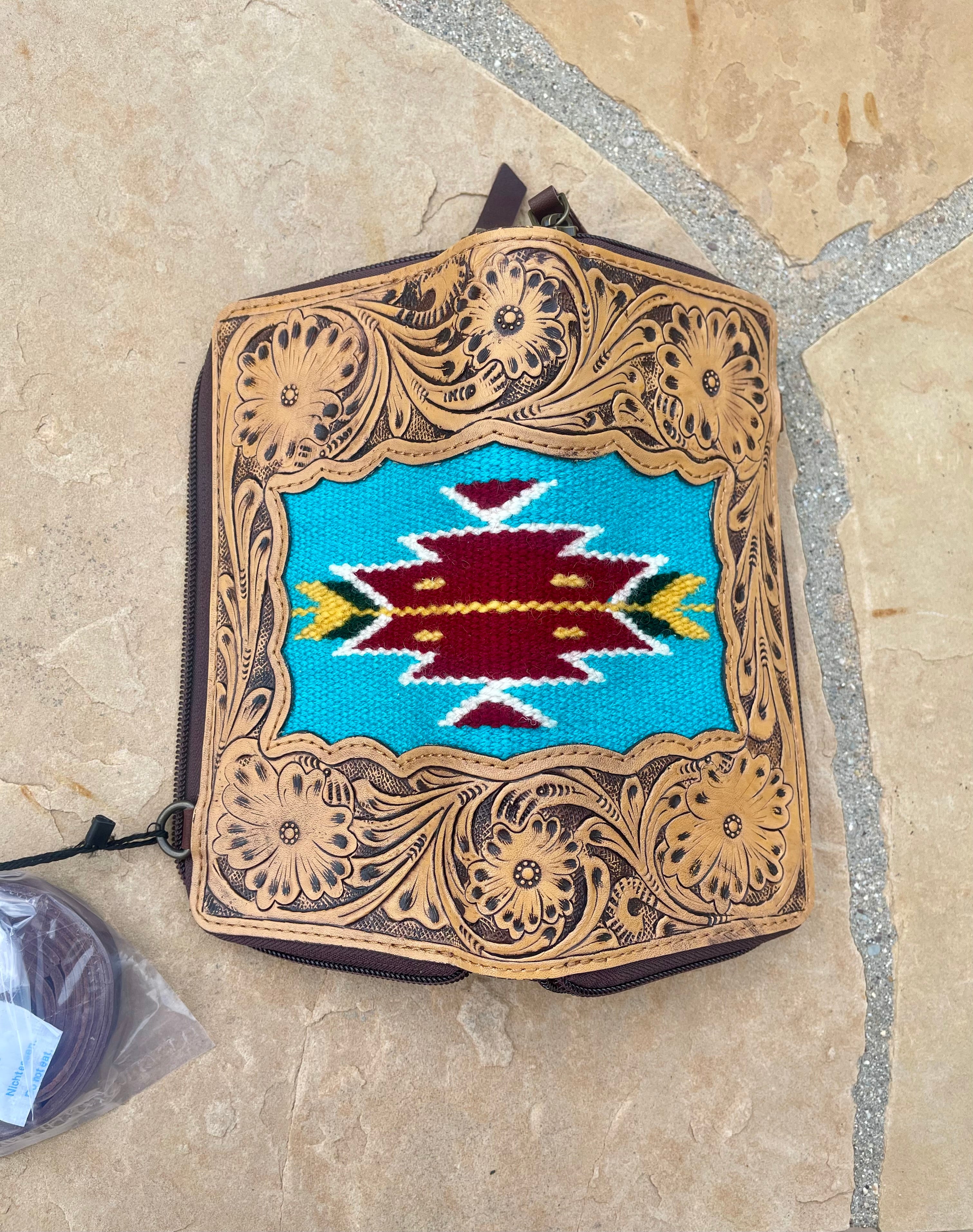 It measures 8 1/2 inches wide and 4 1/2 inches long. Strap measures 49 inches long.