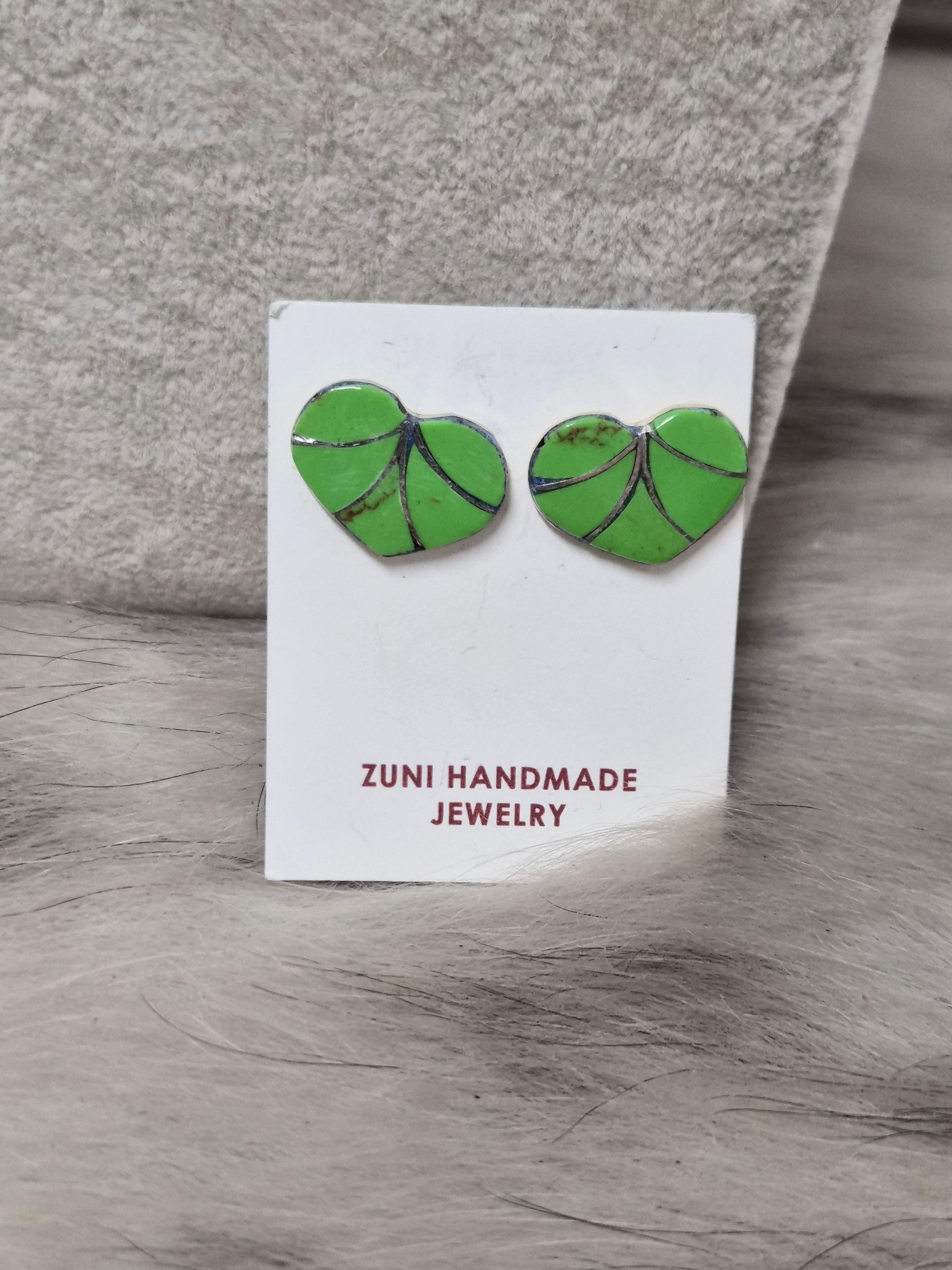 Karen Lalio Gaspeite & Sterling Silver Inlay Heart Post Earrings. They measure just over 1/2 of an inch long and 3/4 of an inch wide.