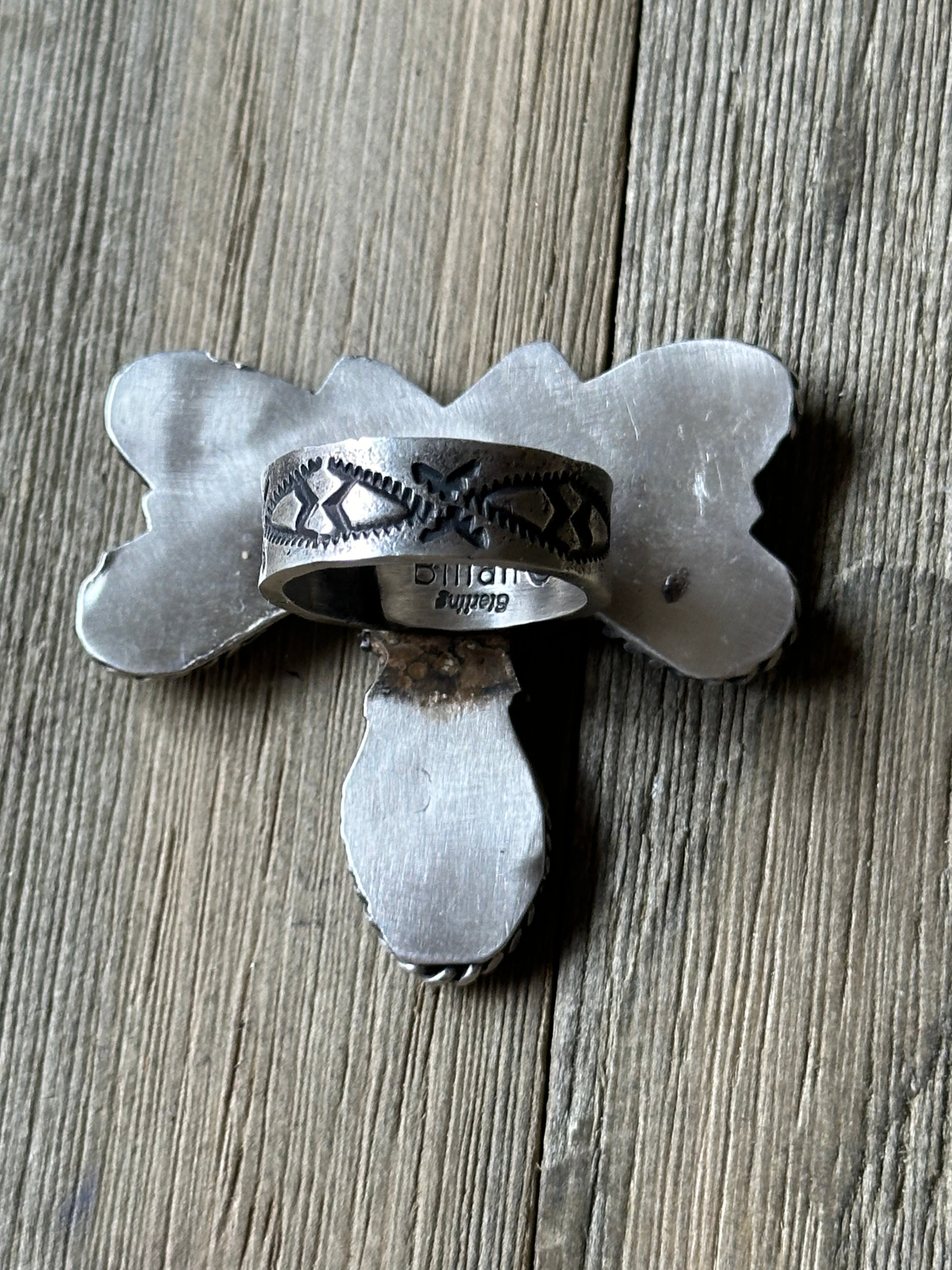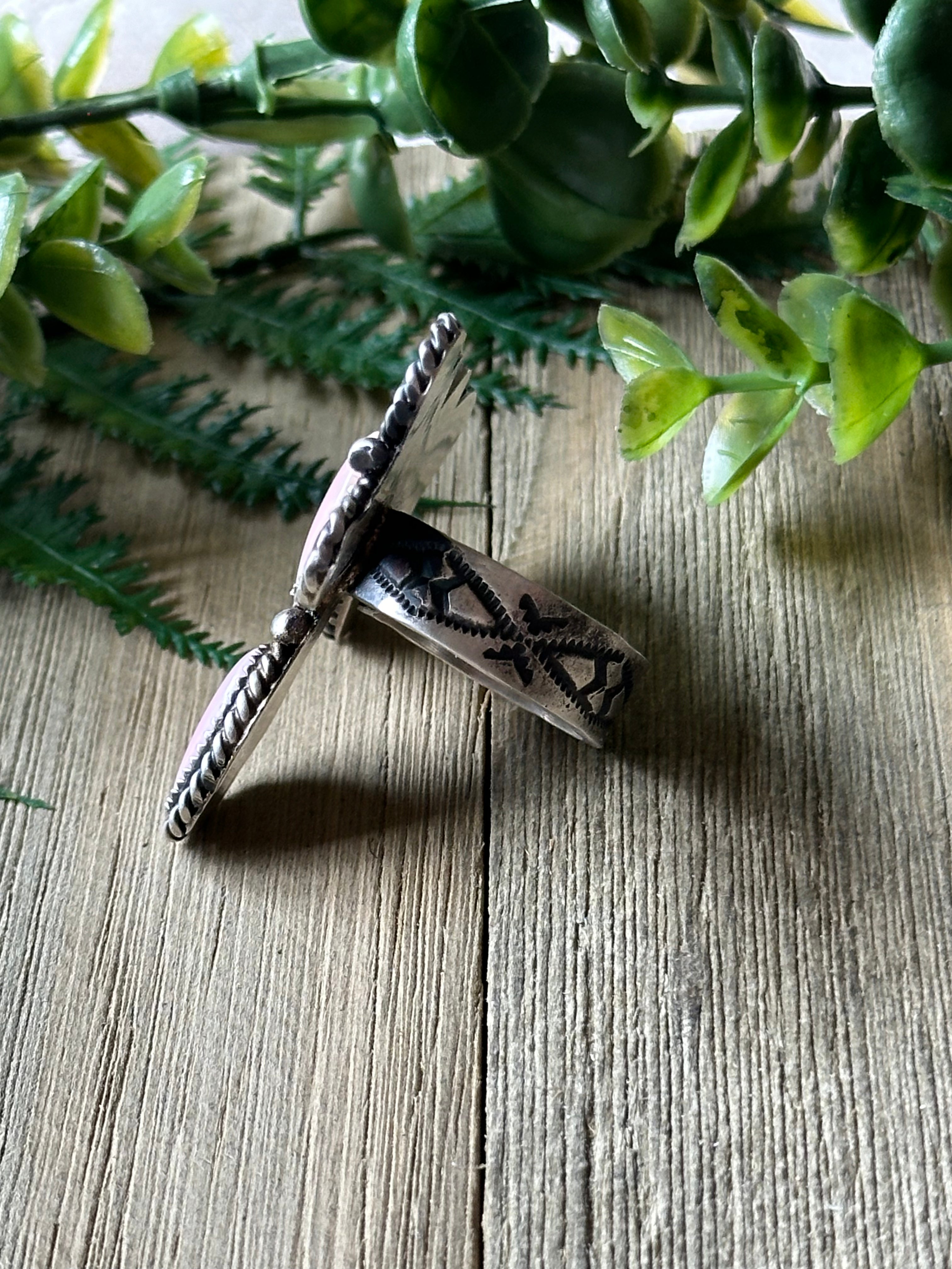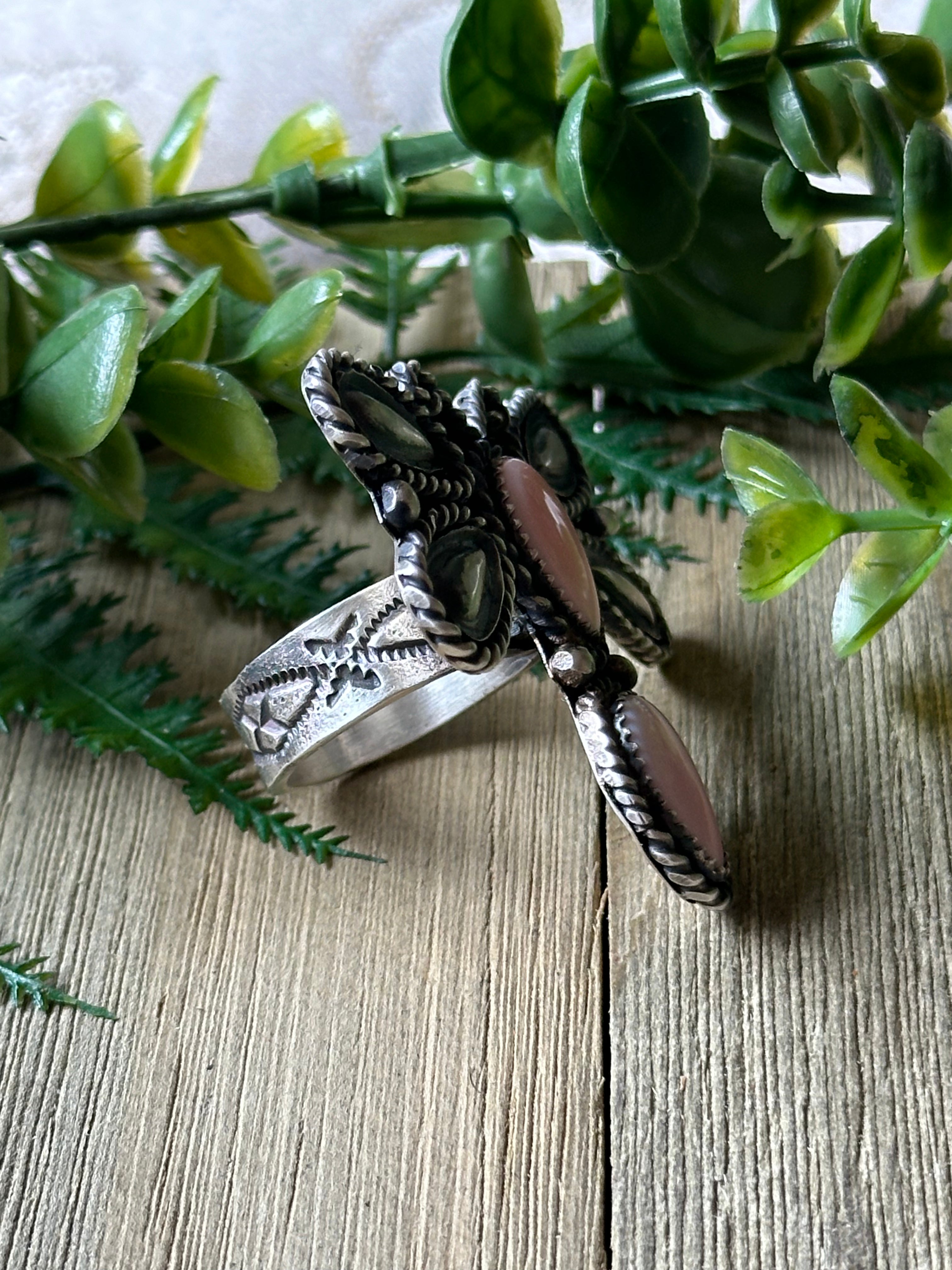 Beautiful ring. Kindale Billah Pink Conch & Sterling Silver Adjustable Ring. It measures 1 3/4 inches long and just over 2 1/8 inches wide. Signed by the artist and stamped sterling silver.