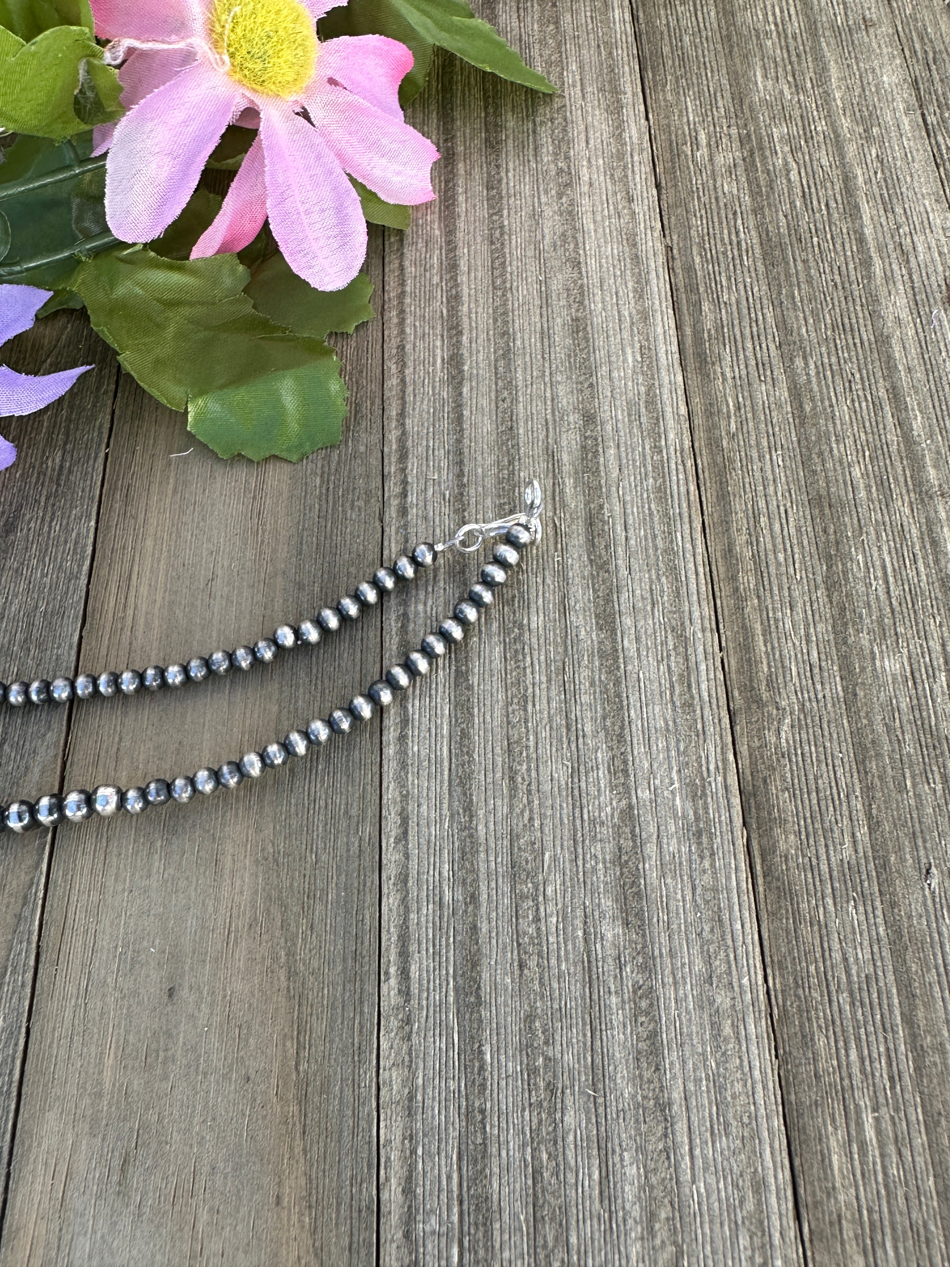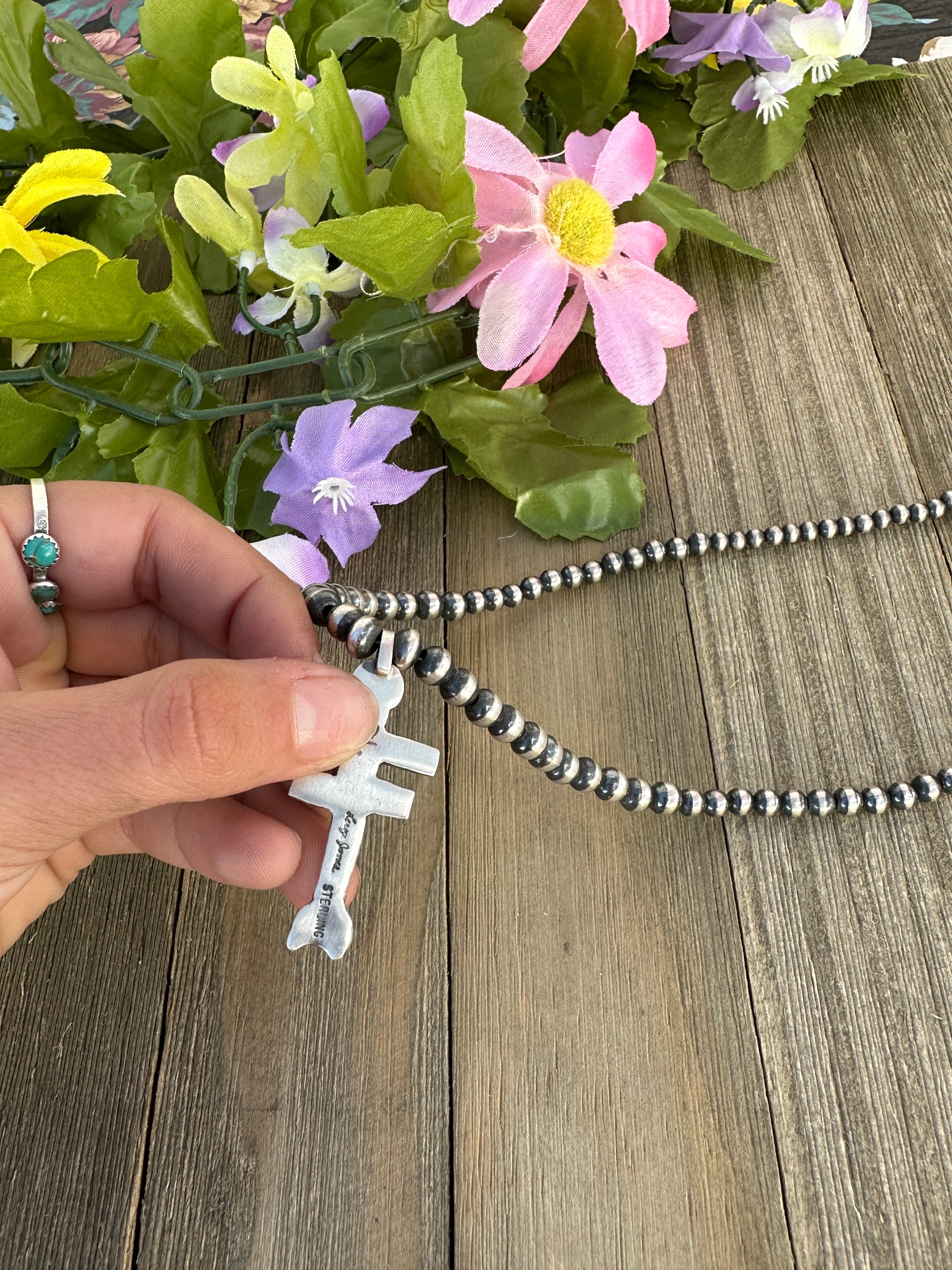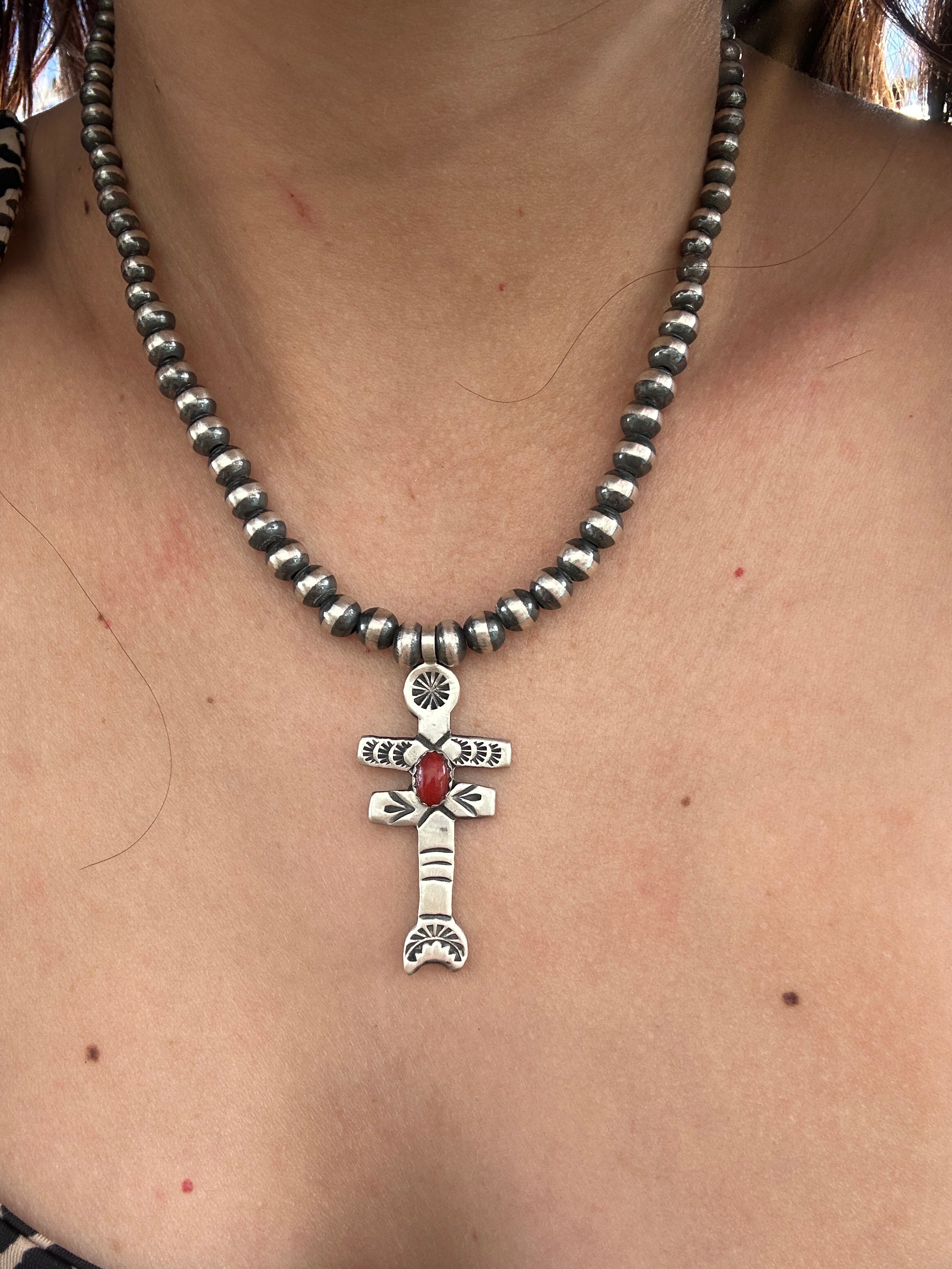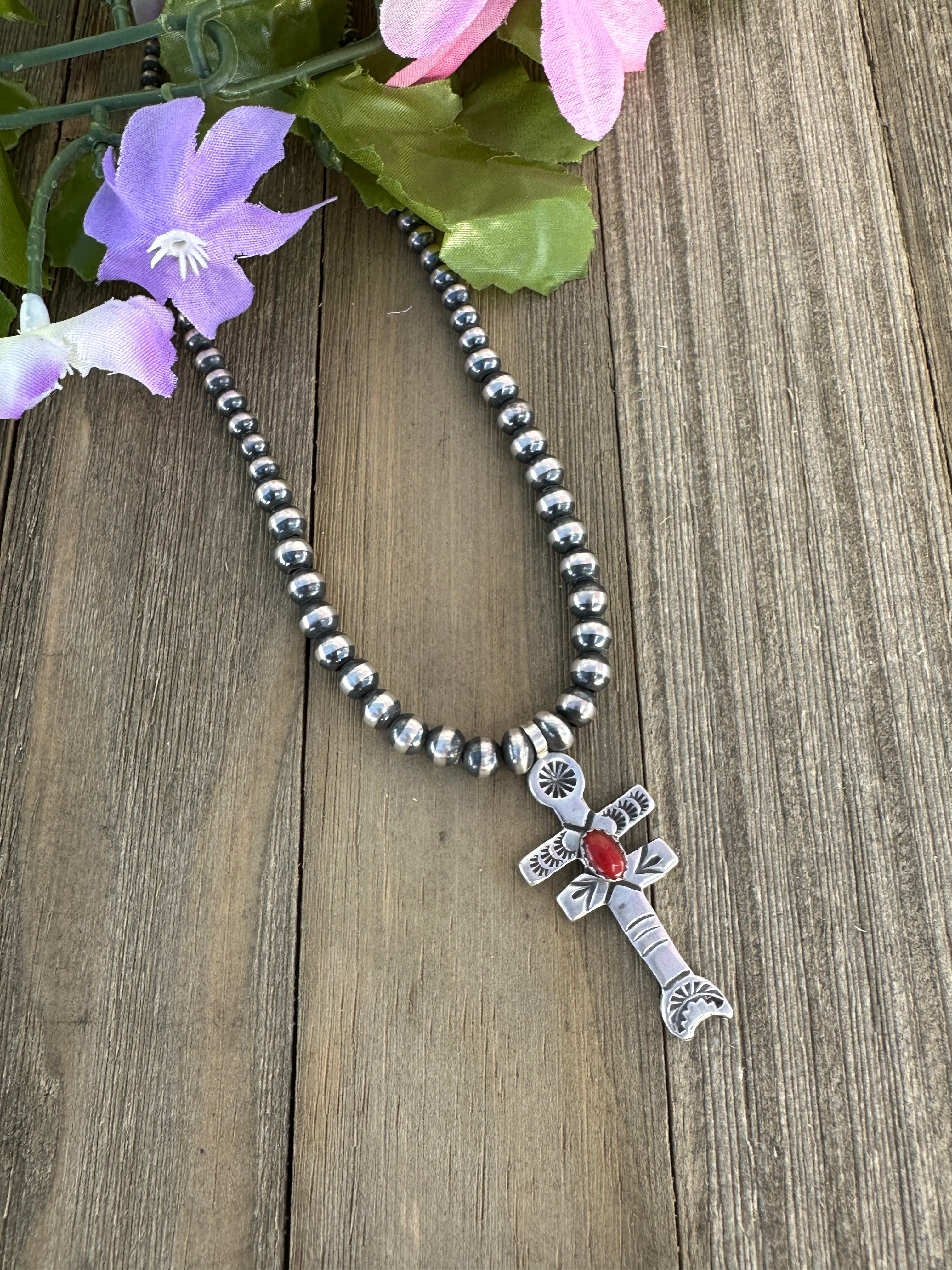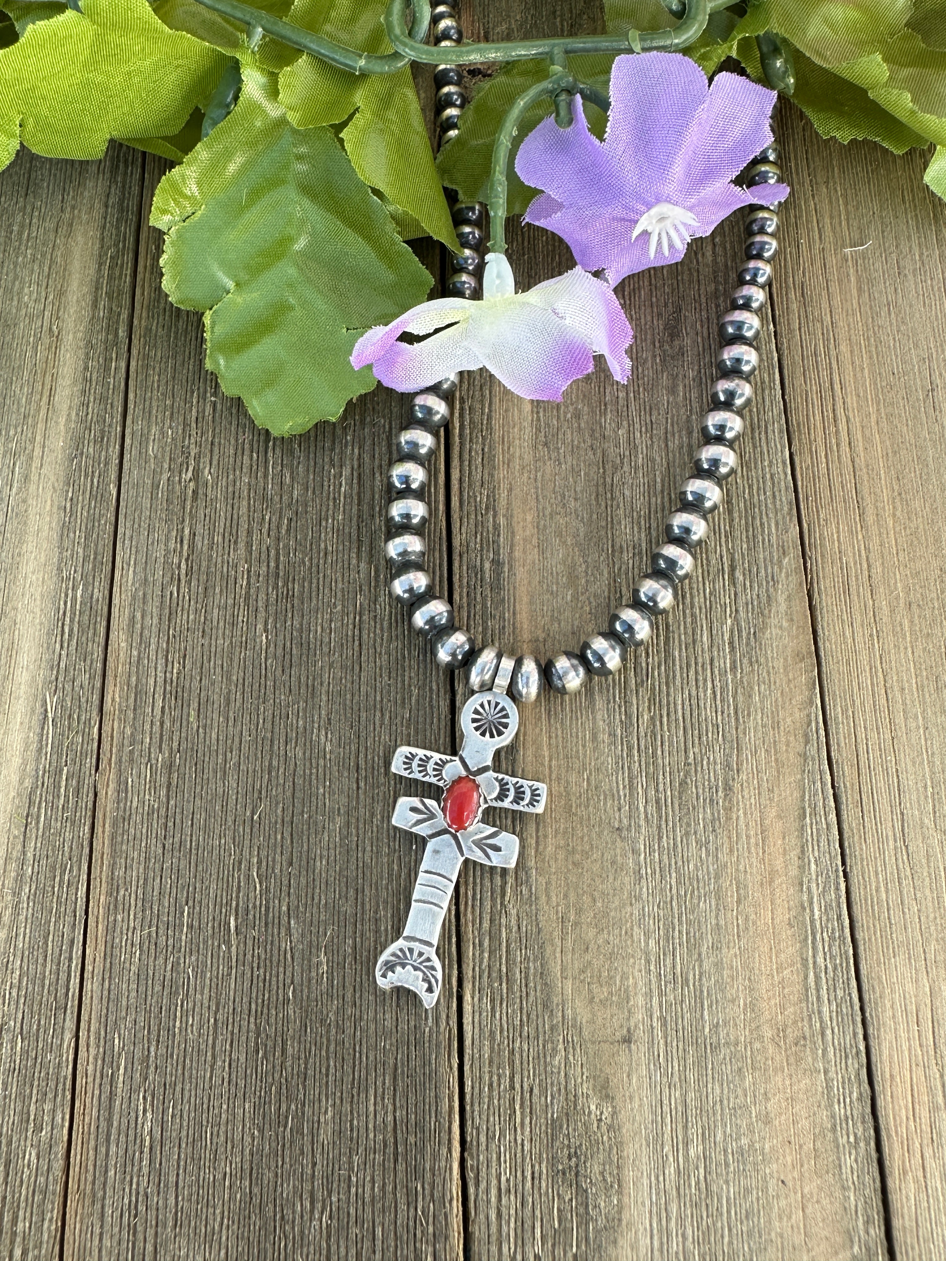 LeRoy James Mediterranean Coral & Sterling Silver Necklace. It measures 19 inches long with hang while the chain by itself measures 15 inches long. Signed by the artist and stamped sterling silver.