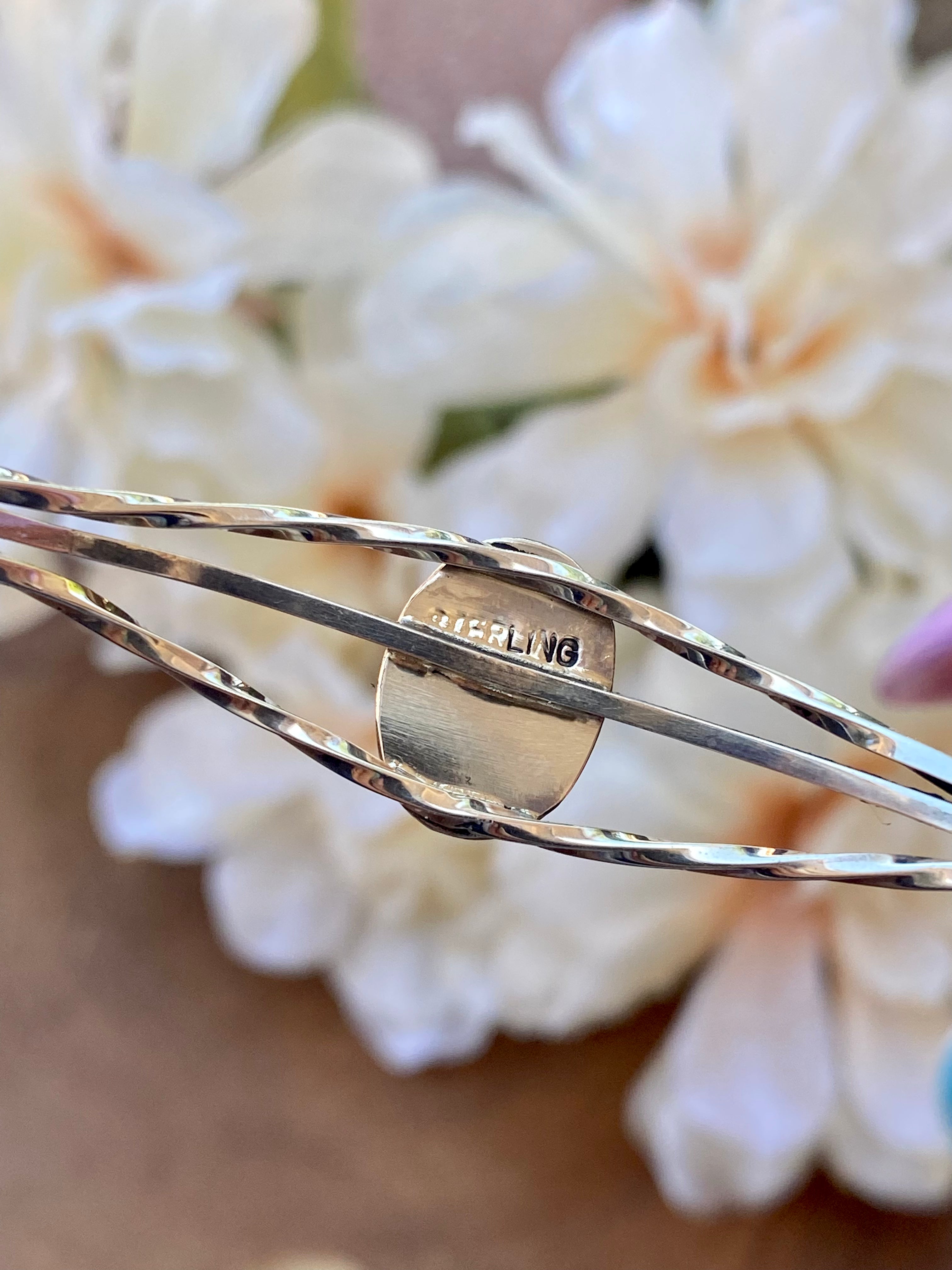 Mark Barney Blue Opal & Sterling Silver Cuff Bracelet. It measures 5/8 of an inch wide with an inside circumference of 5 1/4 inches and a gap of 1 1/8 inches - cuff has some flex. Stamped sterling silver.