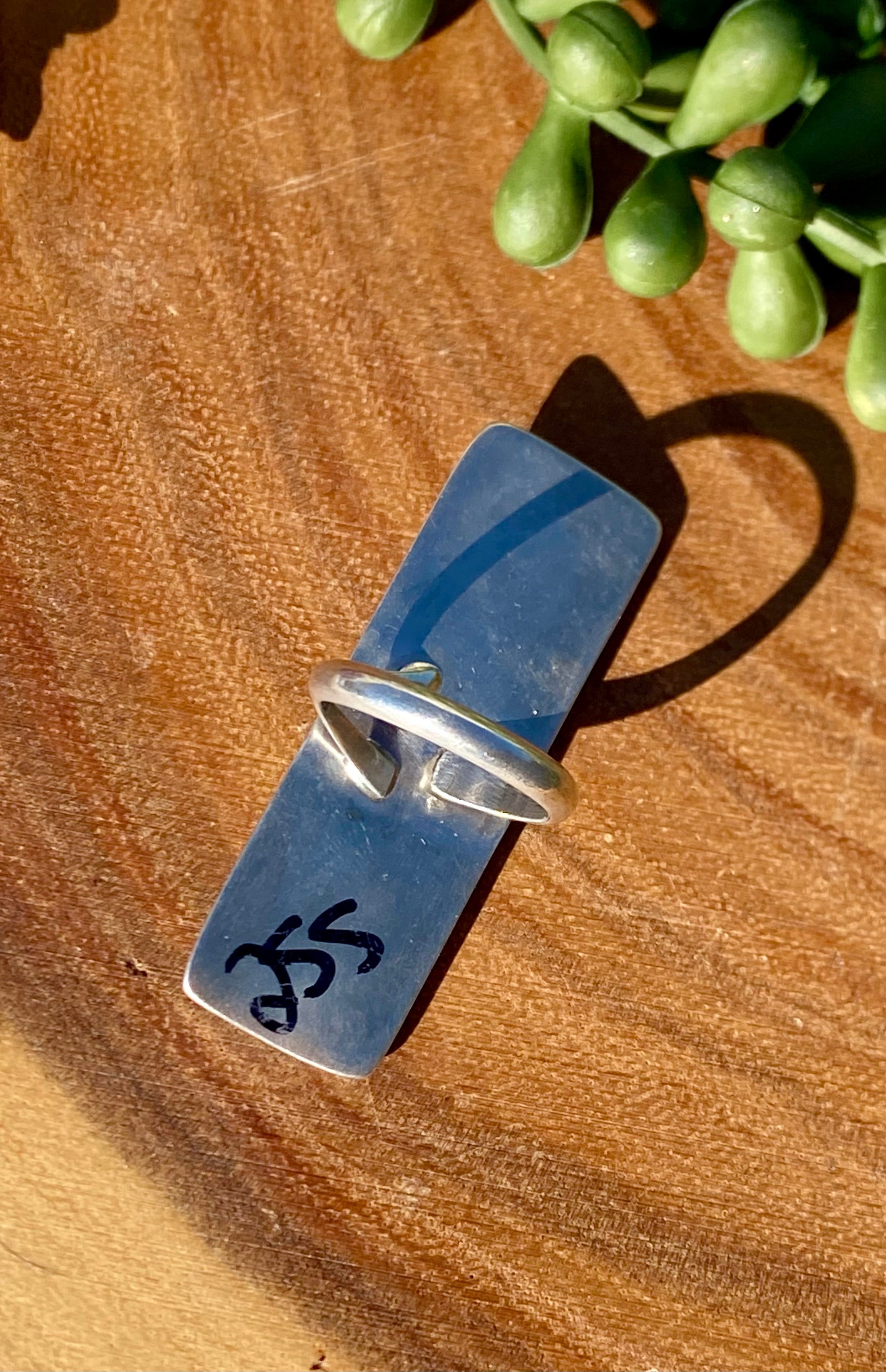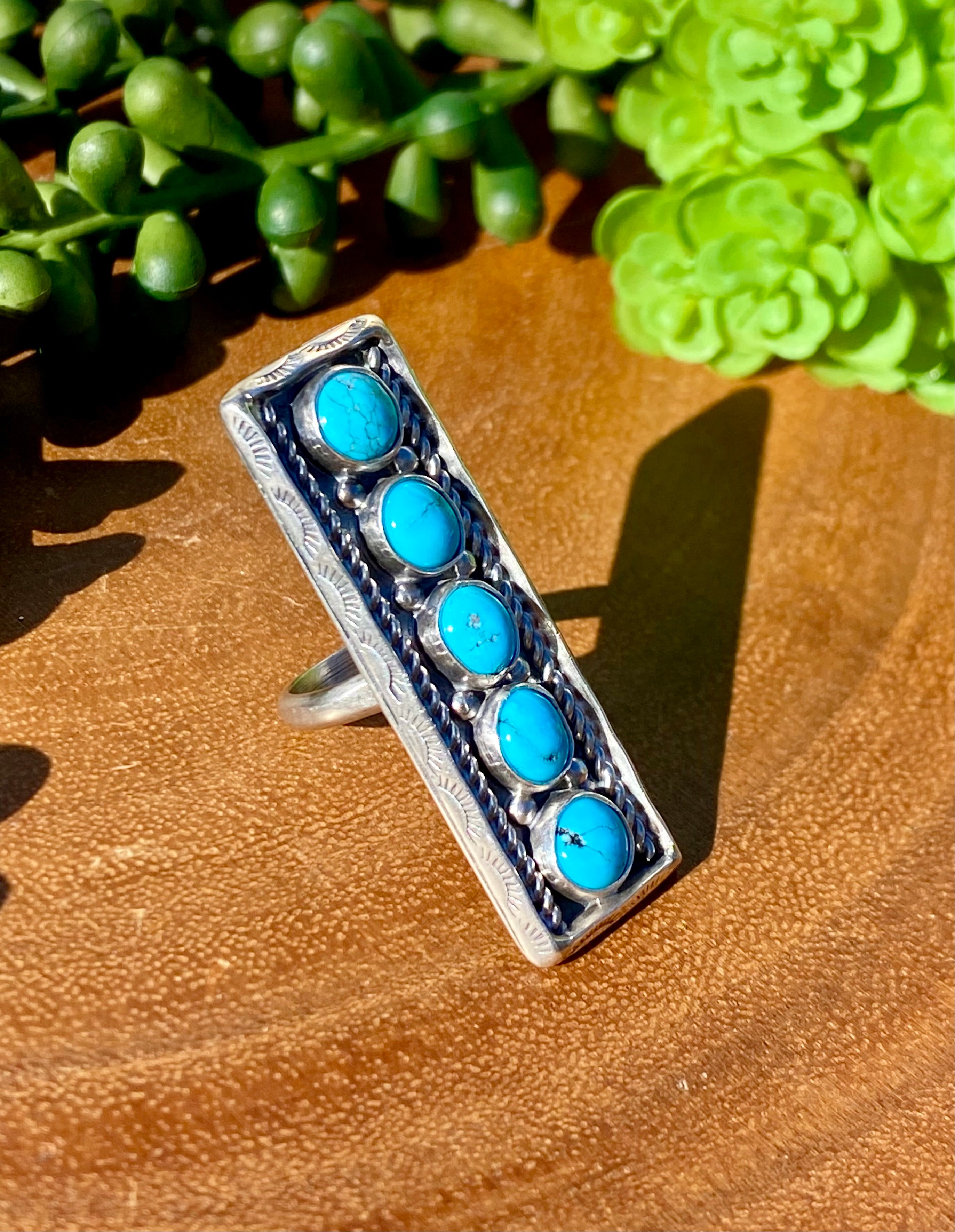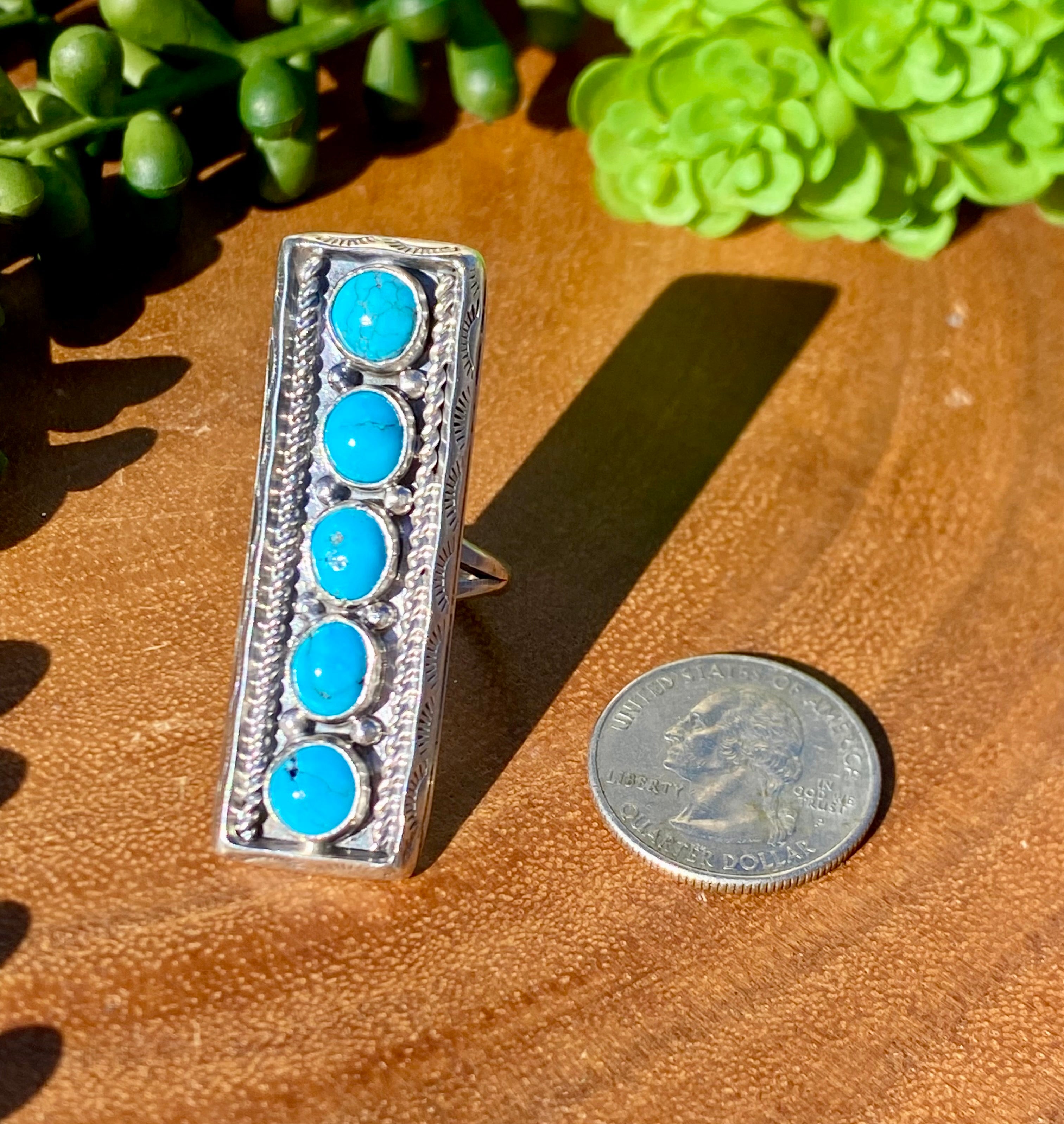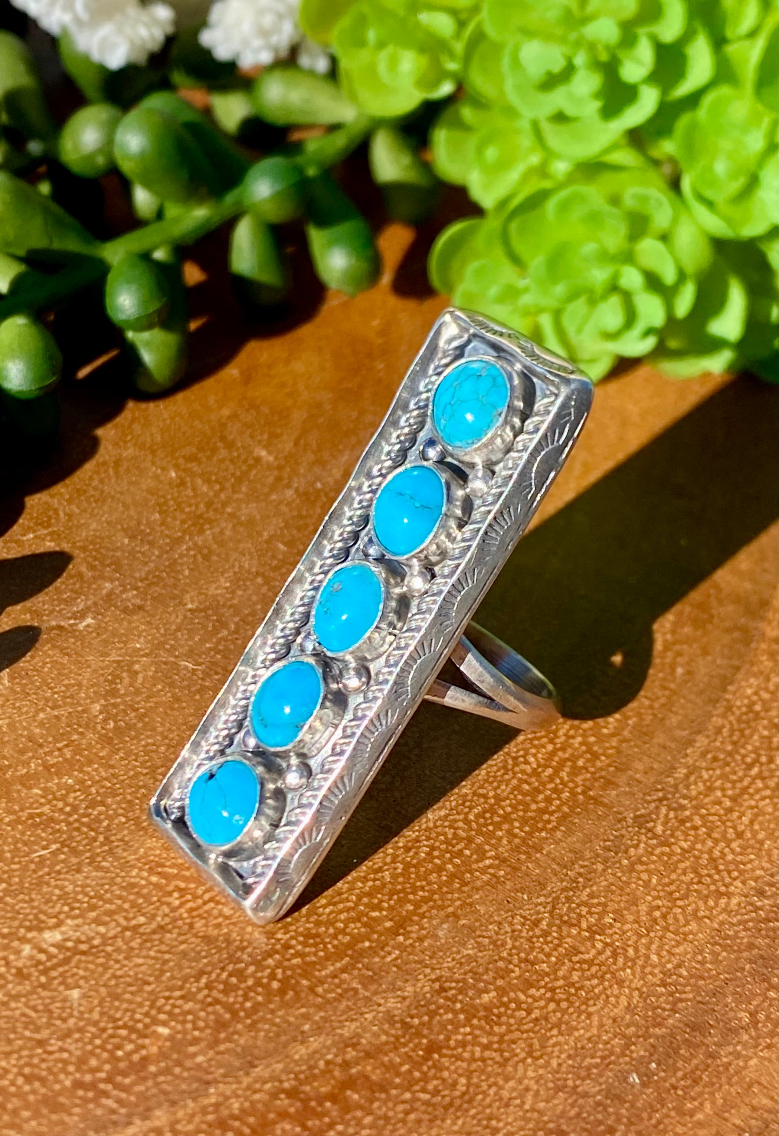 Navajo Kingman Turquoise & Sterling Silver Adjustable Ring. It measures 2 inches long and just over 5/8 inch wide. Signed by the artist and stamped sterling silver.
