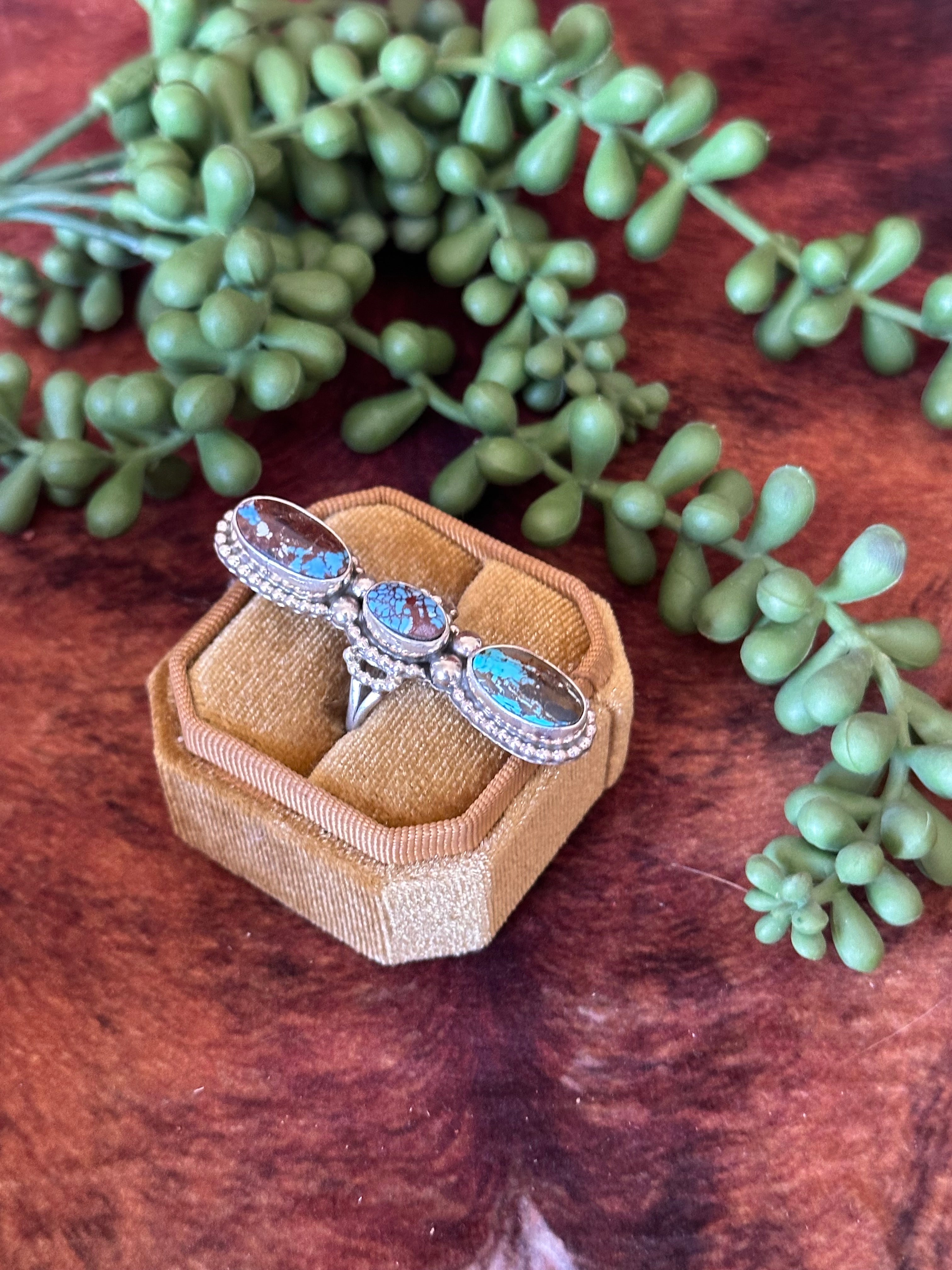 Beautiful ring, Navajo Made Golden Hills Turquoise & Sterling Silver Cluster Ring Size 8.75. It measures 2 1/8 inches long and 1/2 of an inch wide. Signed by the artist and stamped sterling silver.