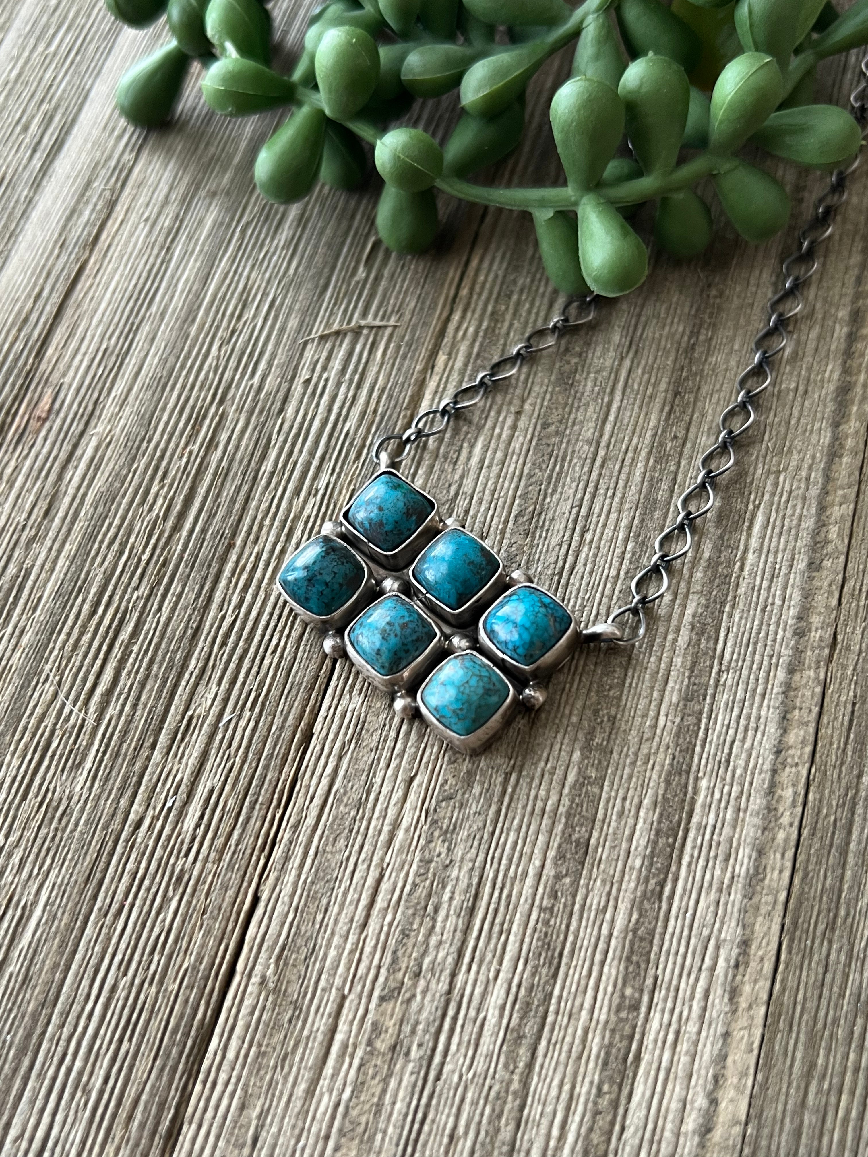 Navajo Made Kingman Turquoise & Sterling Silver Cluster Necklace. It measures just under 19 1/2 inches long with hang while the chain by itself measures 18 inches long. Signed by the artist and stamped sterling silver.
