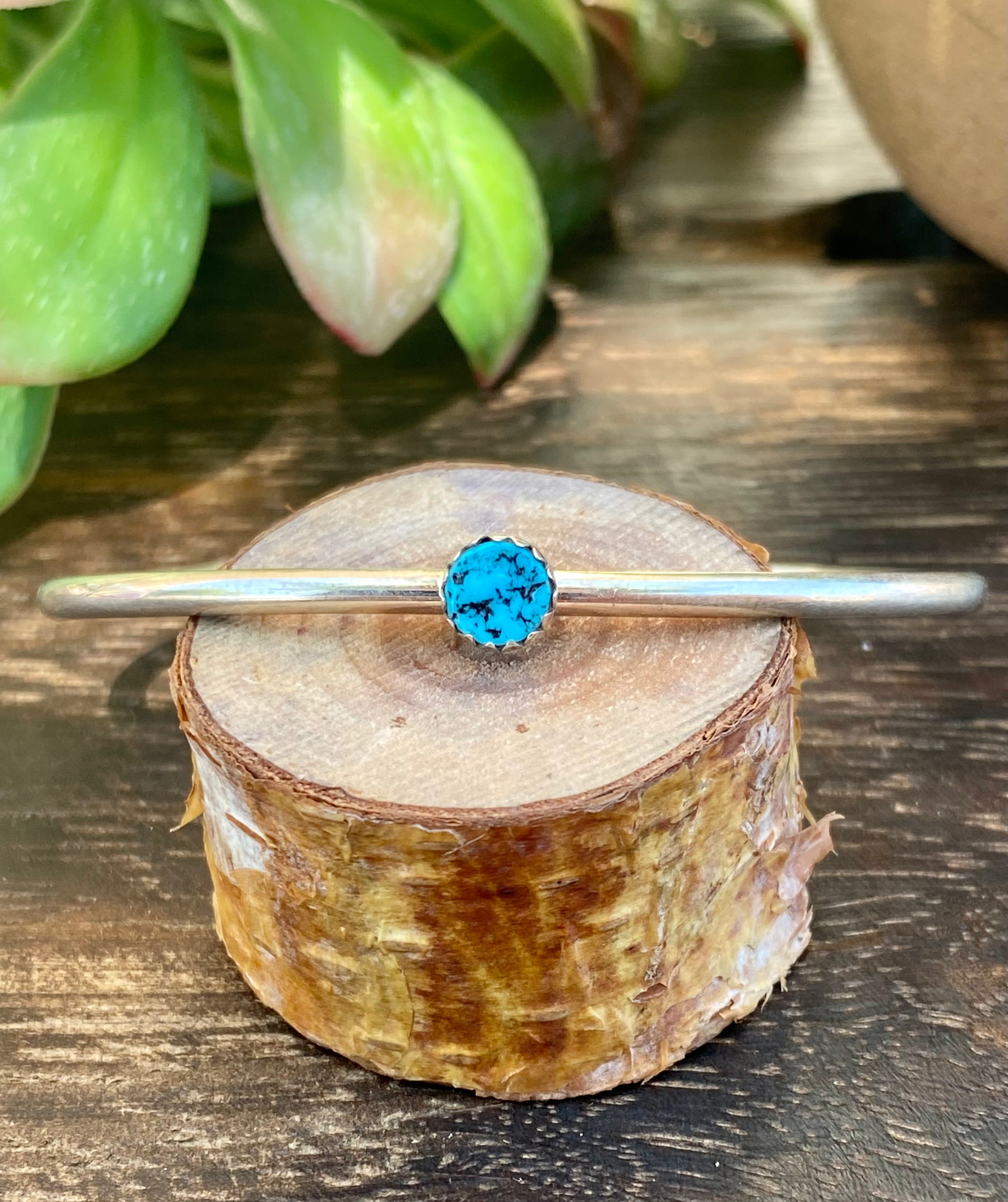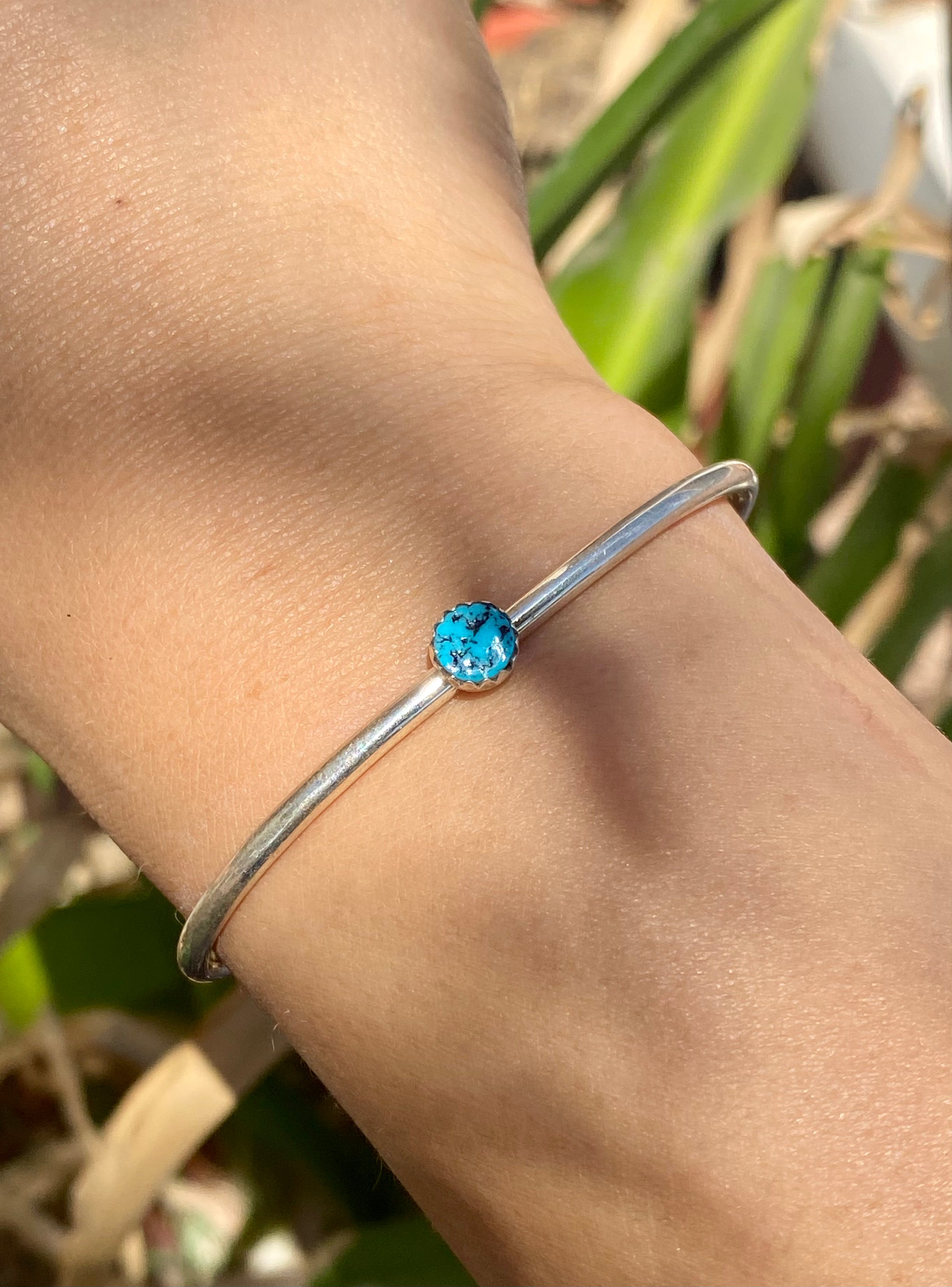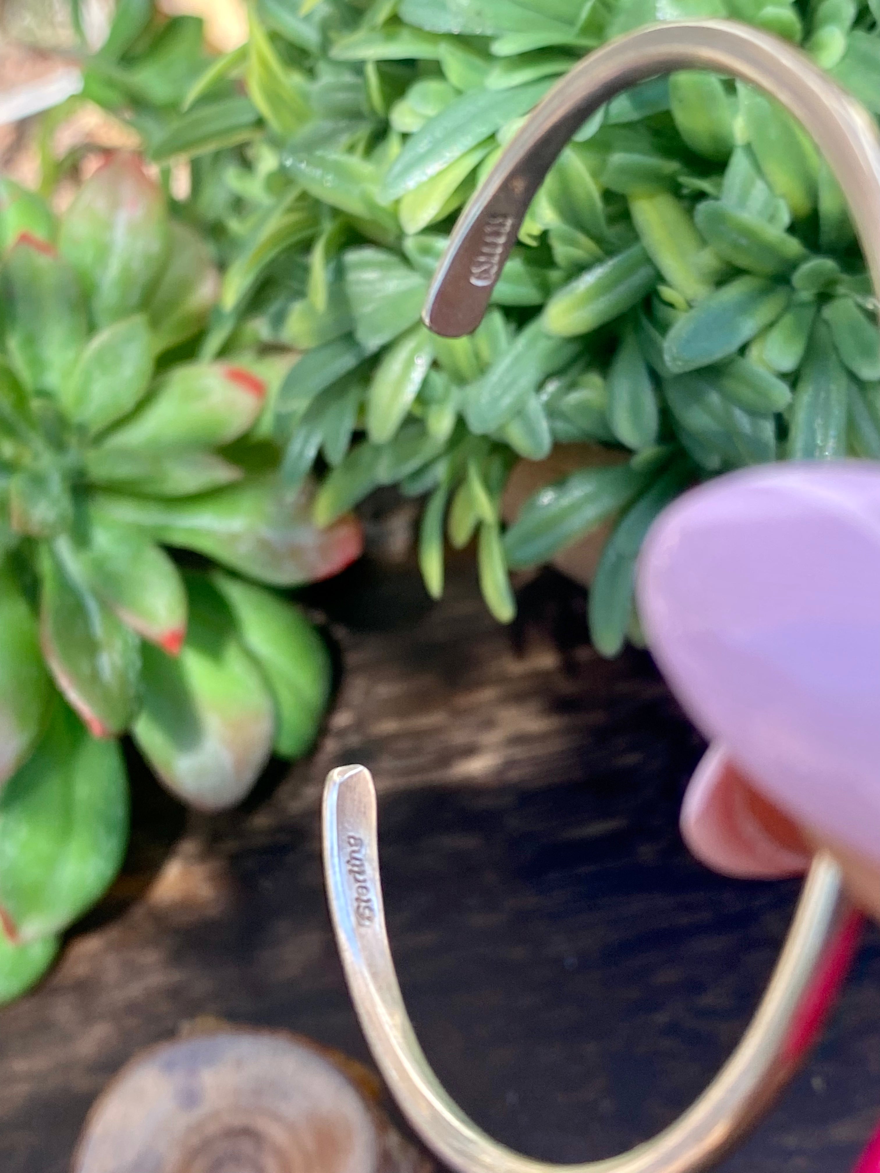 Navajo Made Kingman Turquoise & Sterling Silver Cuff Bracelet. It measures 1/4 of an inch wide with an inside circumference of 5 1/8 inches and a gap of 1 inch-cuff has flex. Stones will differ due to natural stones. Signed by the artist and stamped sterling silver.