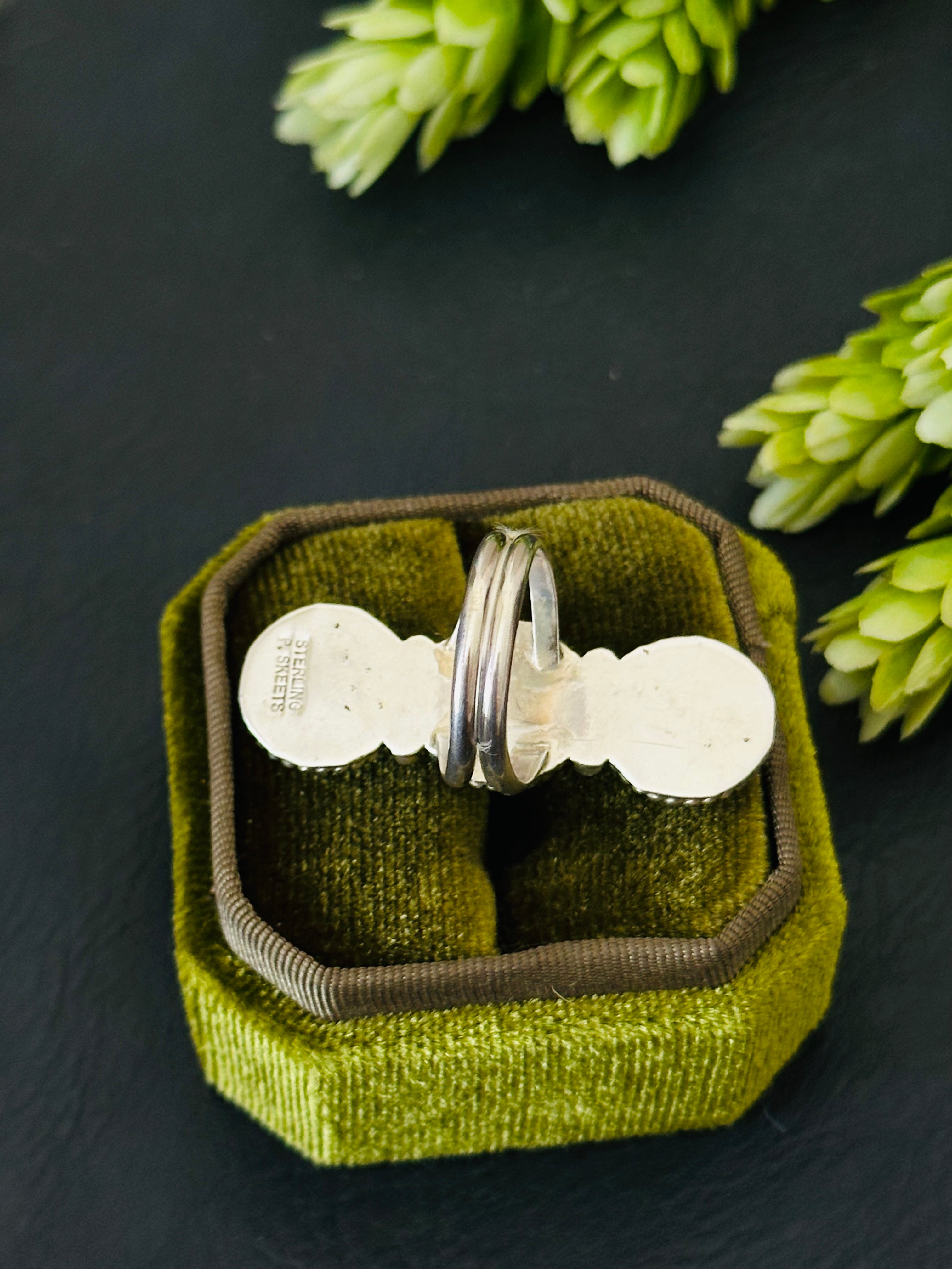 Beautiful ring, Navajo Made Kingman Turquoise & Sterling Silver Ring. It measures 1 5/8 inches long. Signed by the artist and stamped sterling silver. Stones will differ due to natural stones.
