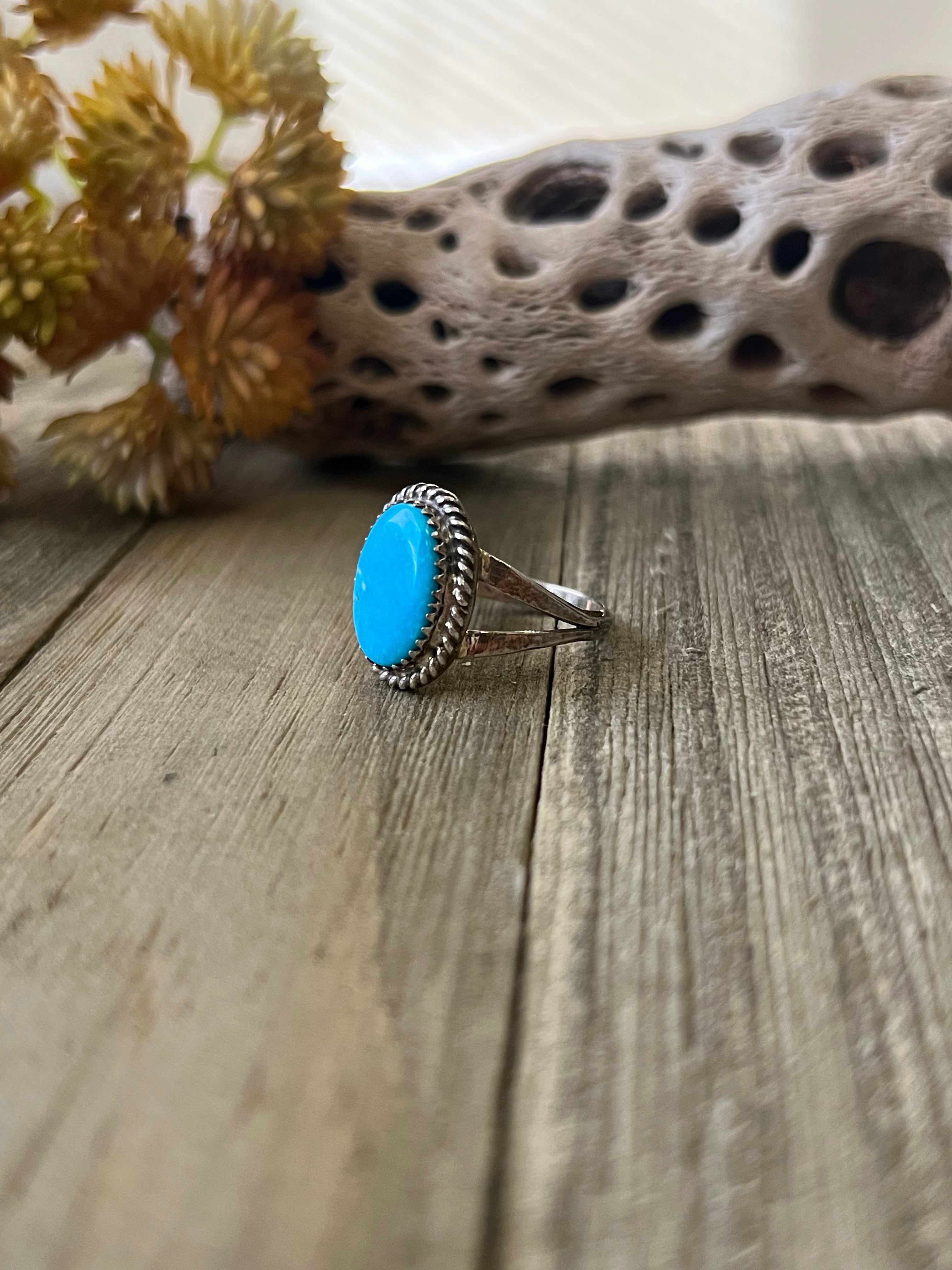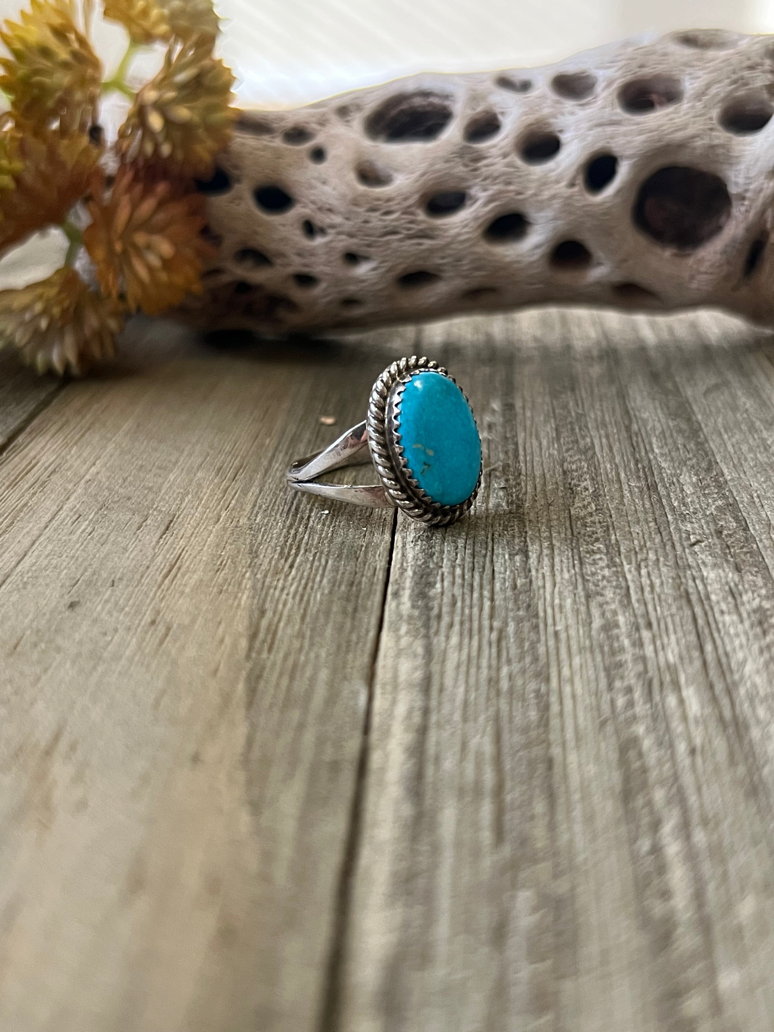 Navajo Made Kingman Turquoise & Sterling Silver Ring Size 8. It measures 3/4 of an inch long and 1/2 of an inch wide. Signed by artist and stamped sterling silver.