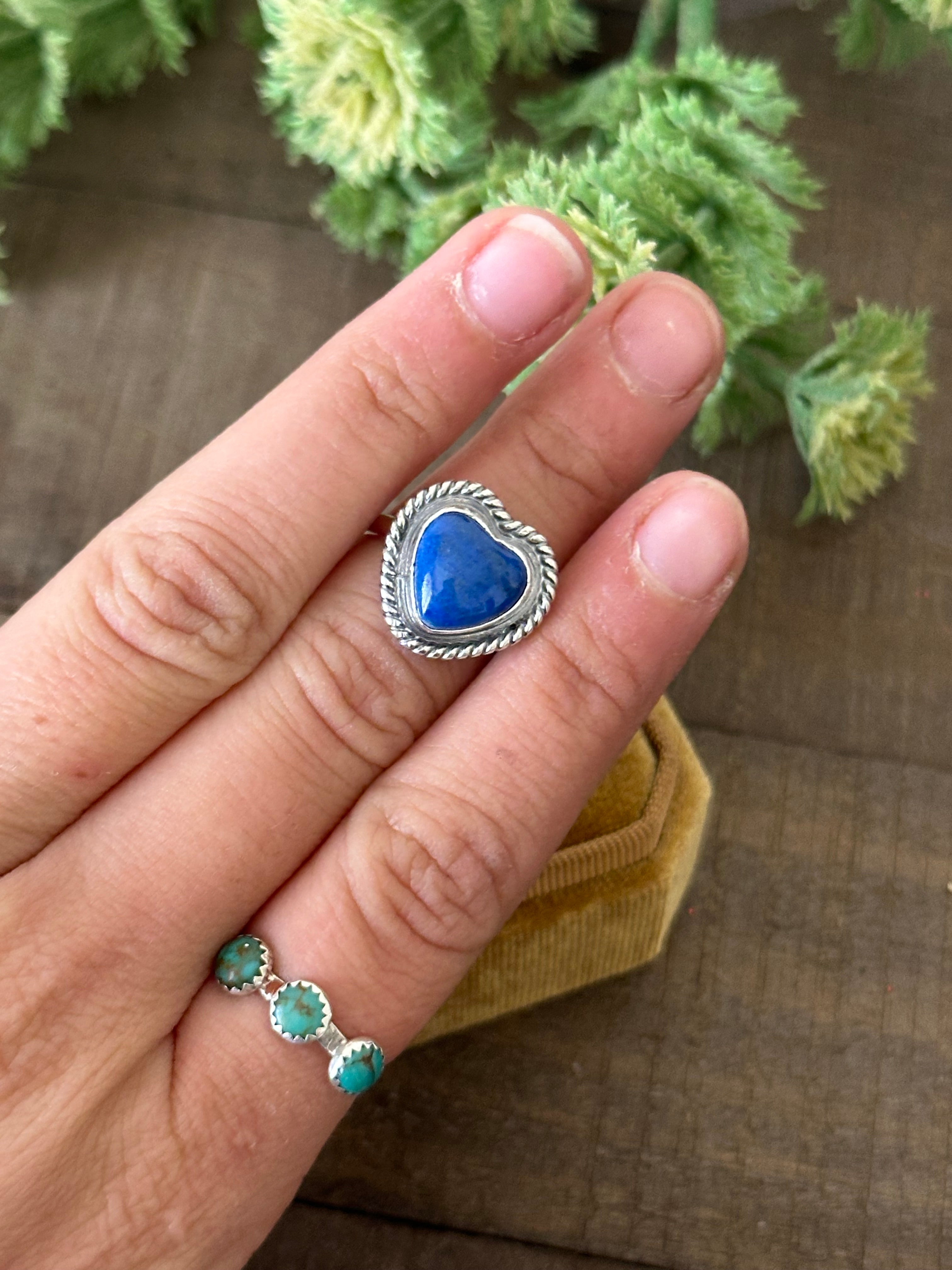 Navajo Made Lapis & Sterling Silver Heart Adjustable Ring. It measures 5/8 of an inch round. Signed by artist and stamped sterling silver. Stones will differ due to natural stones.