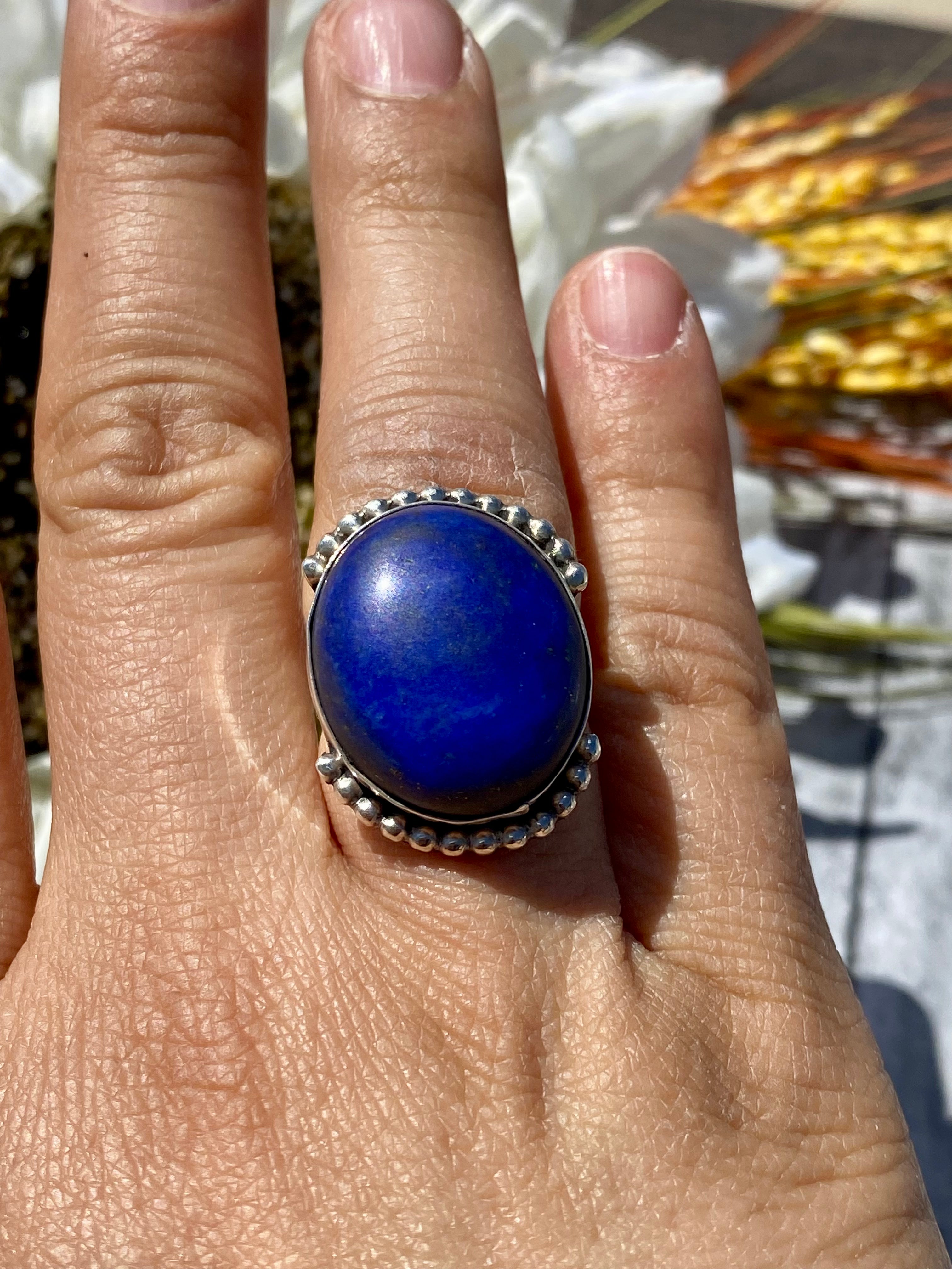 Navajo Made Lapis & Sterling Silver Ring Size 7. It measures 1 inch long and 3/4 of an inch wide.