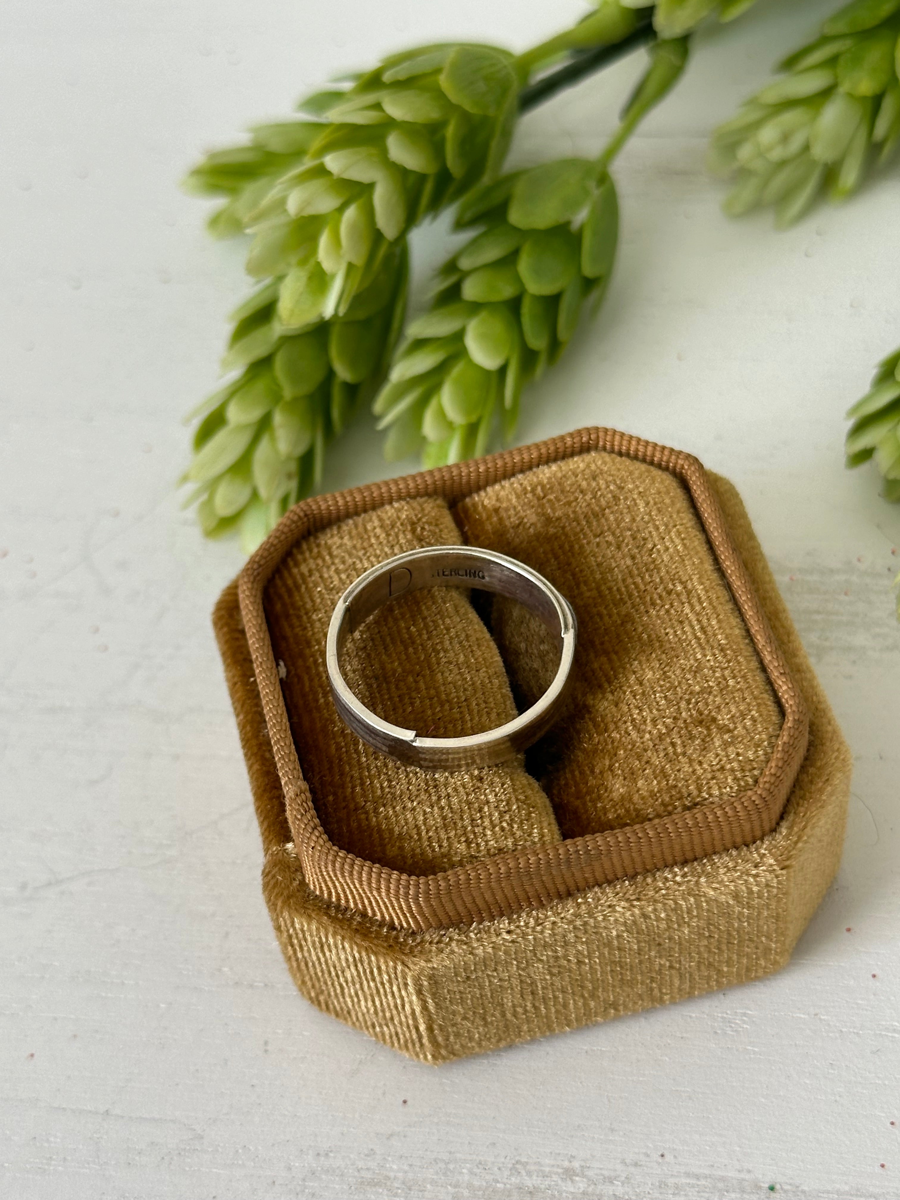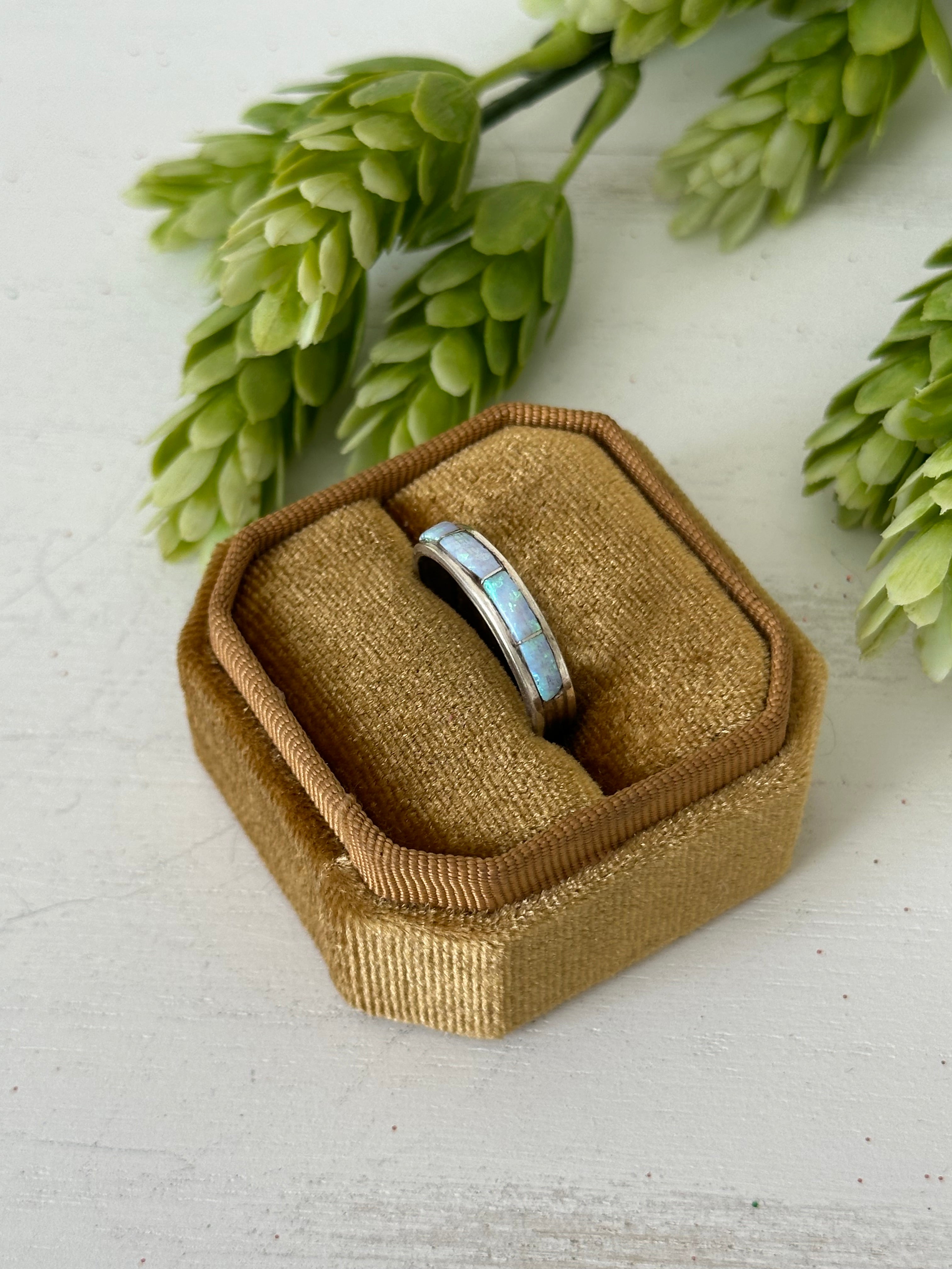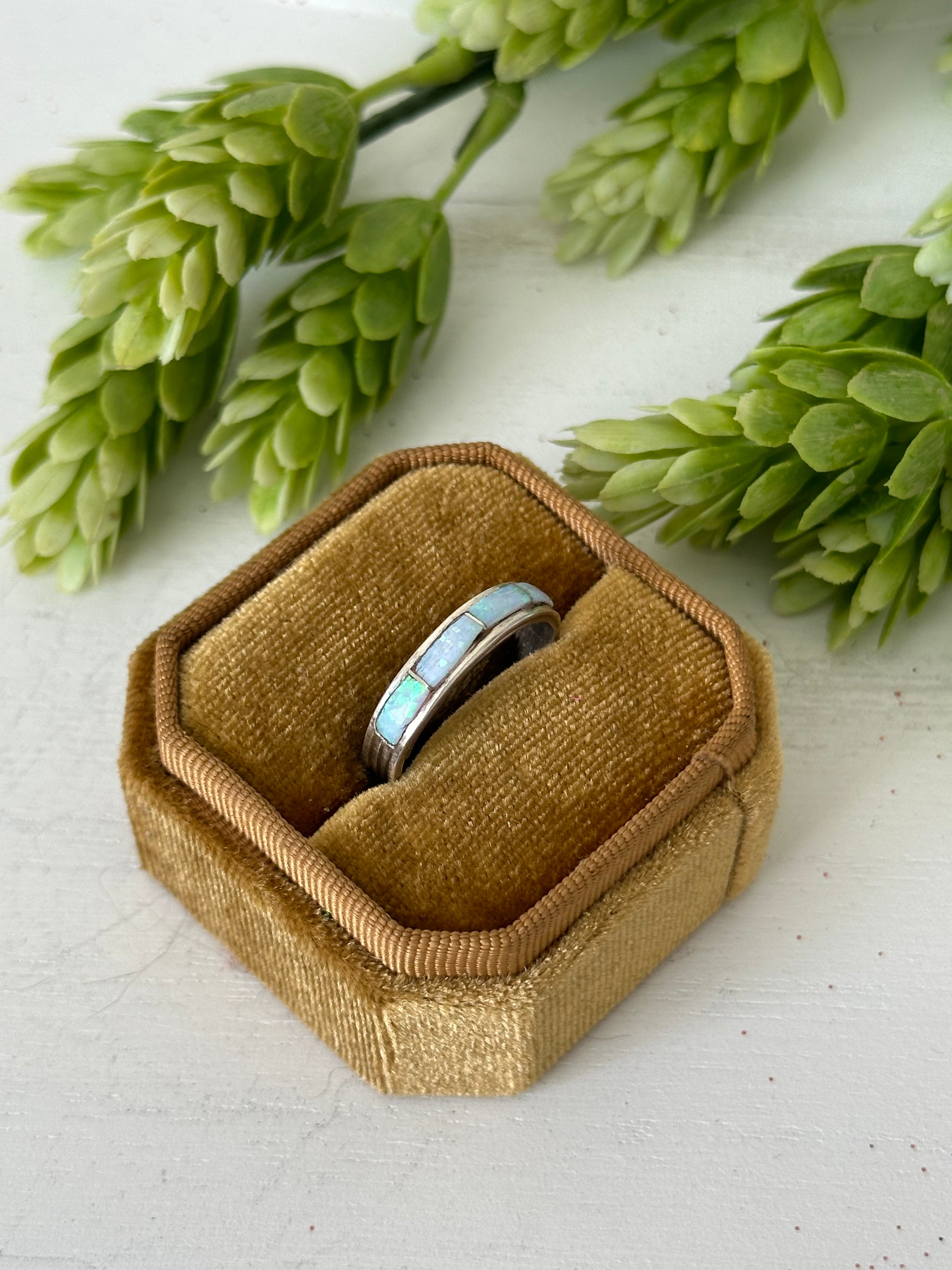 Navajo Made Opal (Man-Made) & Sterling Silver Ring. It measures just under 1/4 of an inch long. Signed by the artist and stamped sterling silver.