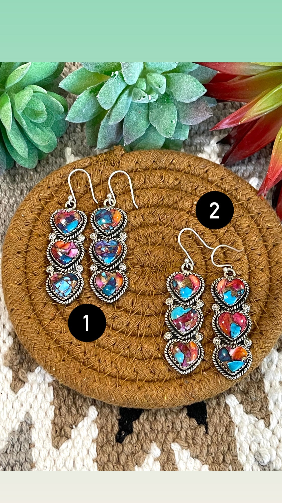 Breathtaking earrings. Southwest Handmade Pink Mohave & Sterling Silver Post Dangle Heart Earrings. It measures 1 1/8 inches long and just under 5/8 of an inch wide. Signed by the artist and stamped sterling silver.