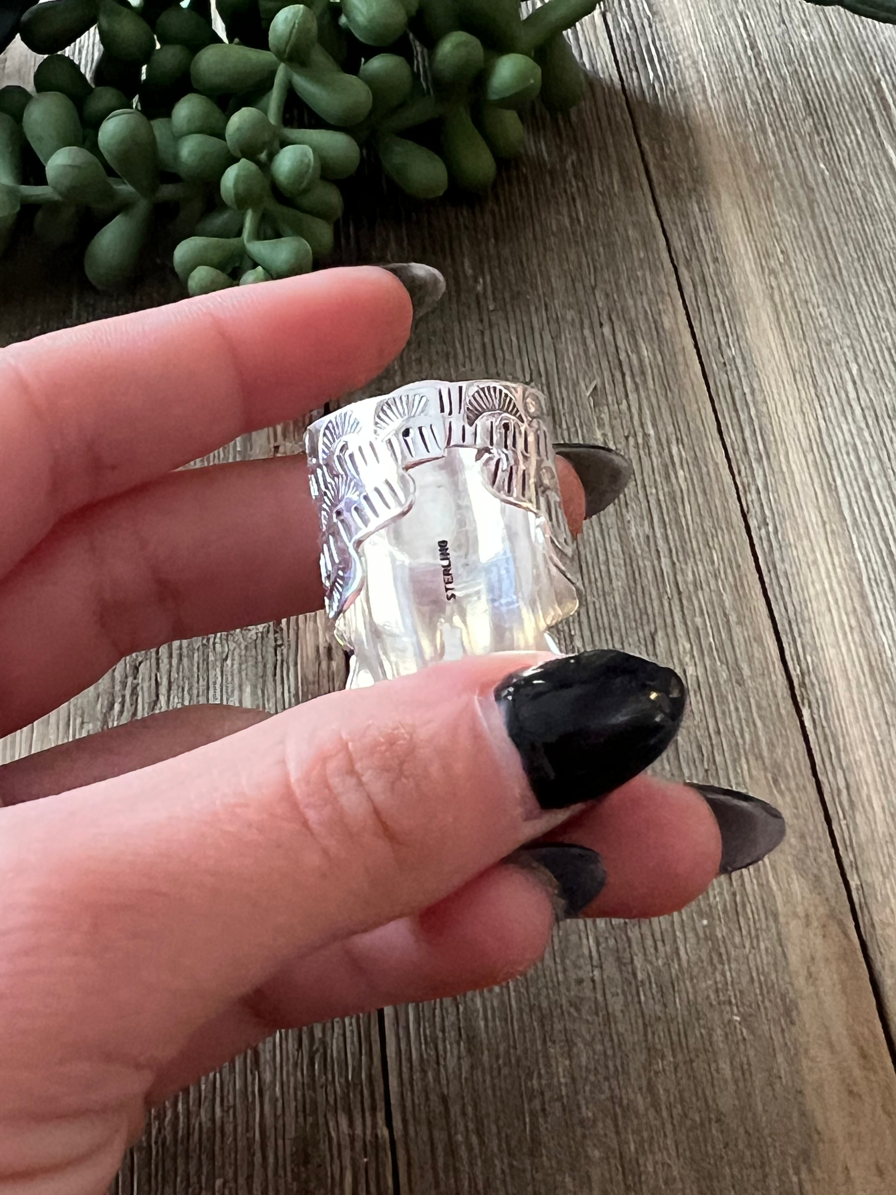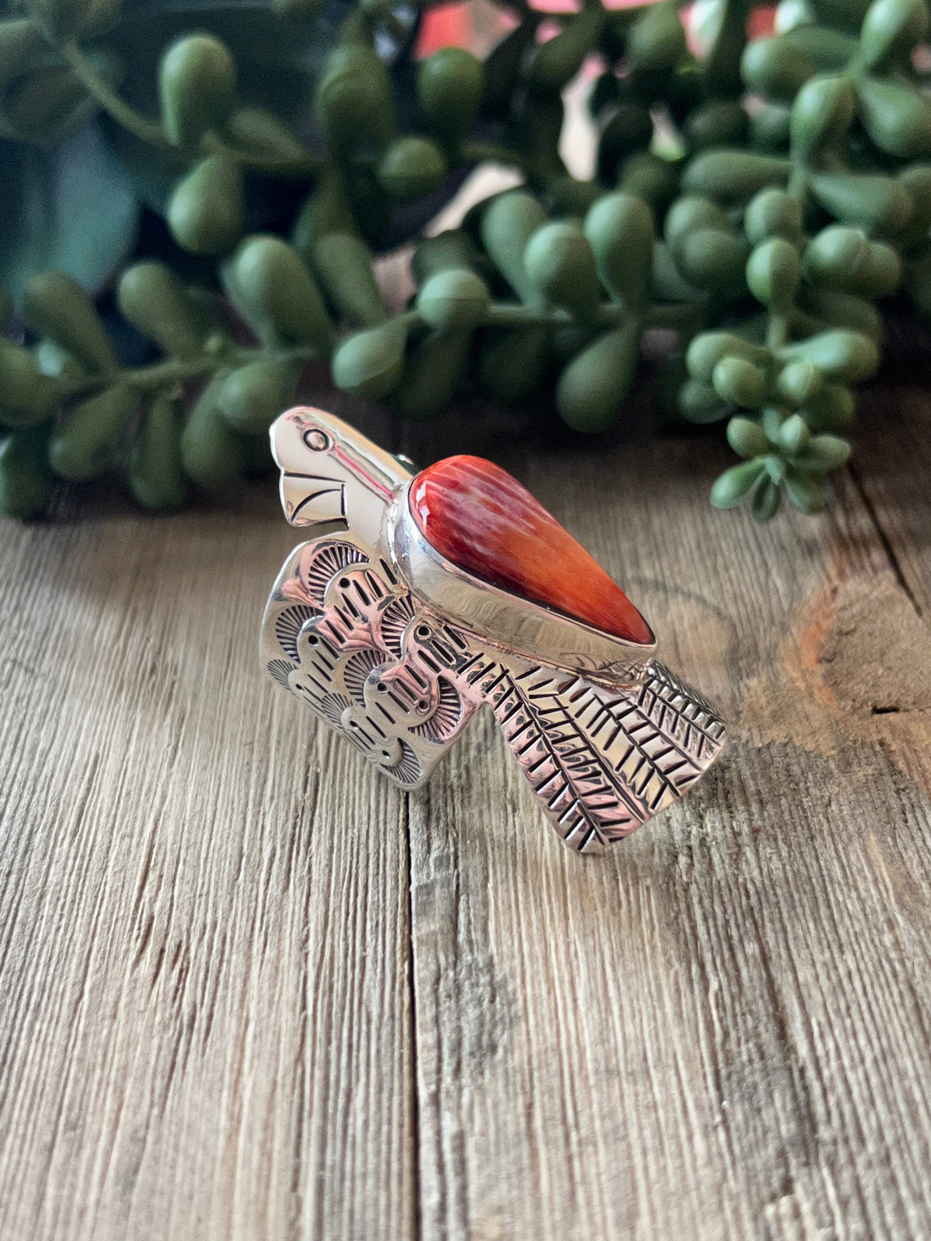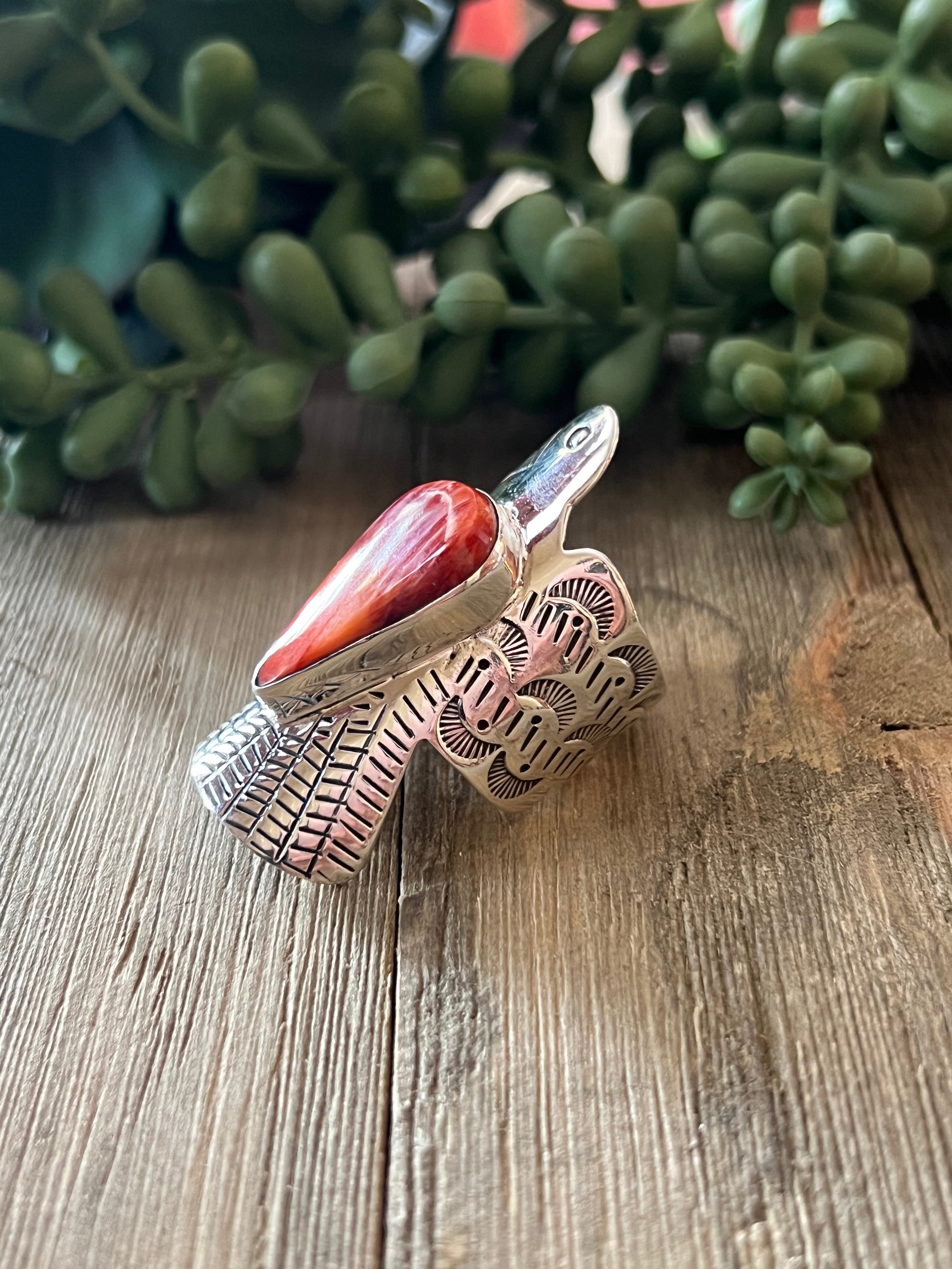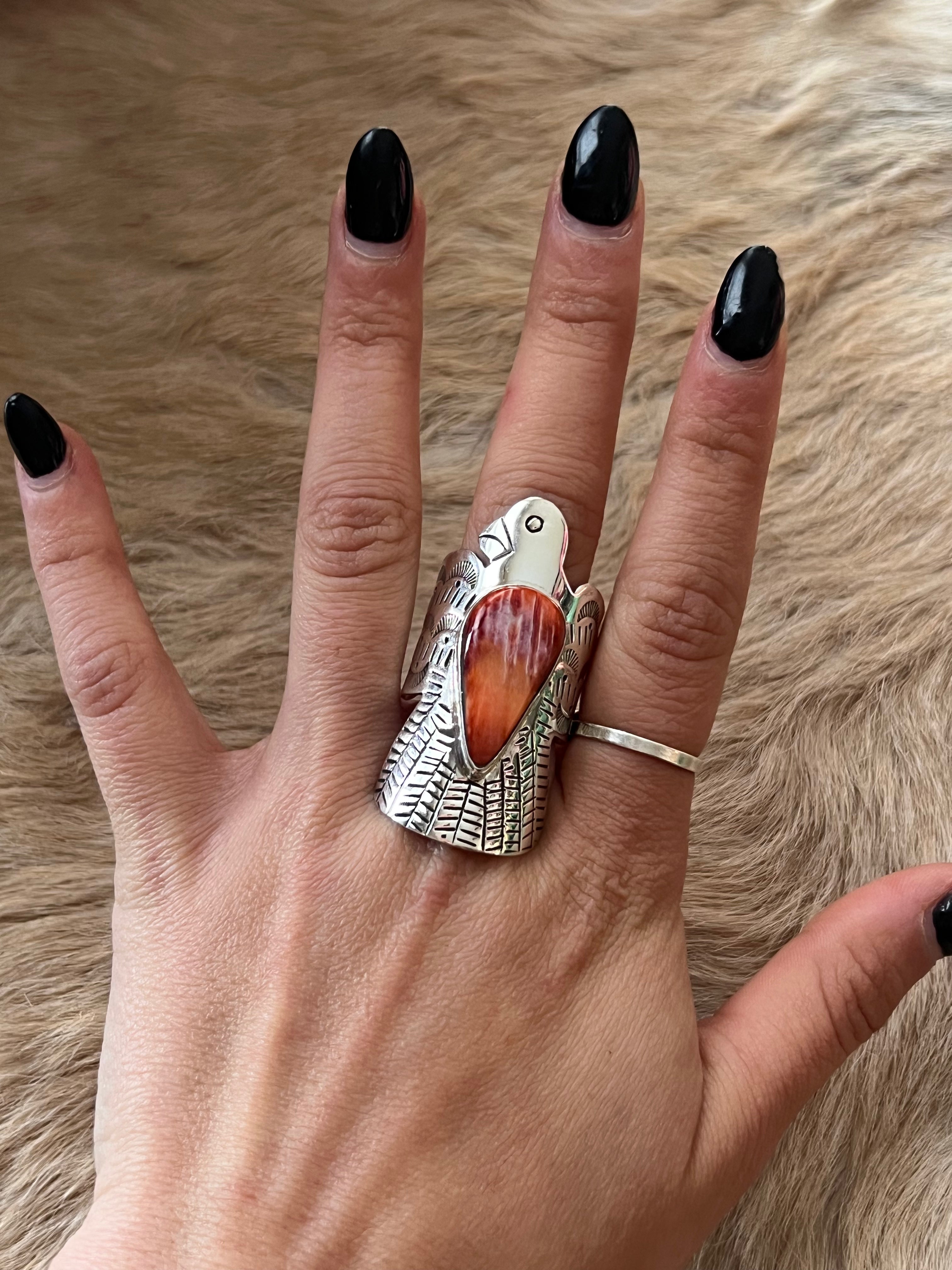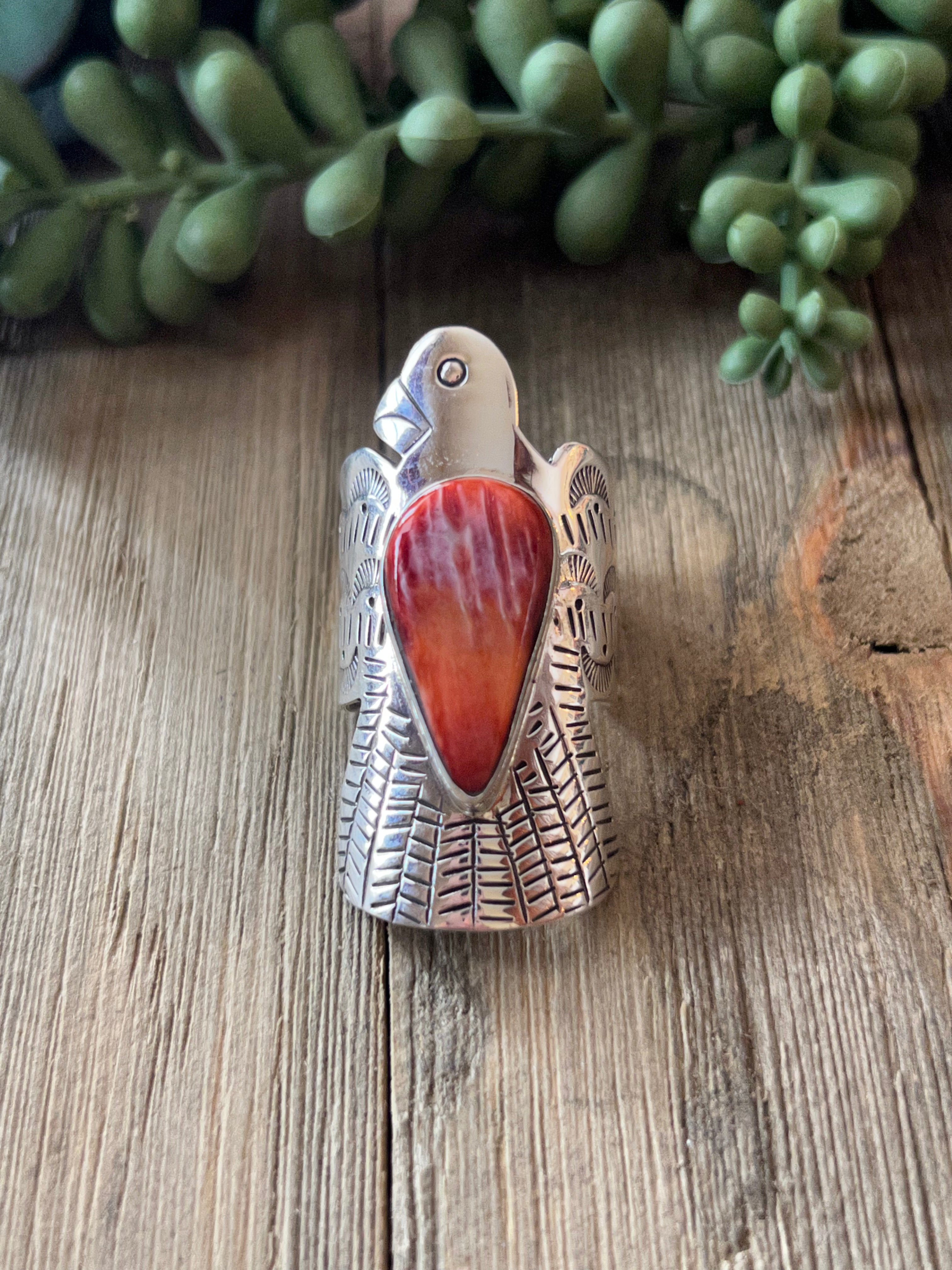 Navajo Made Spiny Oyster & Sterling Silver Thunderbird Ring Size 10.75