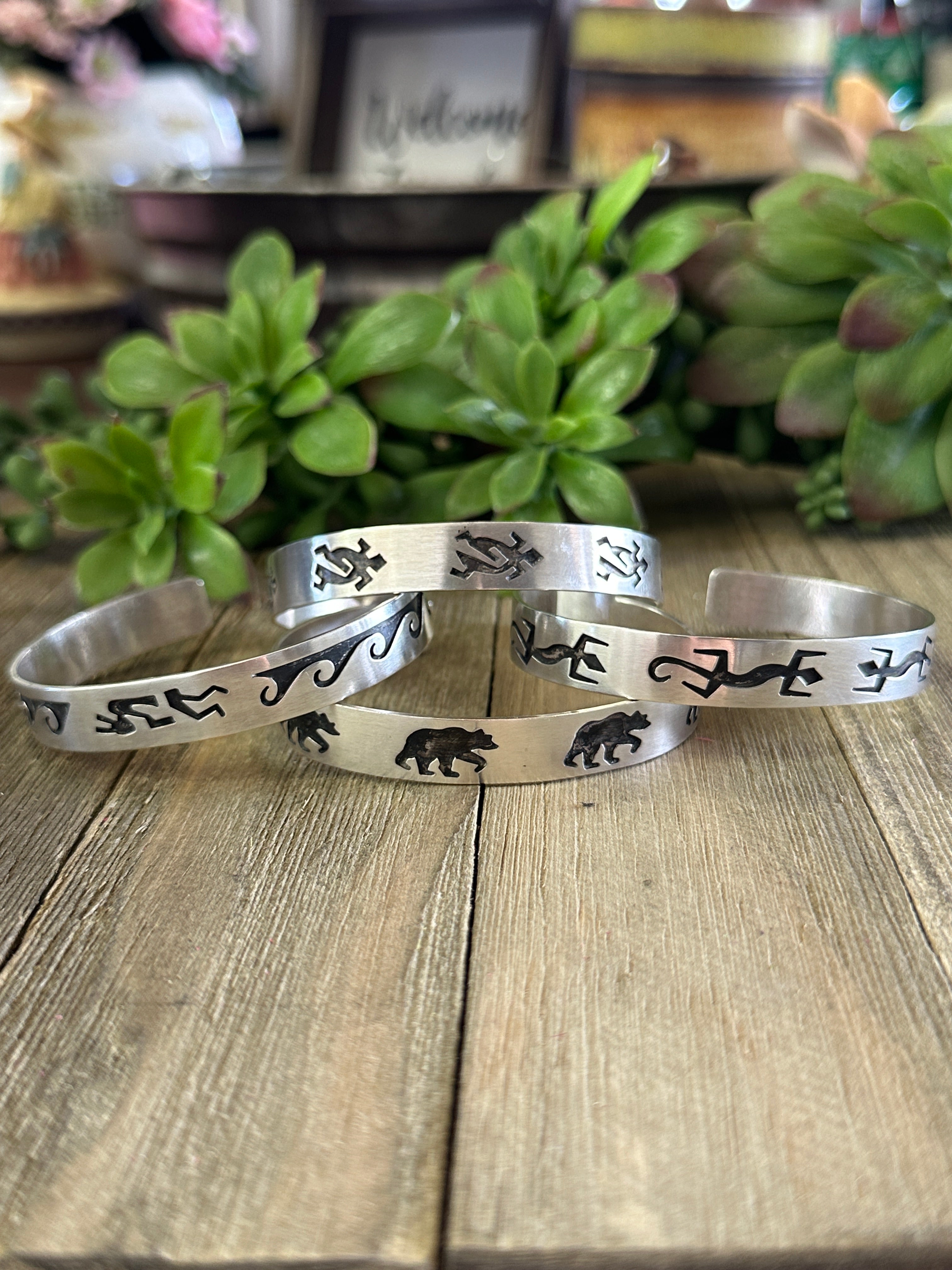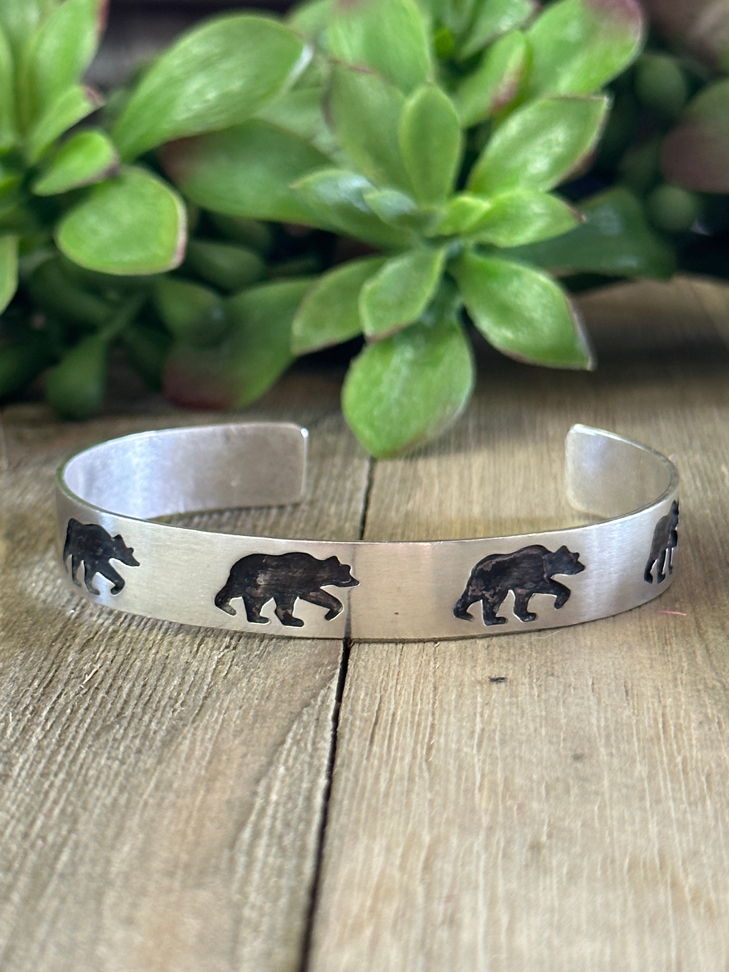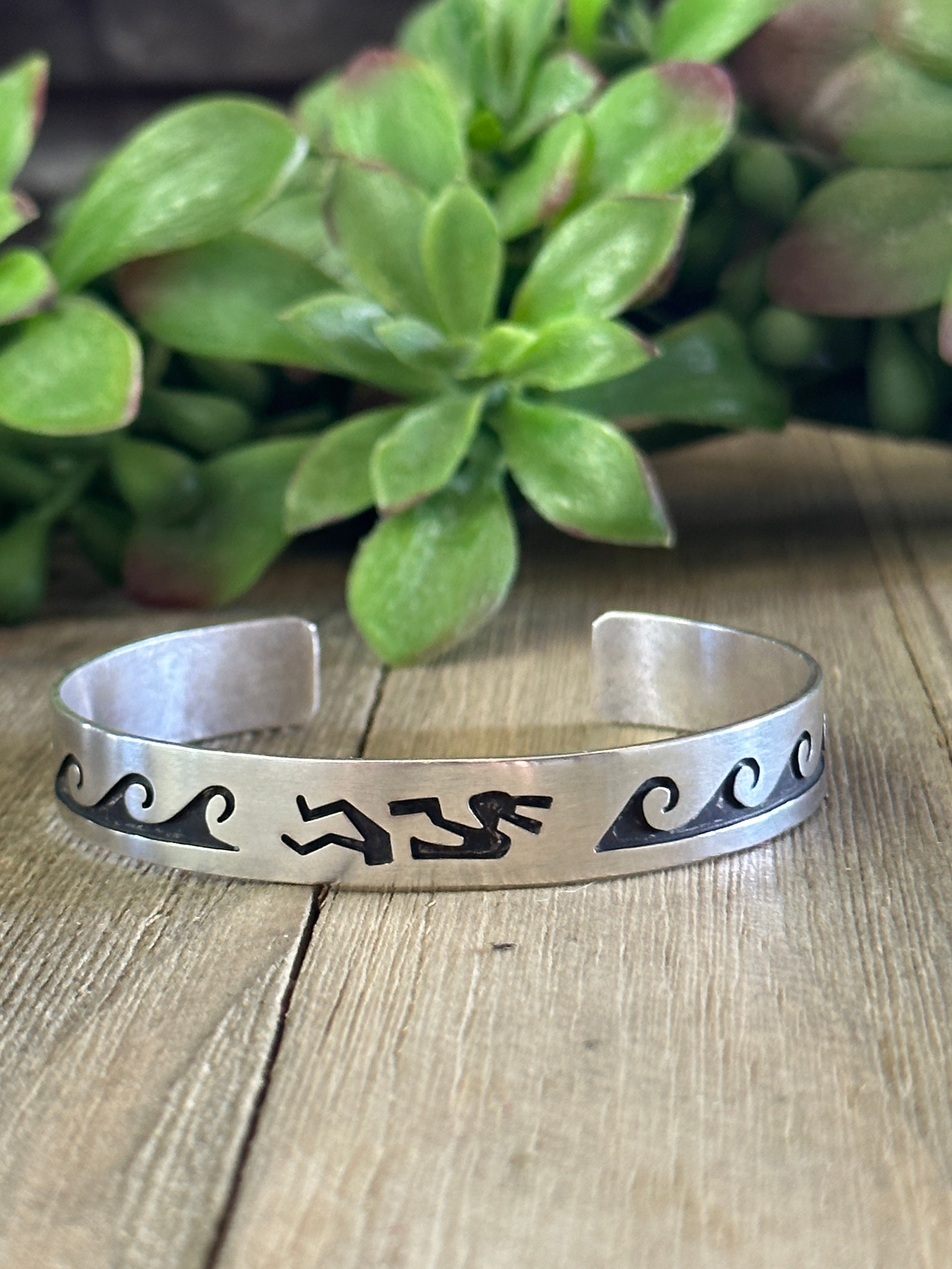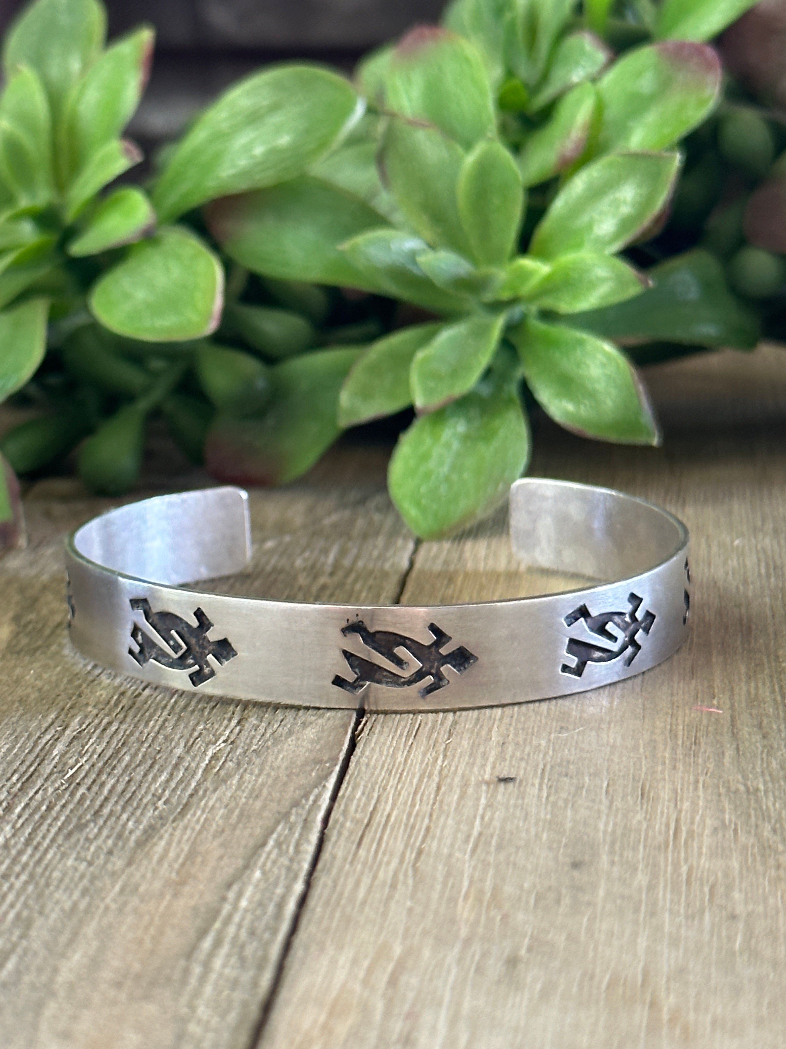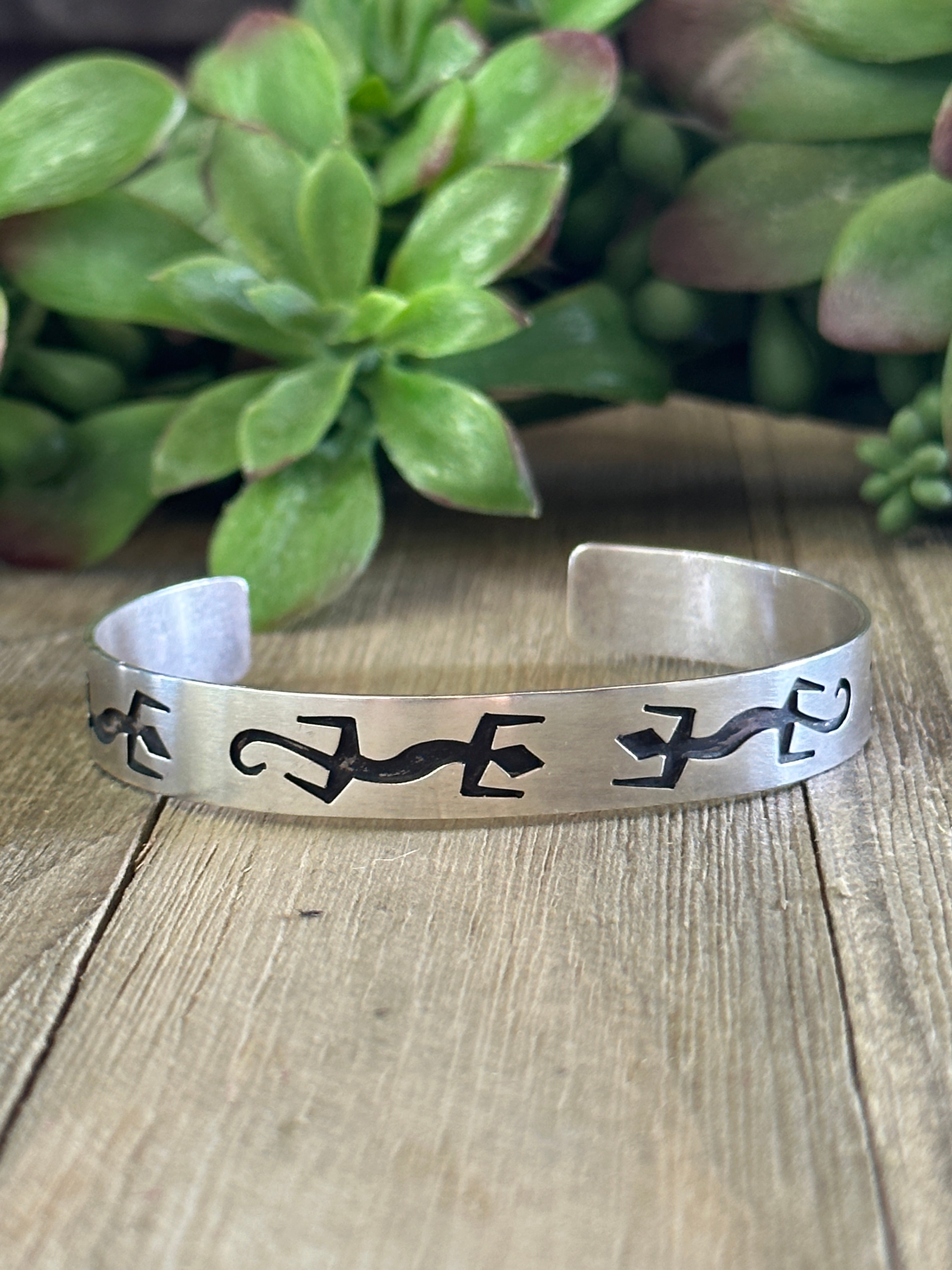 Navajo Made Sterling Silver Cuff Bracelet. It measures just over 3/8 of an inch wide with an inside circumference of 5 3/4 inches and a gap of 1 inch. Signed by the artist and stamped sterling silver.