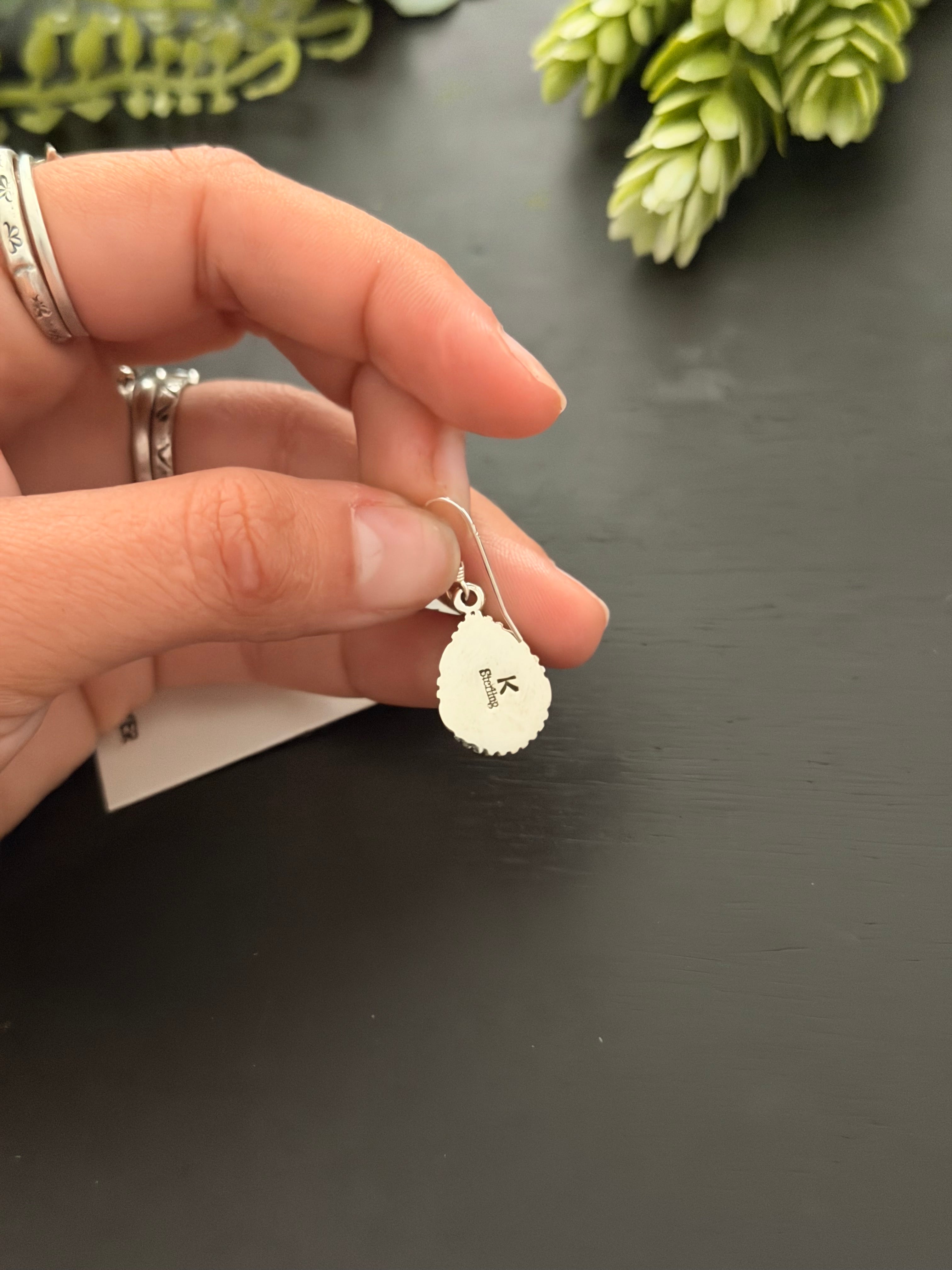 Navajo Made White Buffalo & Sterling Silver Dangle Earrings. It measures just over 1 1/8 inches long and just under 1/2 of an inch wide. Signed by artist and stamped sterling silver.