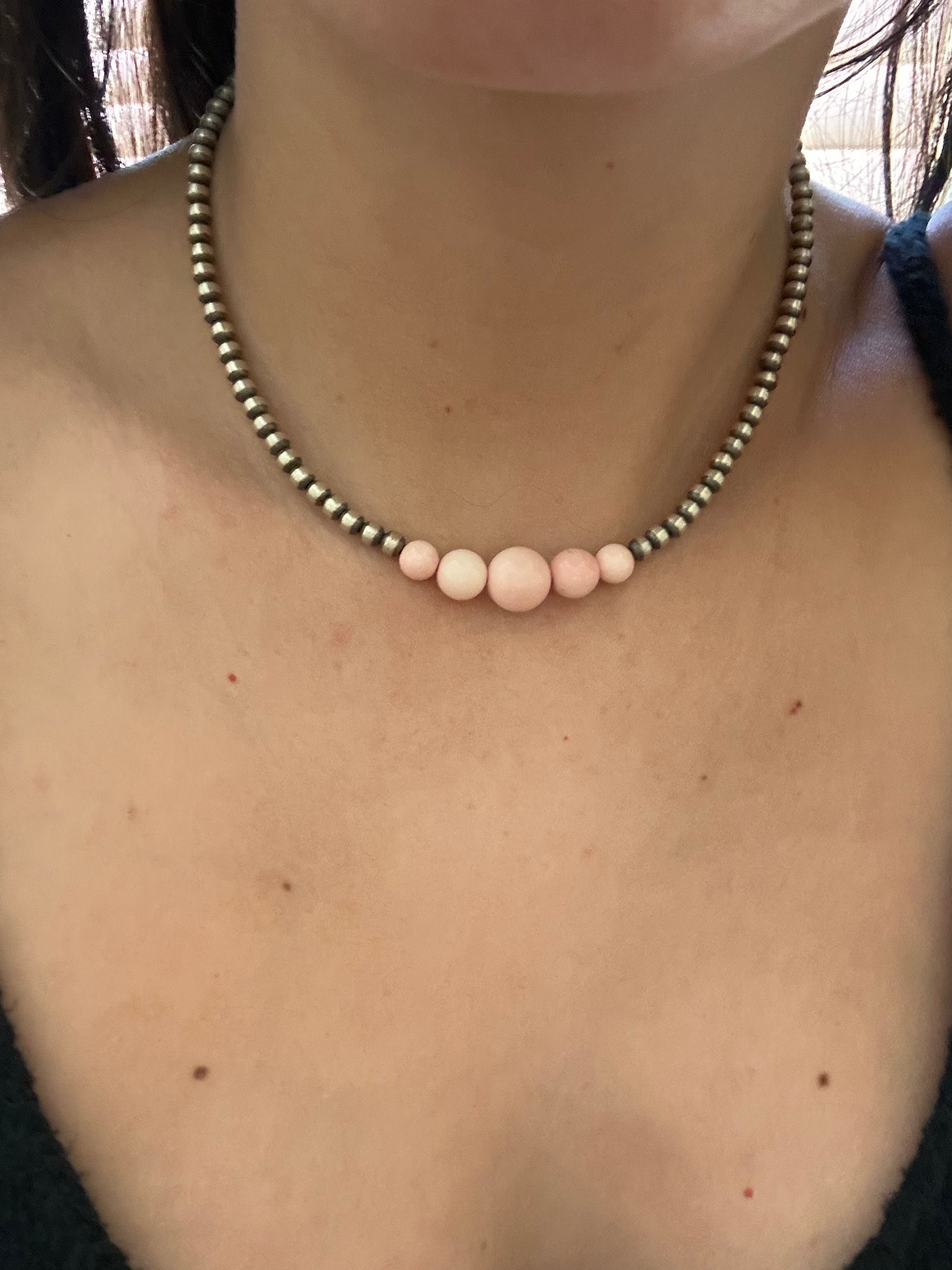Navajo Strung Pink Conch & Sterling Silver 4 MM Pearls Beaded Necklace. It measures 14 inches long.