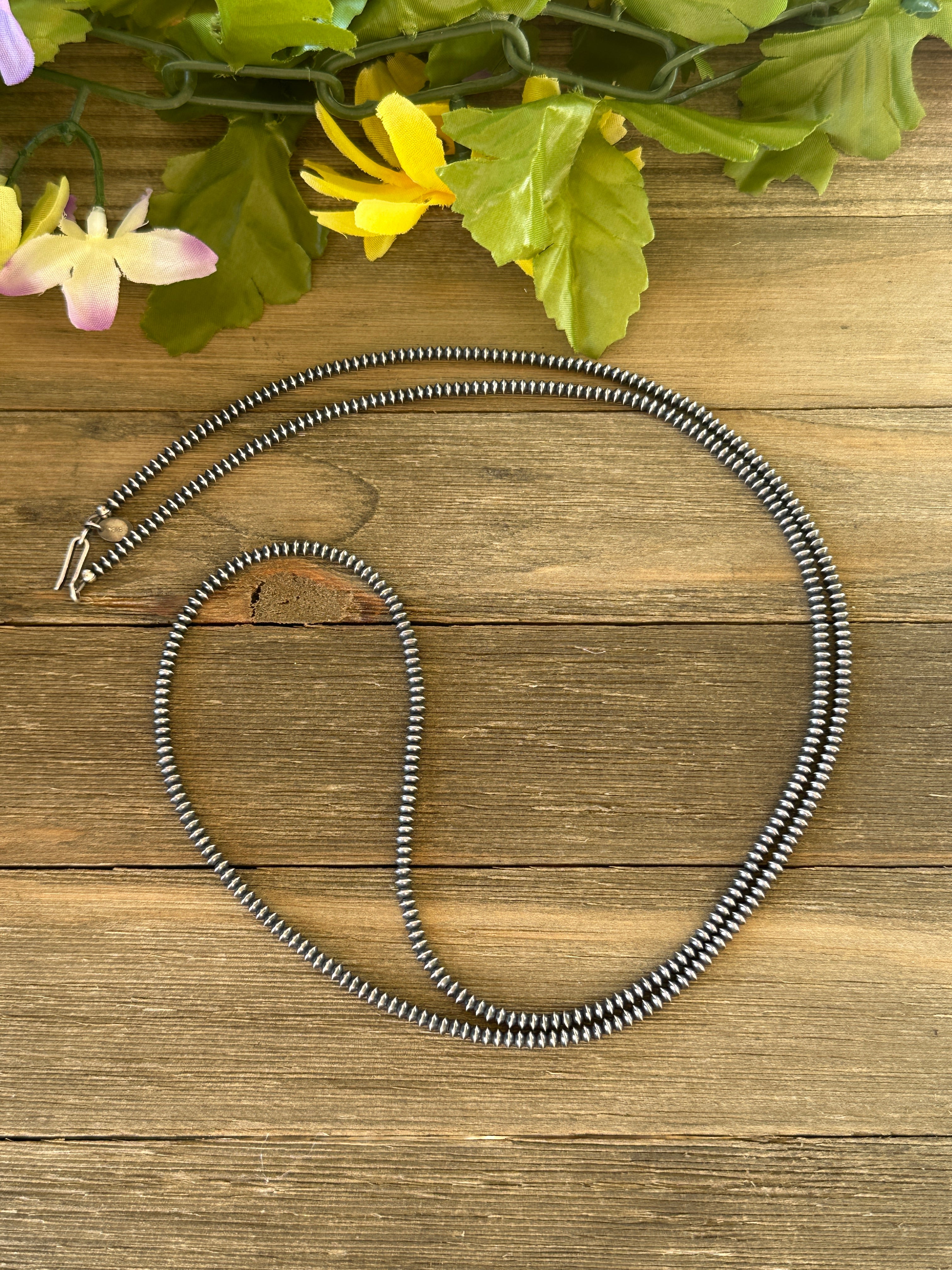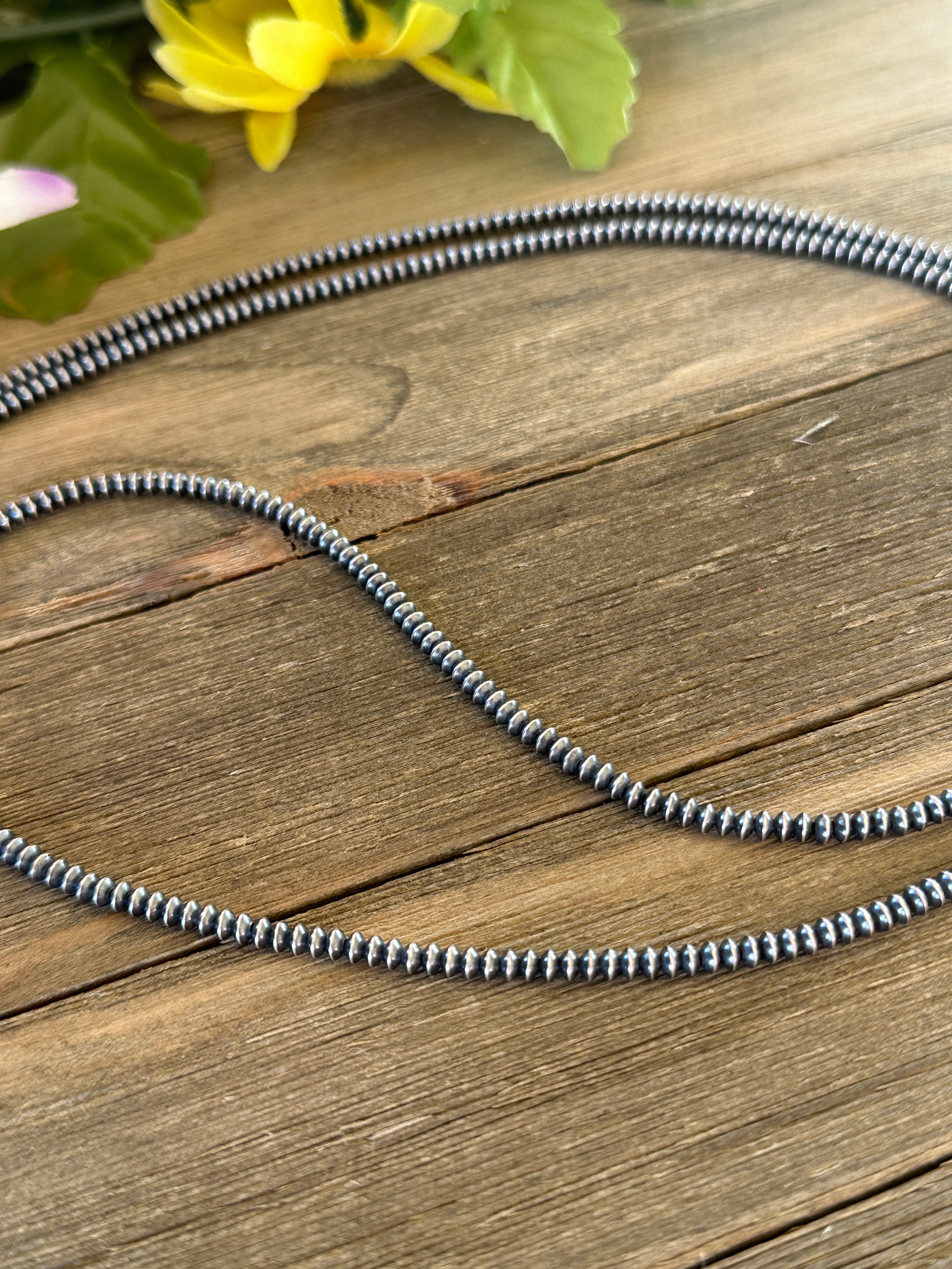 Navajo Strung Sterling Silver 3 MM Saucer Pearl Necklace. They measure 36 inches long. Stamped sterling silver.