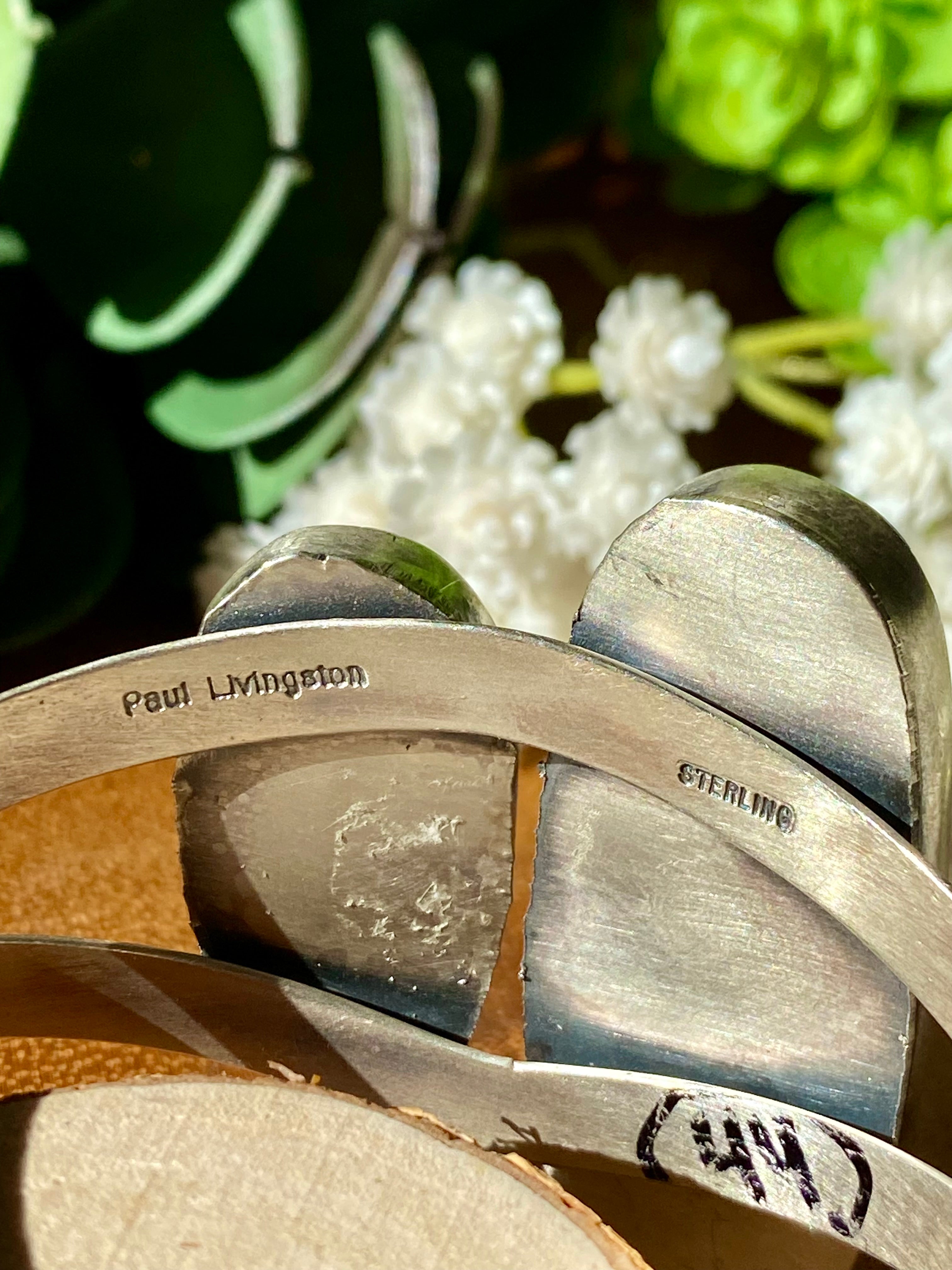 Paul Livingston Mixed Turquoise & Sterling Silver Cuff Bracelet. It measures just over 1 3/4 inches wide with an inside circumference just over 5 5/8 inches and a gap of 1 1/8 inch. Signed by the artist and stamped sterling silver.