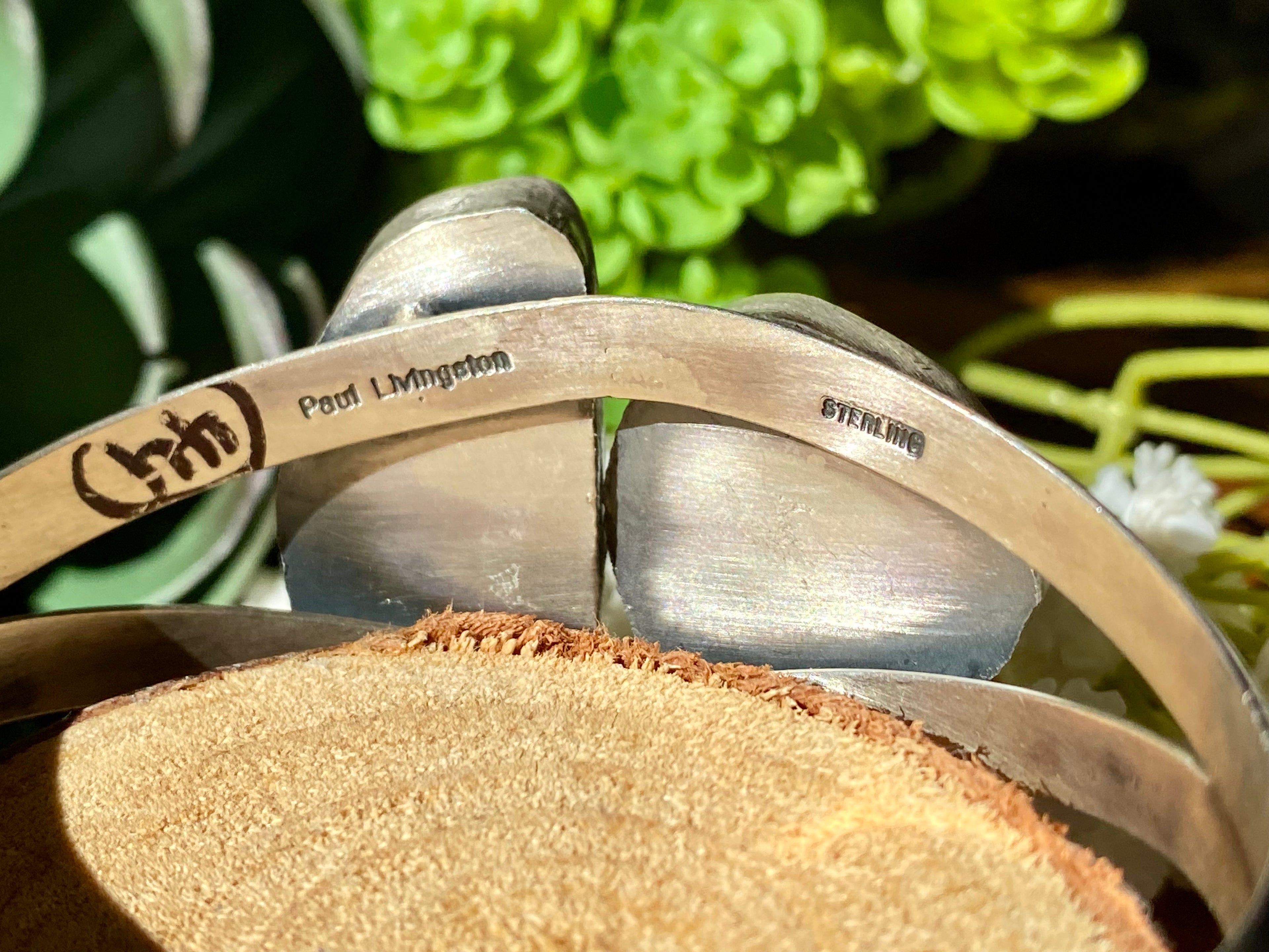 Paul Livingston Mixed Turquoise & Sterling Silver Cuff Bracelet. It measures just over 1 1/2 inches wide with an inside circumference just over 5 5/8 inches and a gap just under 1 1/2 inches. Signed by the artist and stamped sterling silver.