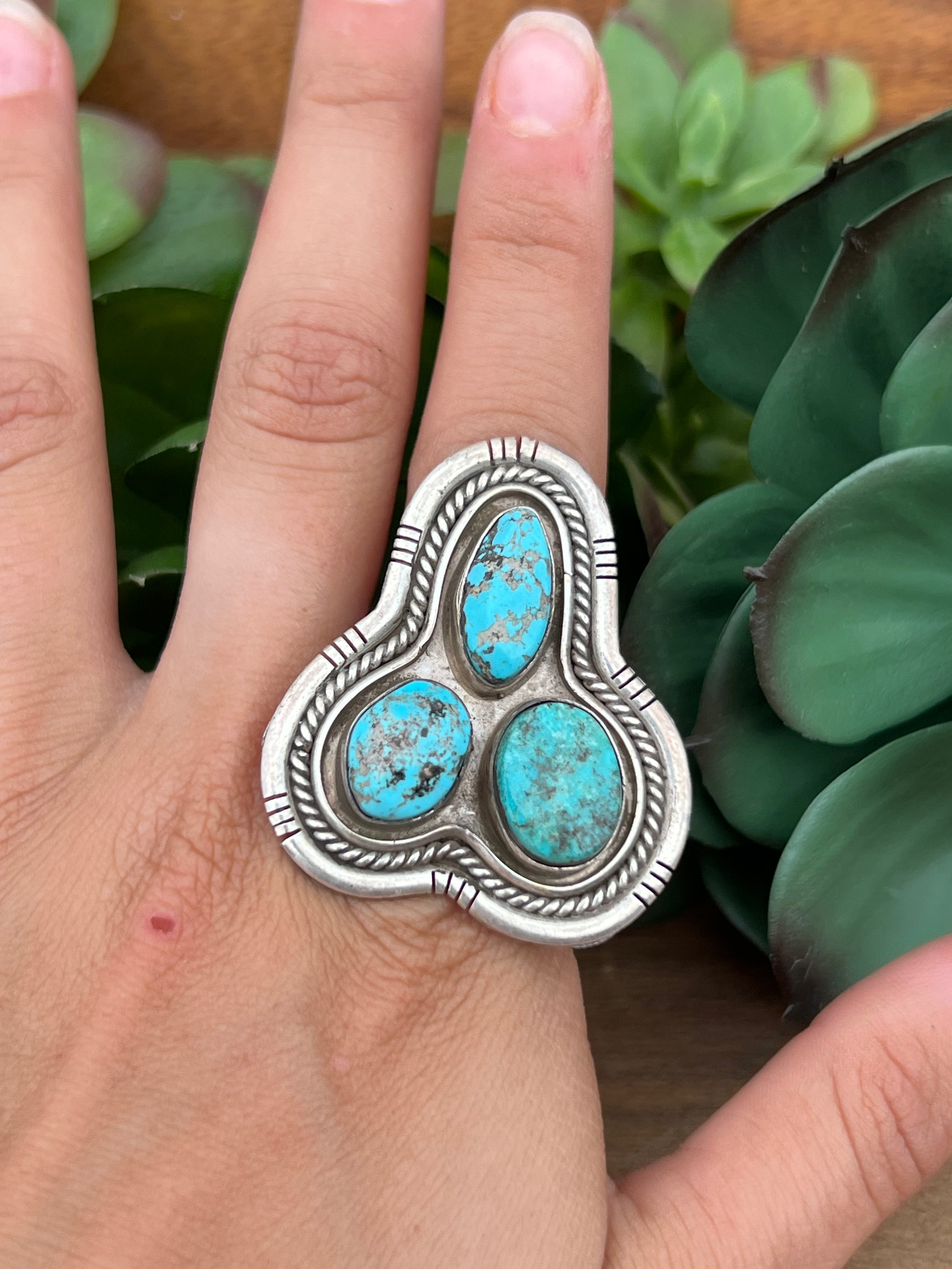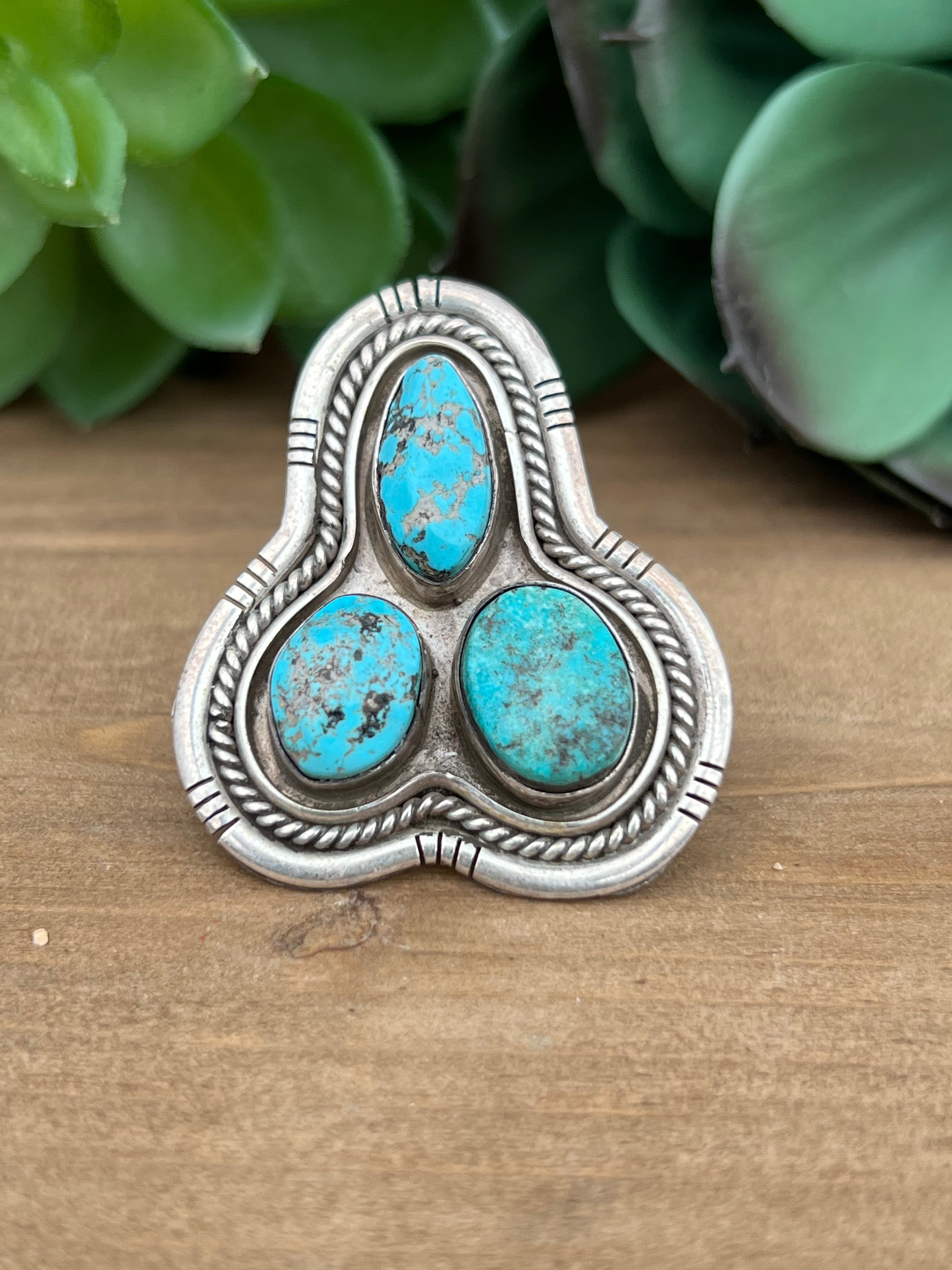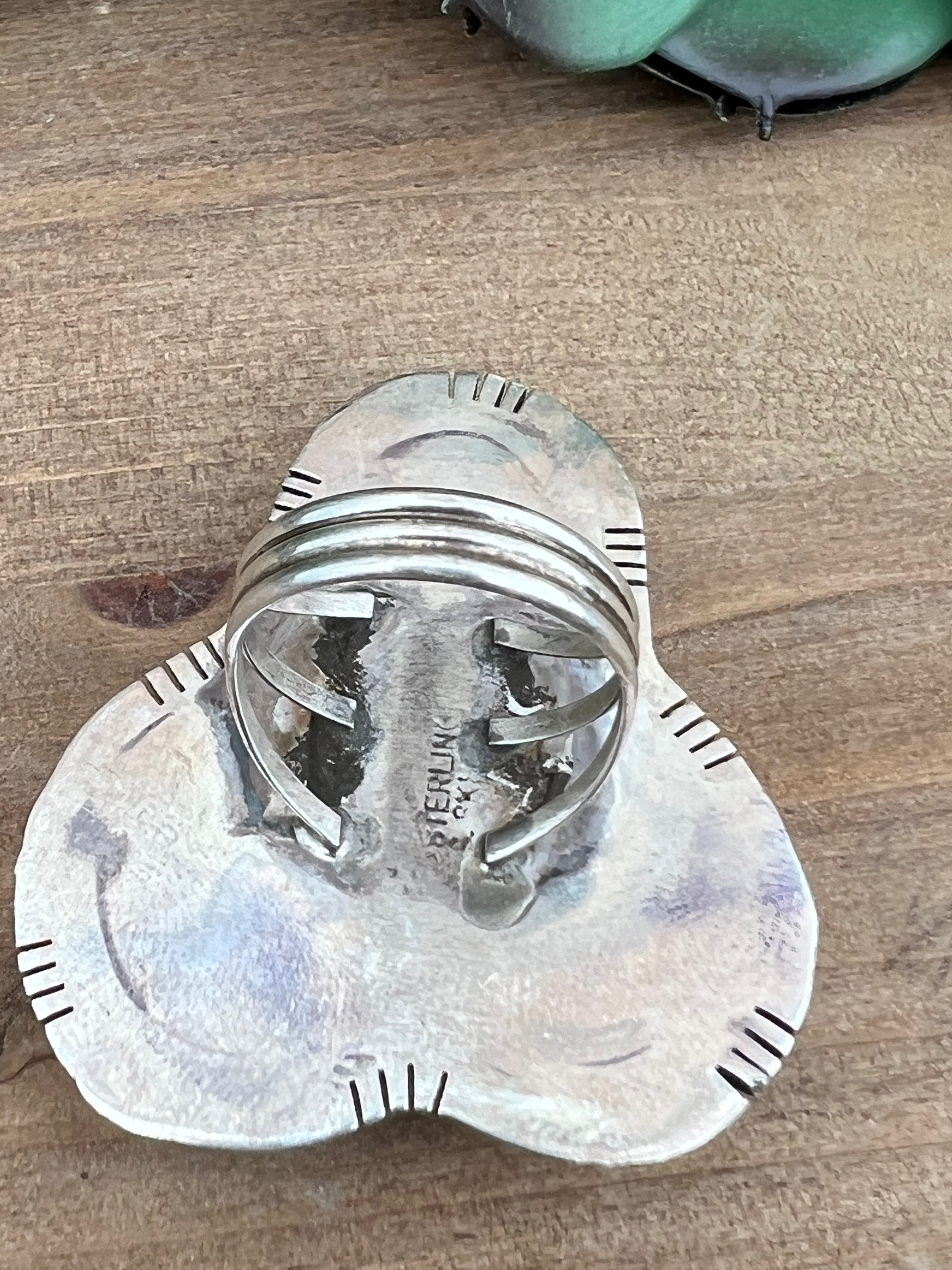 Scott Skeets Kingman Turquoise & Sterling Silver Ring Size 7. It measure 1 1/2 inches long & 1 3/8 inches wide. Signed by the artist and stamped sterling silver.