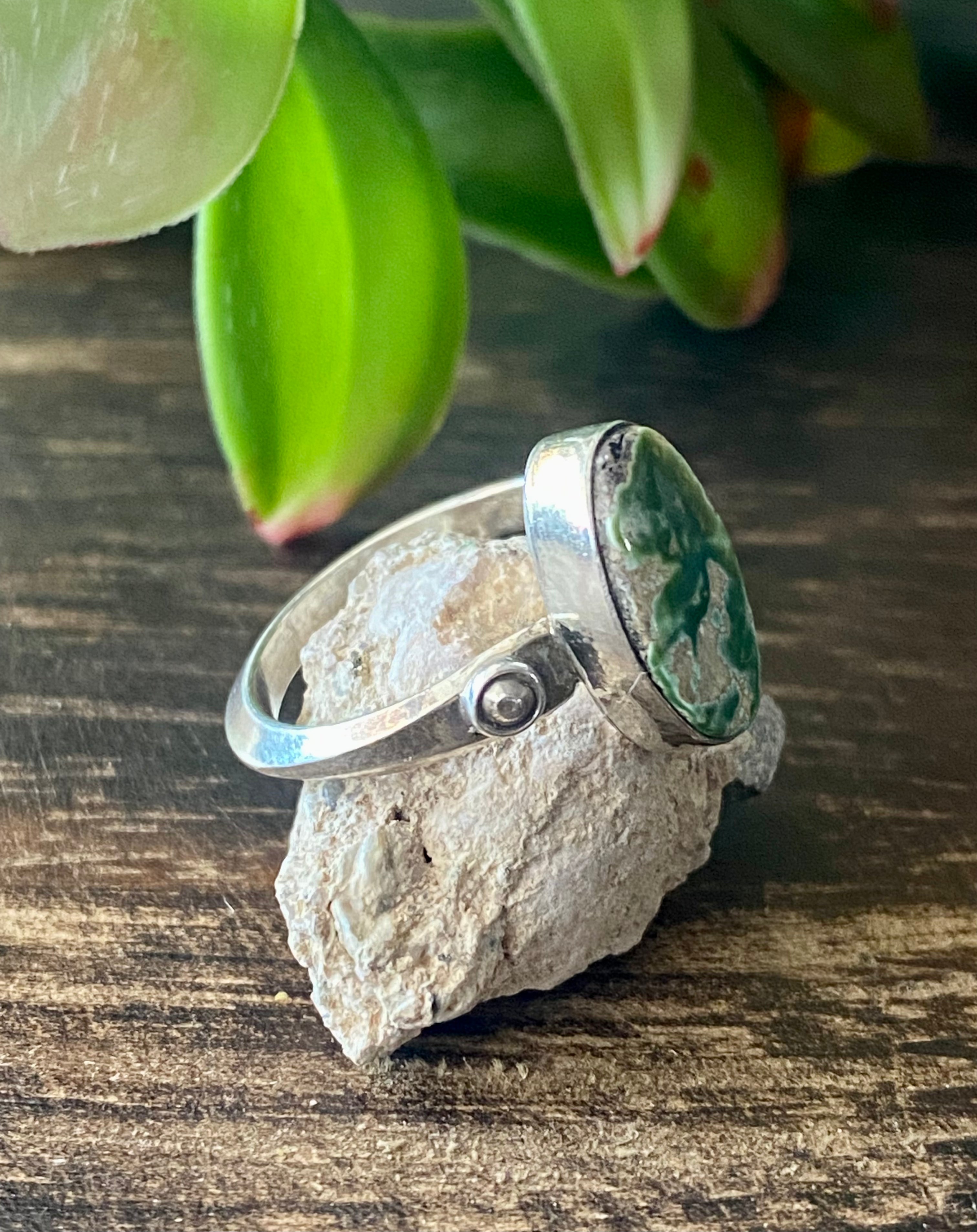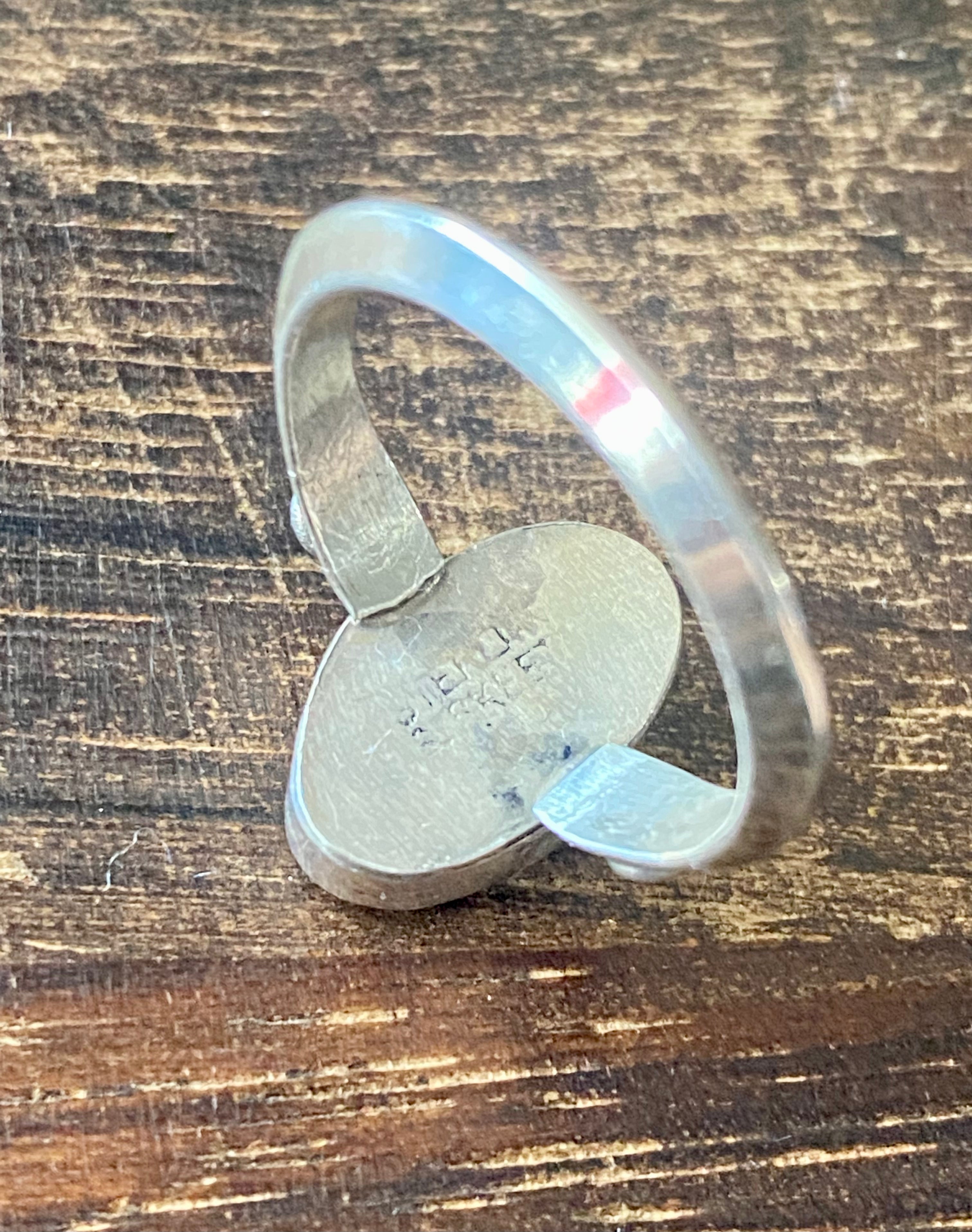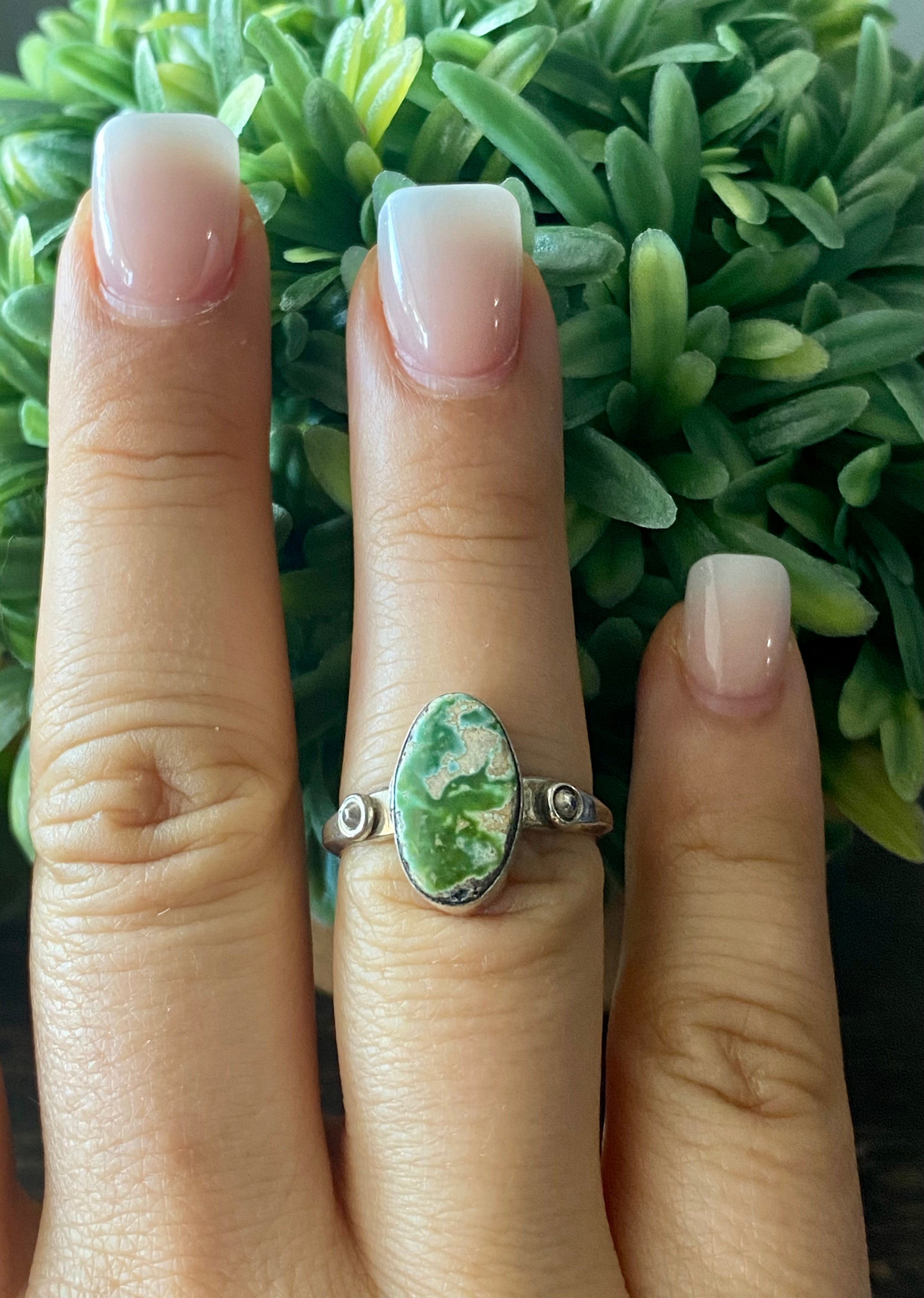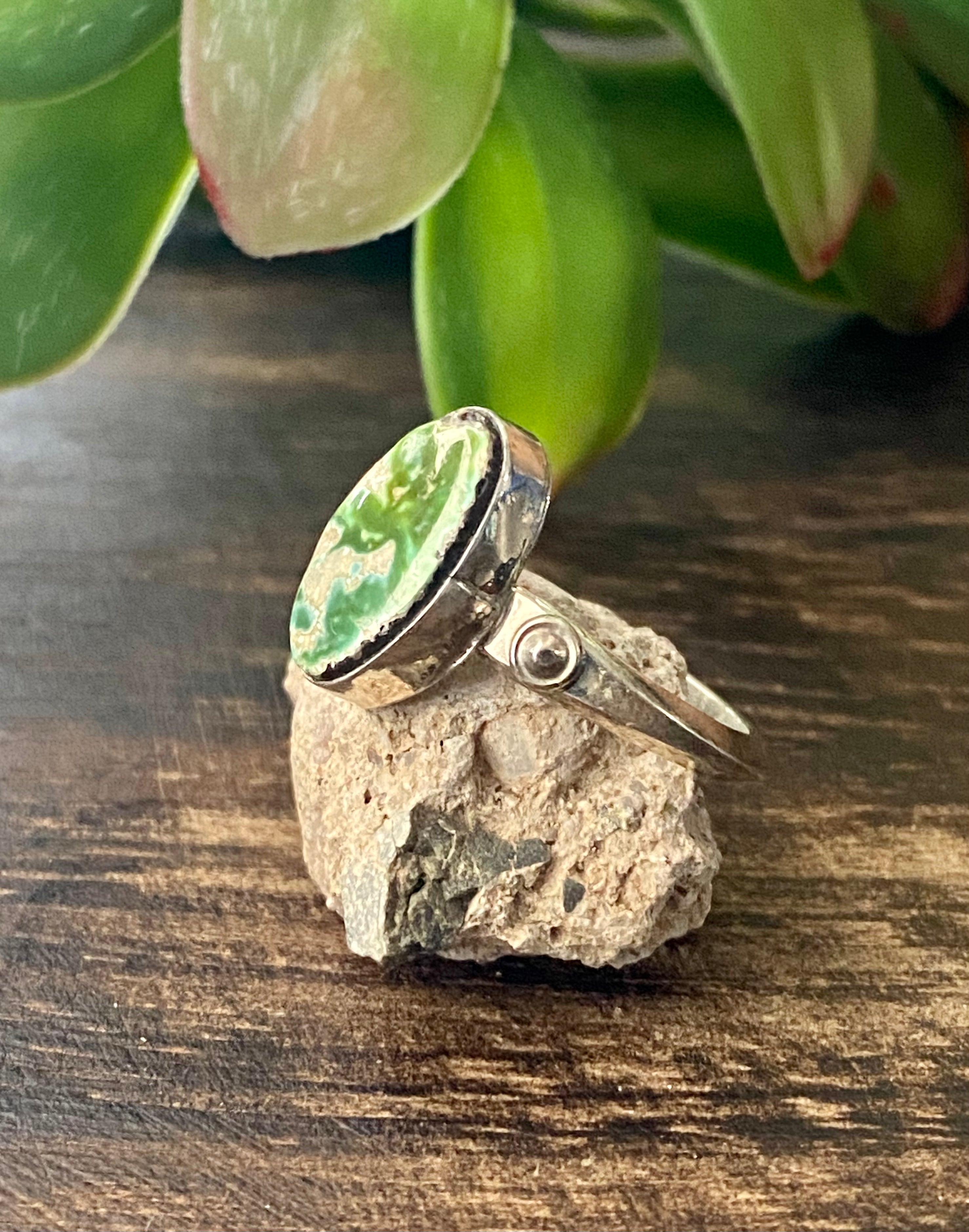 Scott Skeets Sonoran Gold Turquoise & Sterling Silver Ring Size 8.25. It measures 5/8 of an inch long and 3/8 of an inch wide. Signed by the artist and stamped sterling silver.