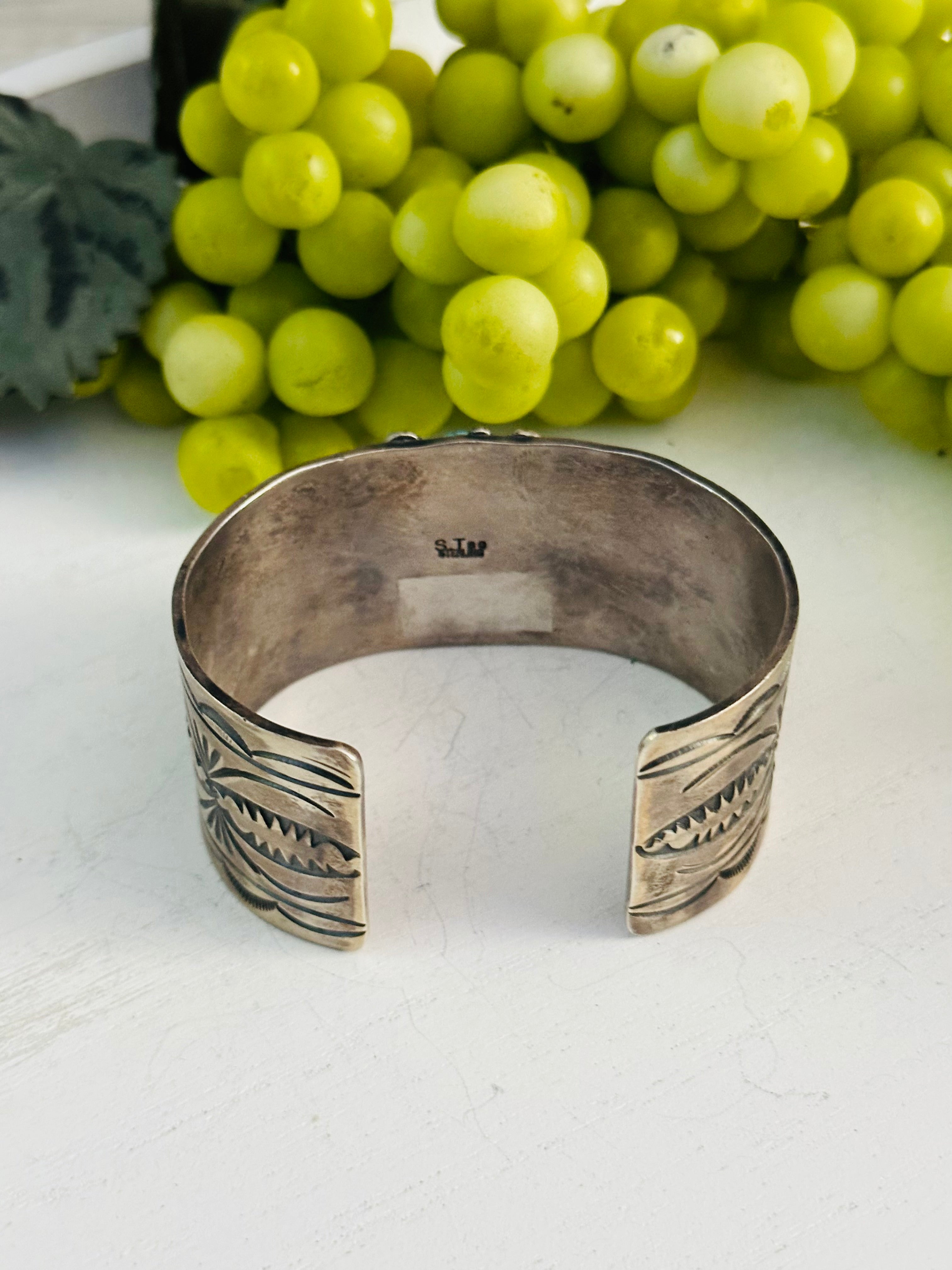 Shelia Tso Birds Eye Kingman Turquoise & Sterling Silver Cuff Bracelet. It measures 1 1/4 inches wide with an inside circumference of 5 3/4 inches and a gap of 1 inch. Signed by artist and stamped sterling silver.