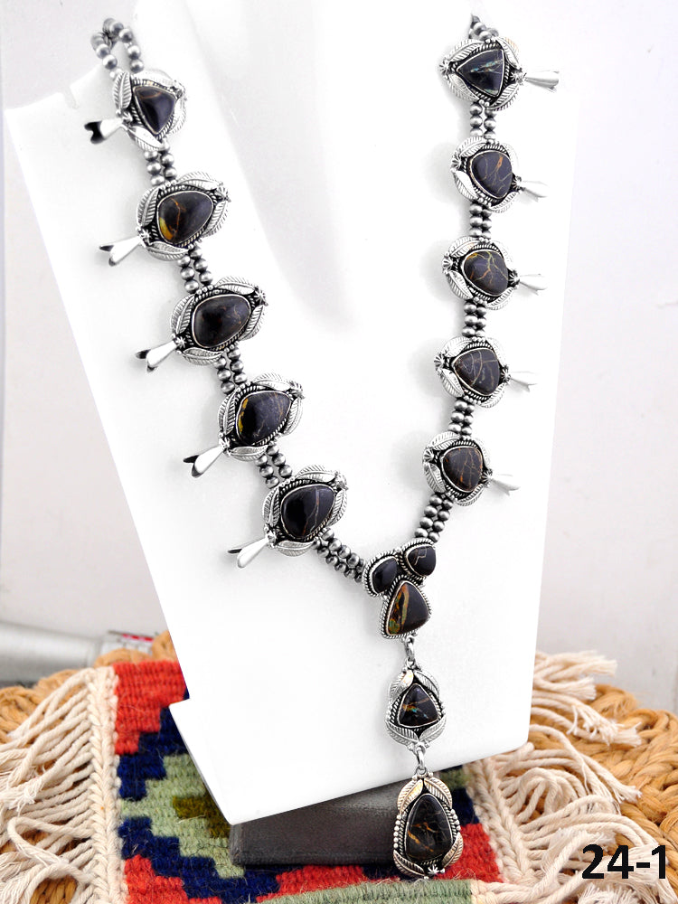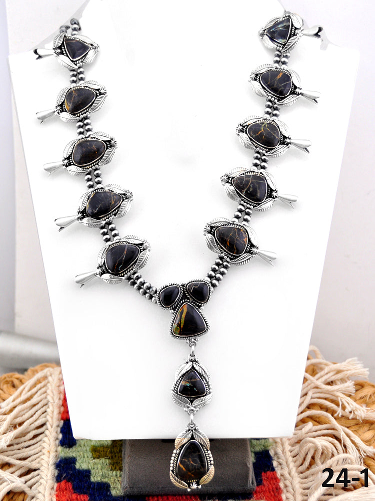Beautiful necklace. Southwest Handmade Black Jack Turquoise Beaded Necklace. It measures 23 inches long, along with a Drop of 4 inches and the Beads measures 4mm to 6mm in size. Stones are natural and will vary. The pendants measure from 1 to 1 1/2 inches. Signed by the artist and stamped sterling silver.