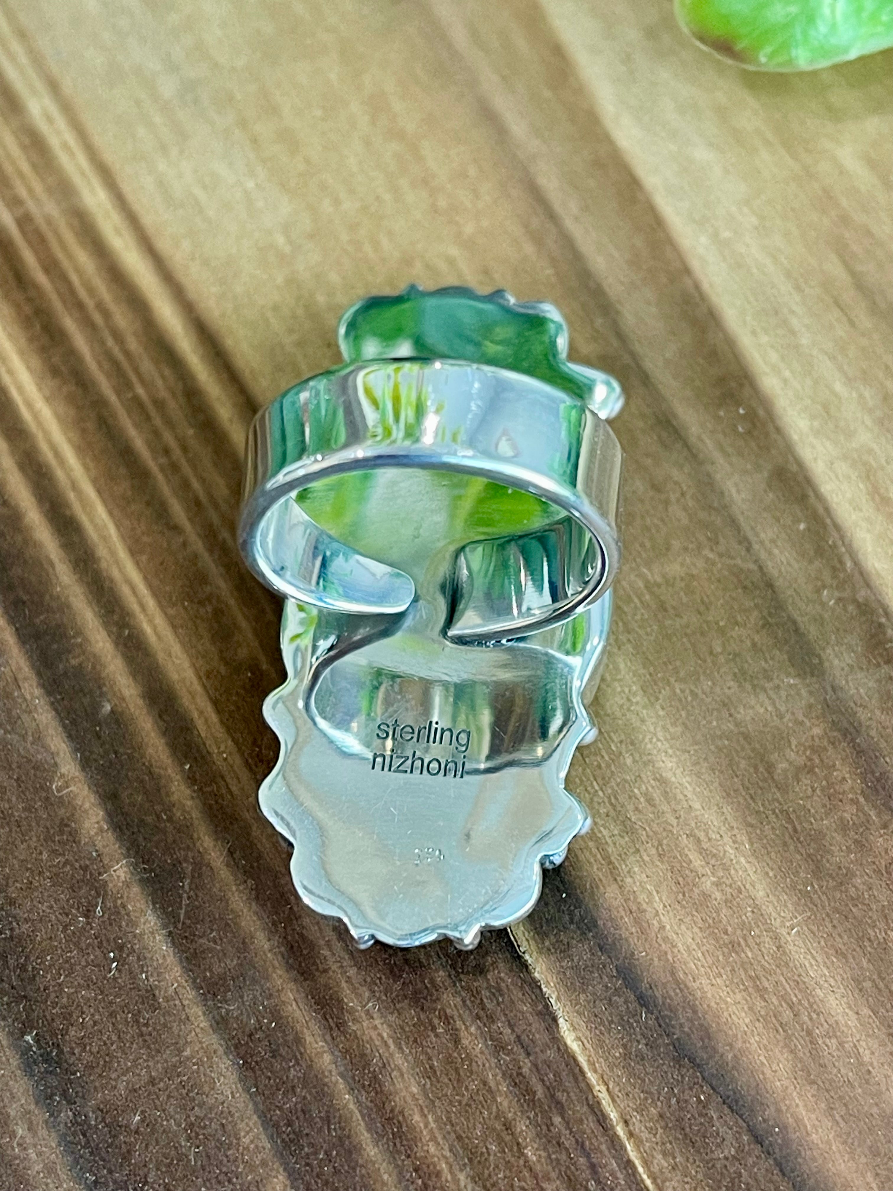 Beautiful ring. Southwest Handmade Emerald Valley Turquoise & Sterling Silver Adjustable Ring. It measures 1 3/4 inches long and 7/8 of an inch wide. Signed by the artist and stamped sterling silver.