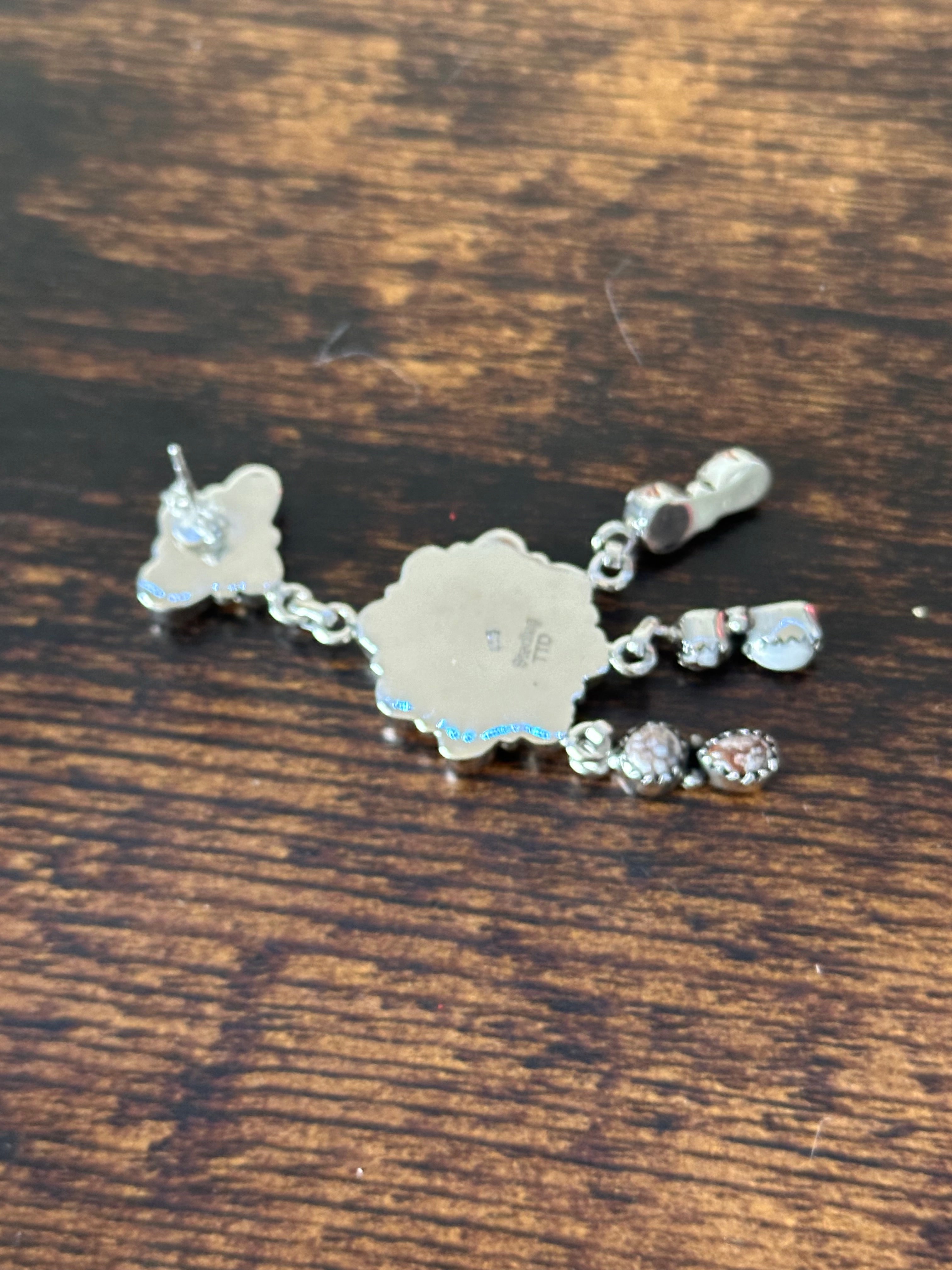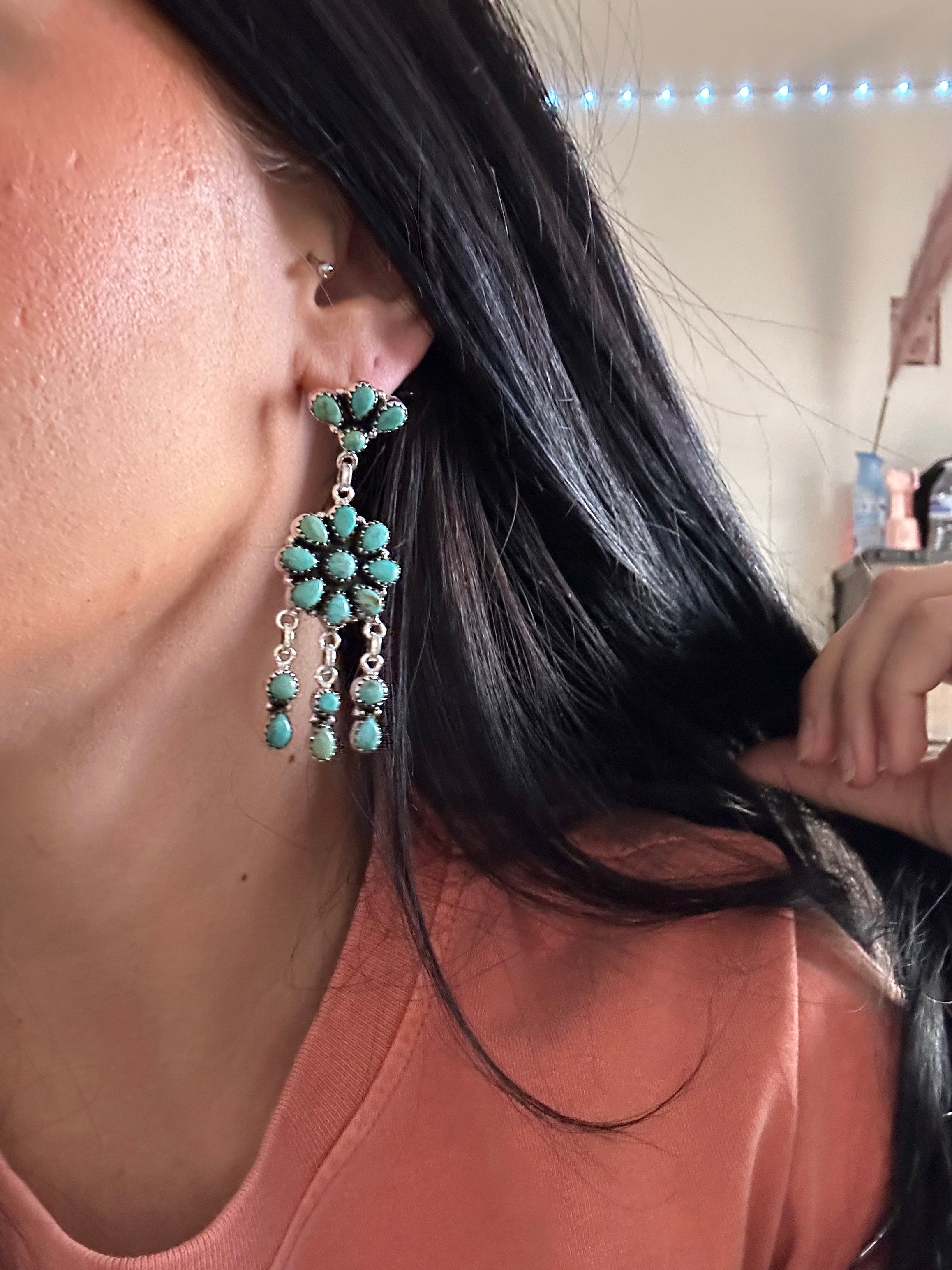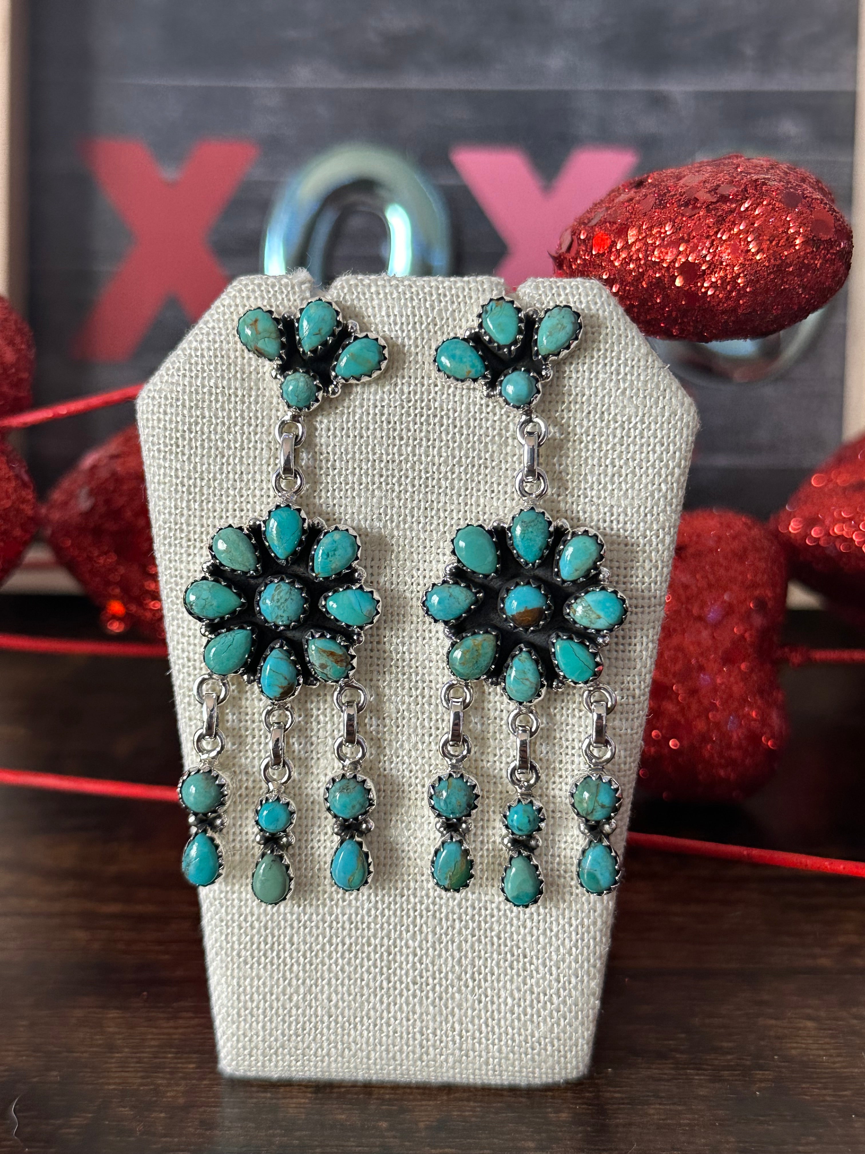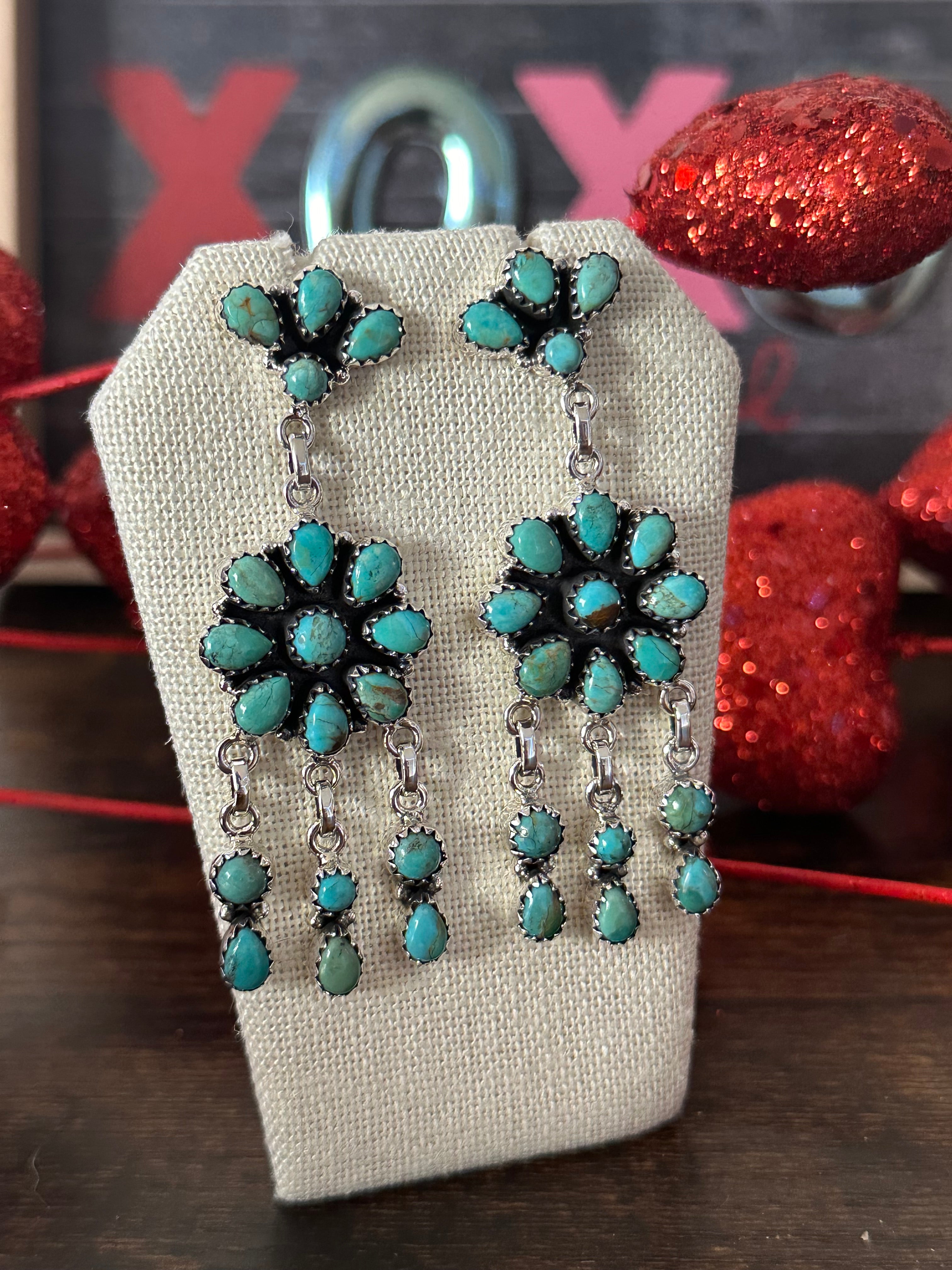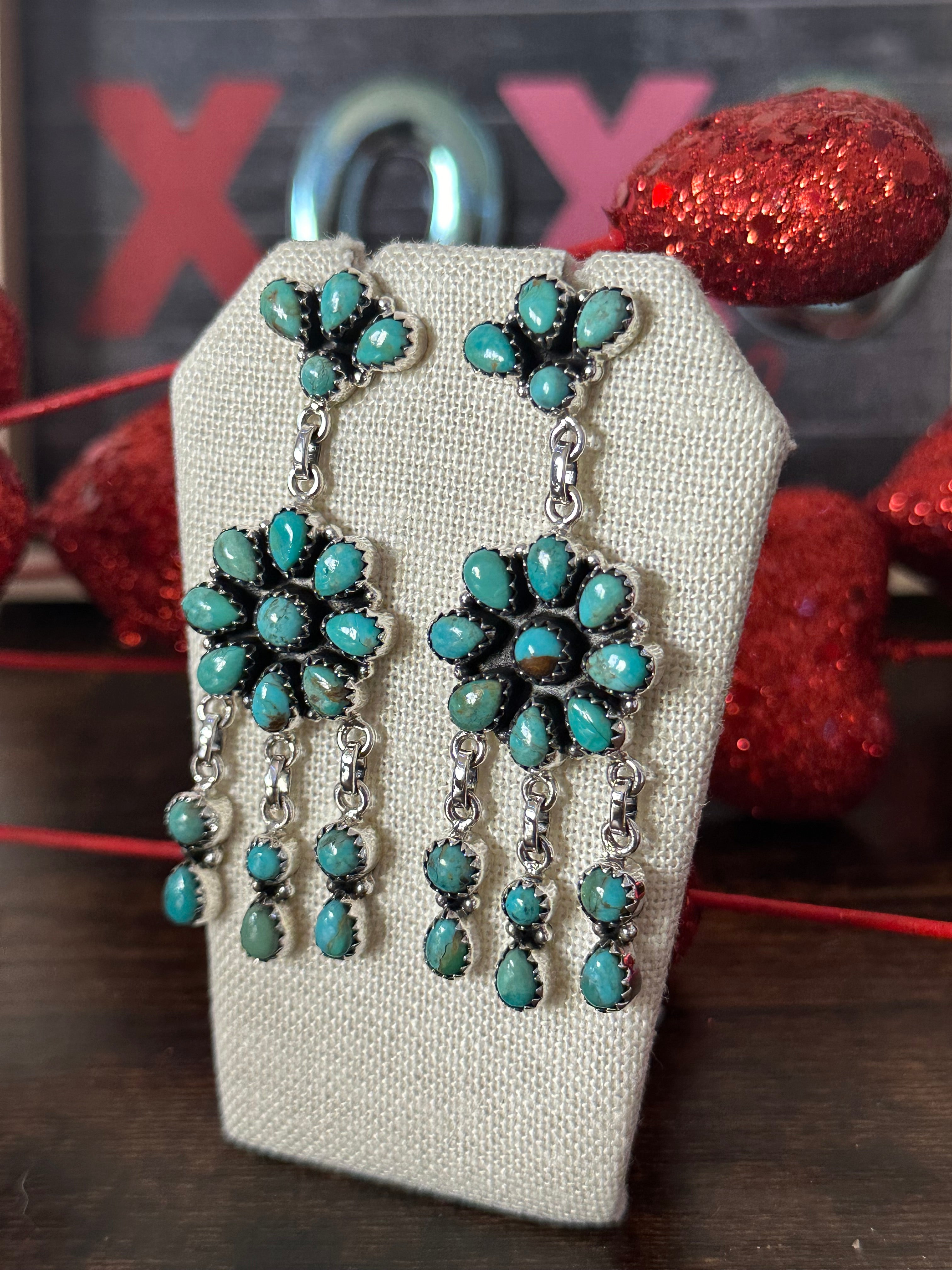 Breathtaking earrings. Southwest Handmade Kingman Turquoise & Sterling Silver Post Dangle Earrings. It measures 2 1/2 inches long and 7/8 of an inch wide. Signed by the artist and stamped sterling silver. Stones will differ due to natural stones.
