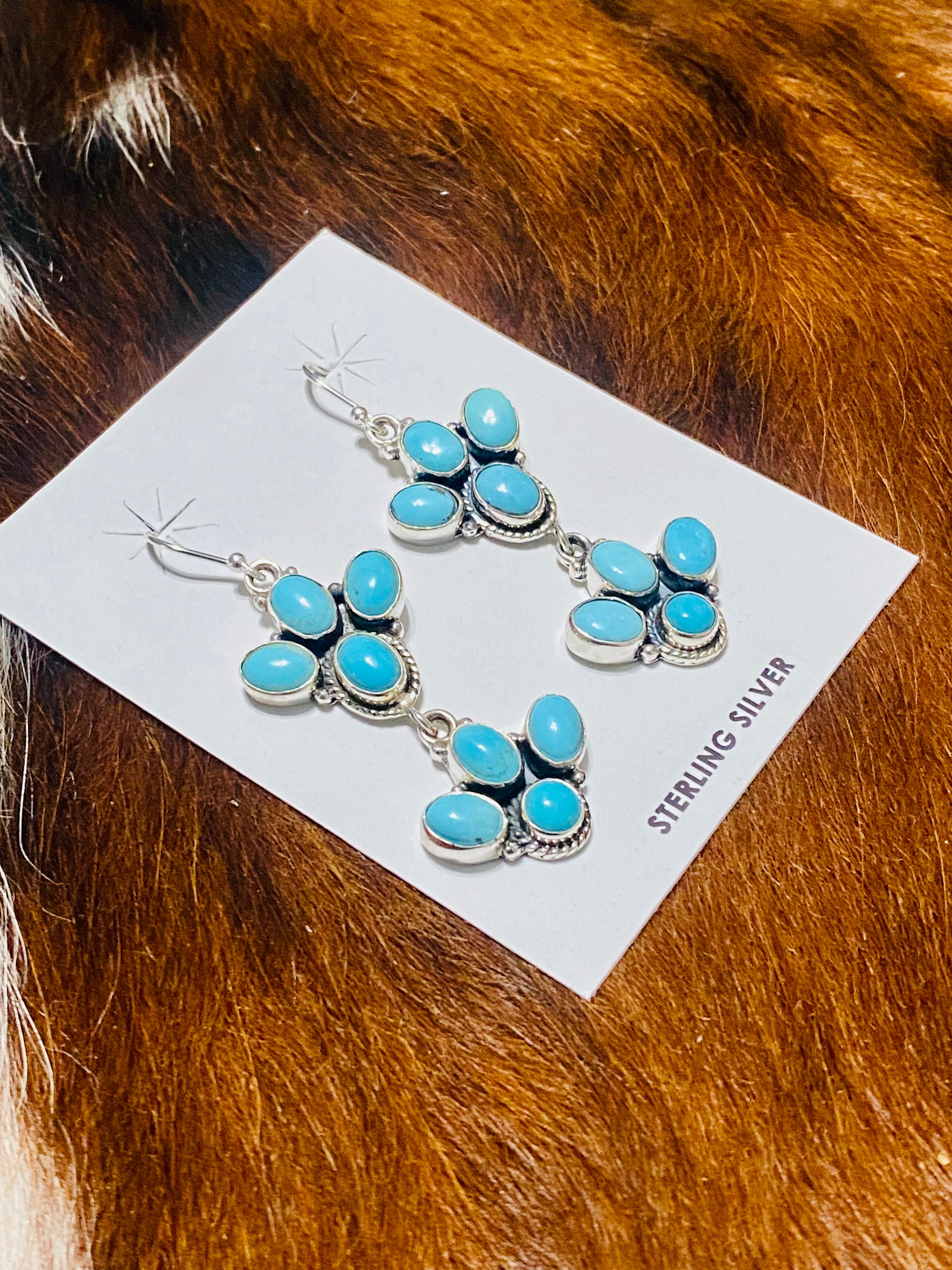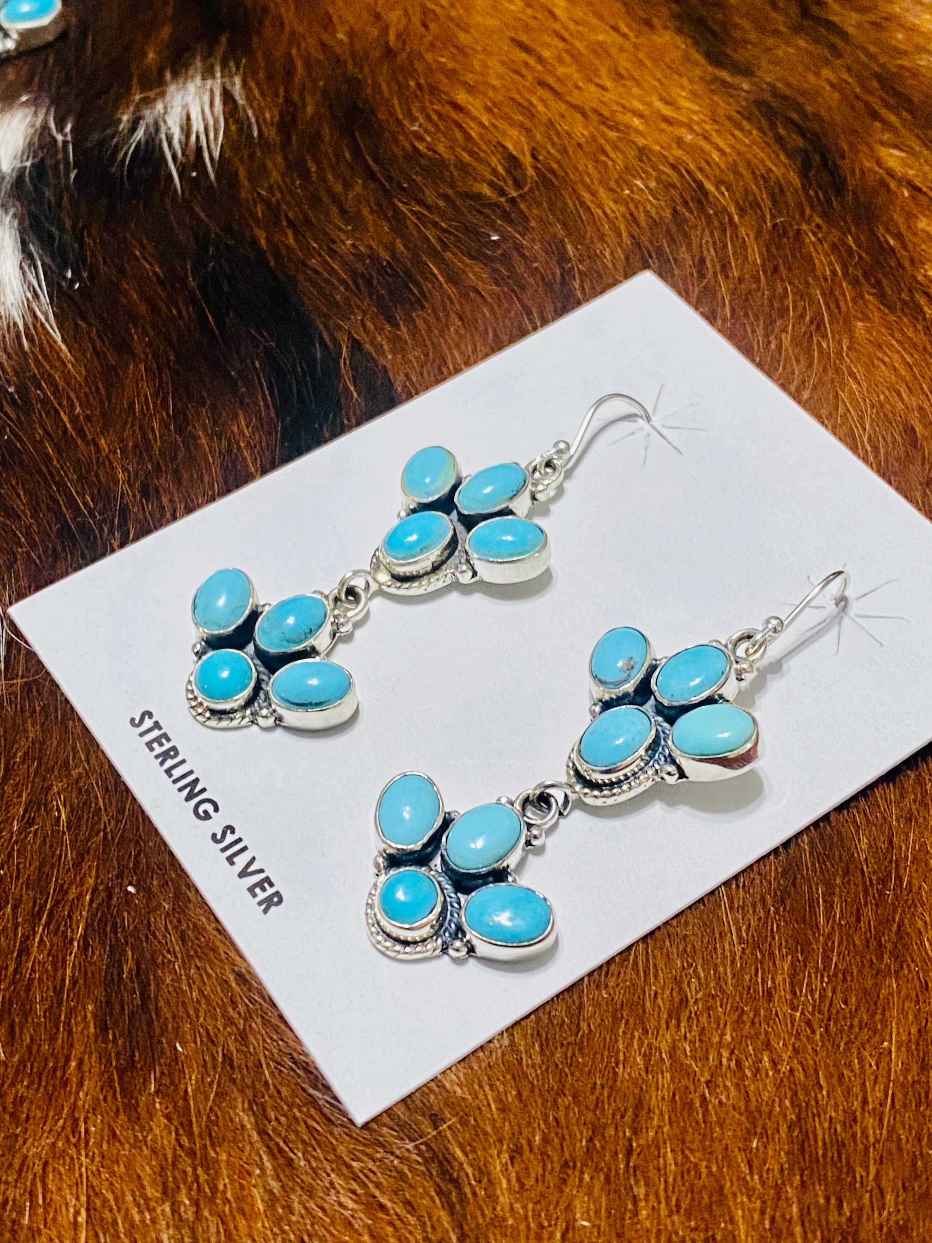Southwest Handmade Kingman Turquoise & Sterling Silver Squash Necklace Set. The necklace measures 24 inches long with hang while the earrings measure 2 1/4 inches long and 3/4 of an inch wide. Signed by the artist and stamped sterling silver.