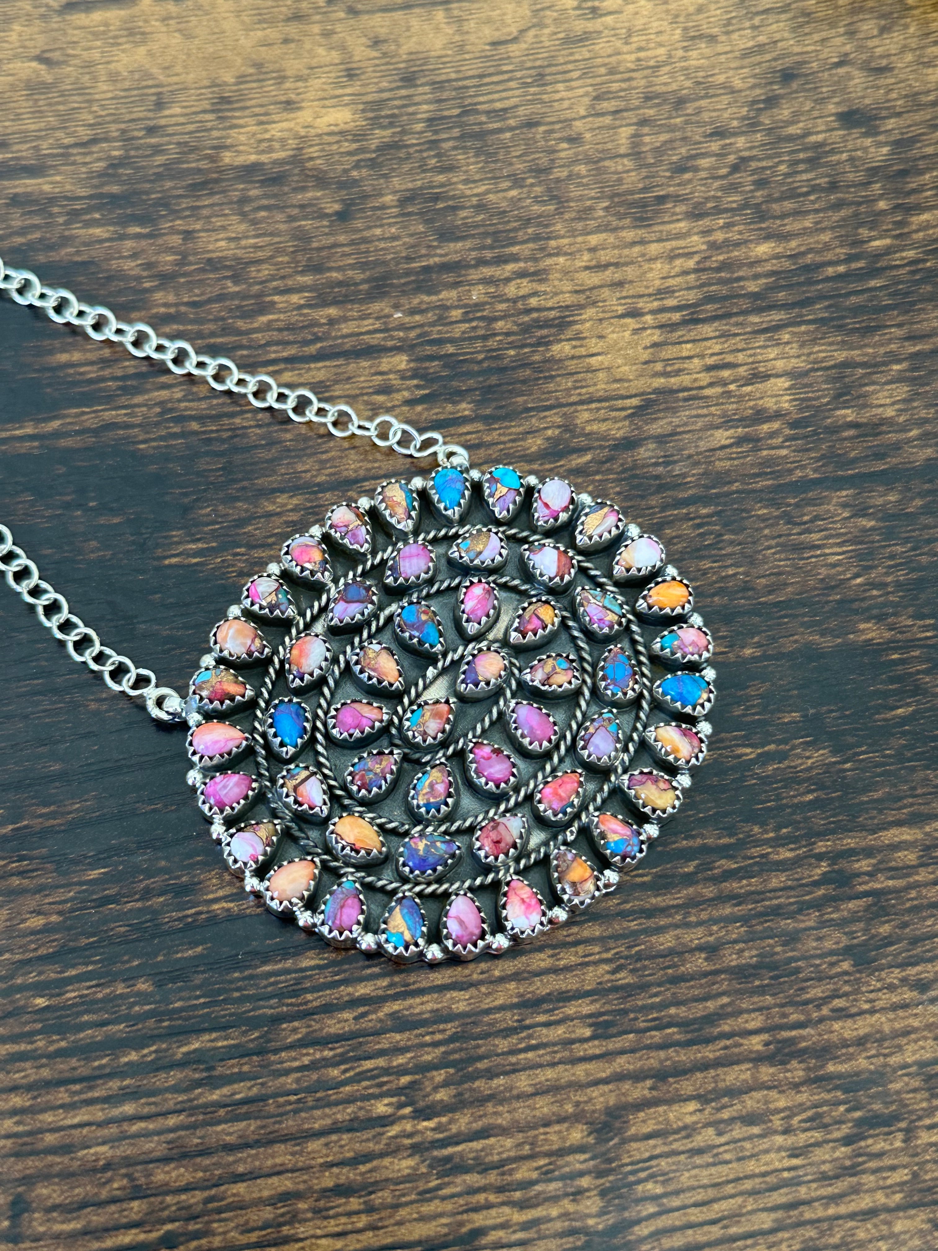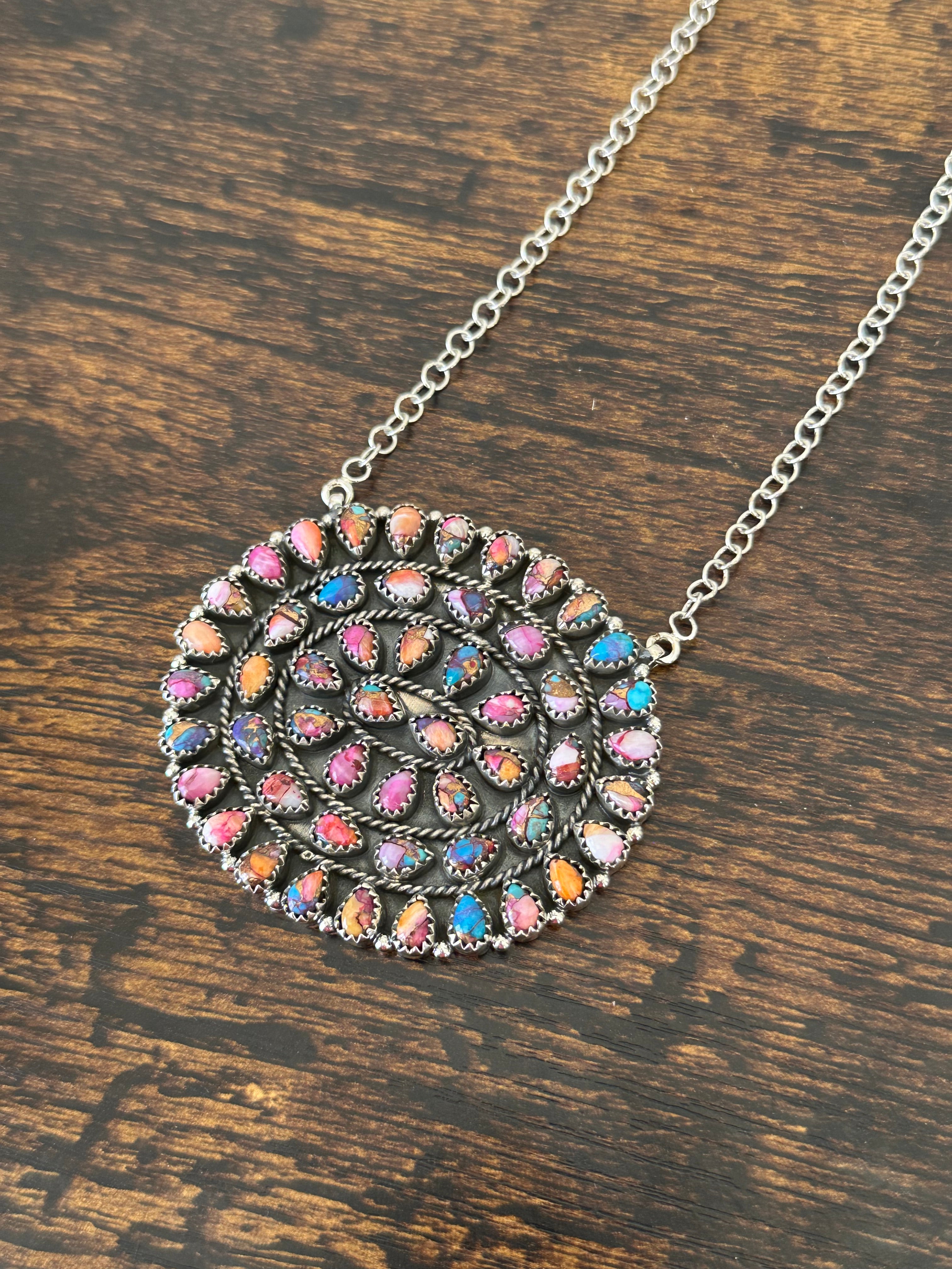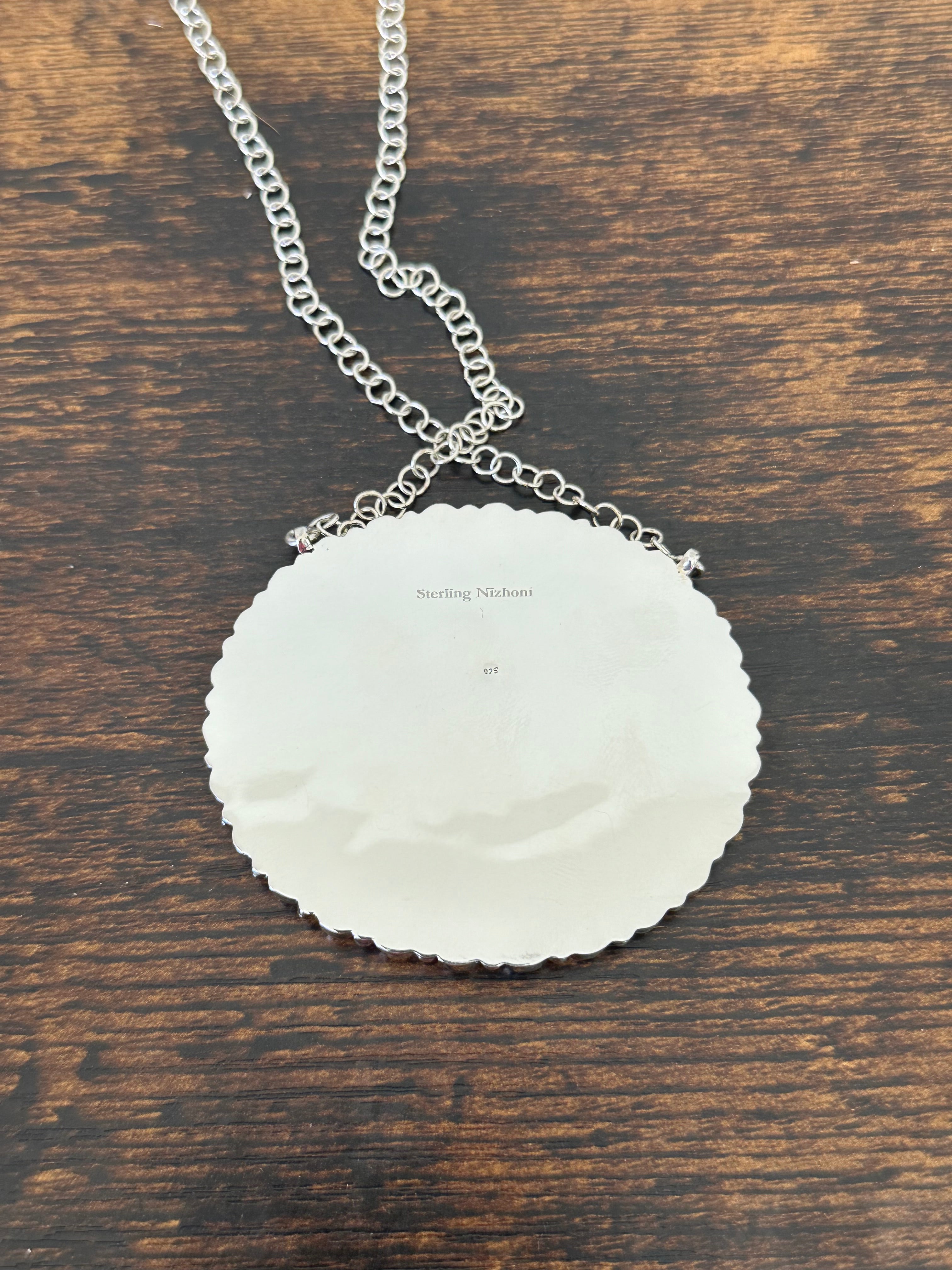 Beautiful necklace, great sterling around stone. Southwest Handmade Mohave Turquoise & Sterling Silver Cluster Necklace. It measures 21 inches long with hang while the chain by itself measures 16 inches long but can adjust down to 14 inches long. Signed by the artist and stamped sterling silver. Stones will differ due to natural stones.