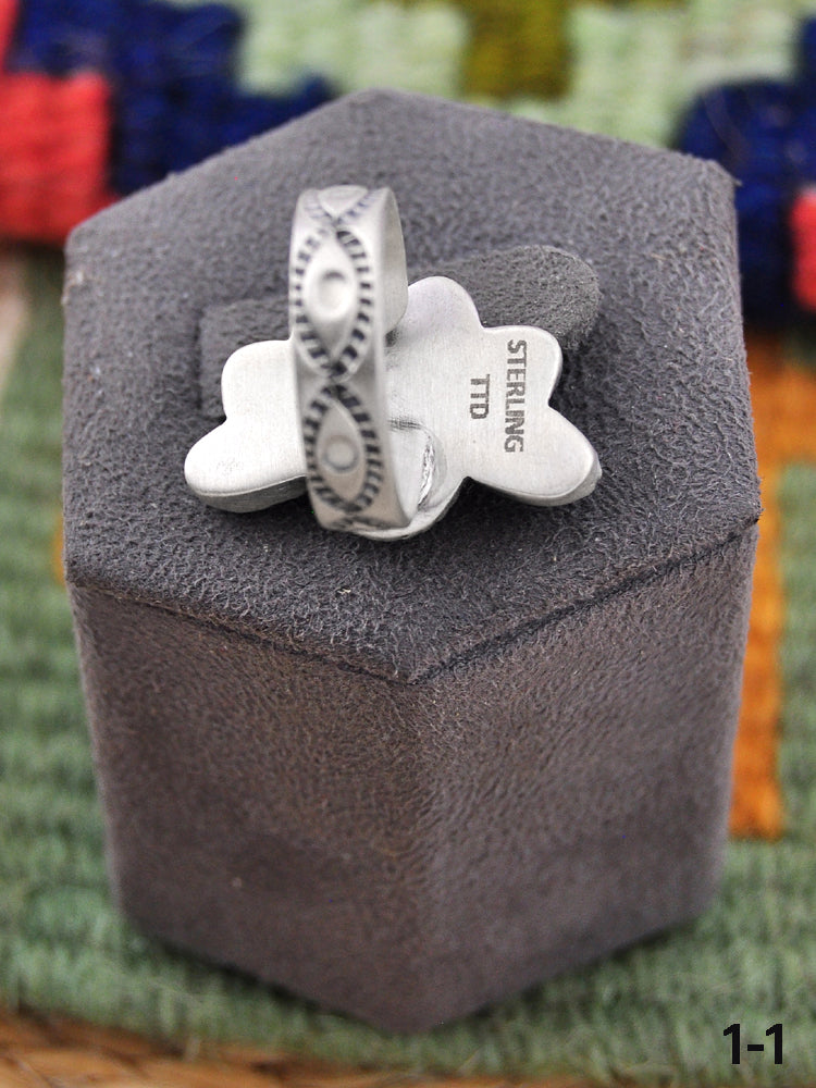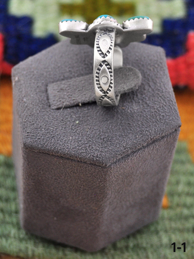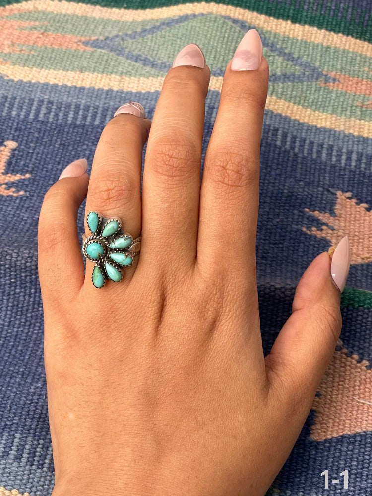 Southwest Made Kingman Turquoise & Sterling Sliver Half Cluster Adjustable Ring. It measures 1 inch long and 6/8 inch wide. Signed by the artist and stamped sterling silver.