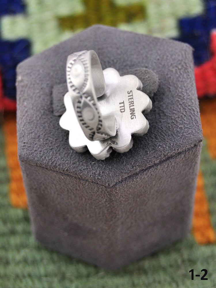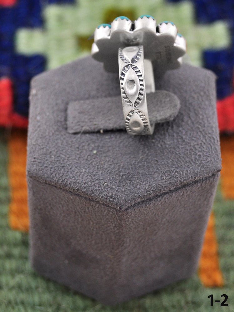 Southwest Made Kingman Turquoise & Sterling Sliver Cluster Adjustable Ring. It measures 7/8 inch long and 7/8 inch wide. Signed by the artist and stamped sterling silver.