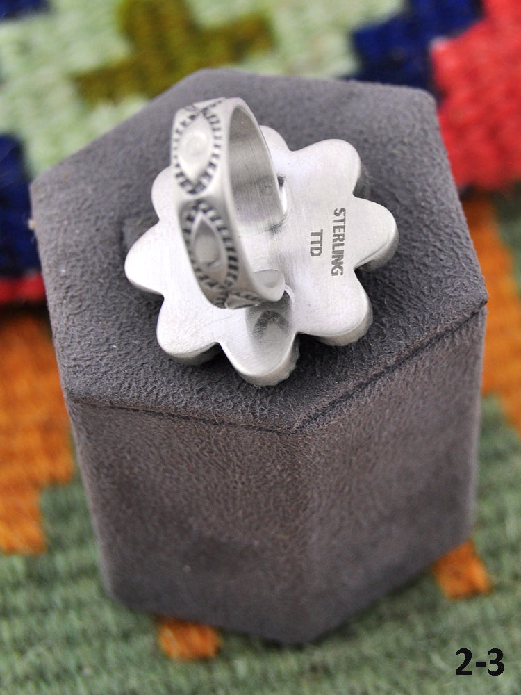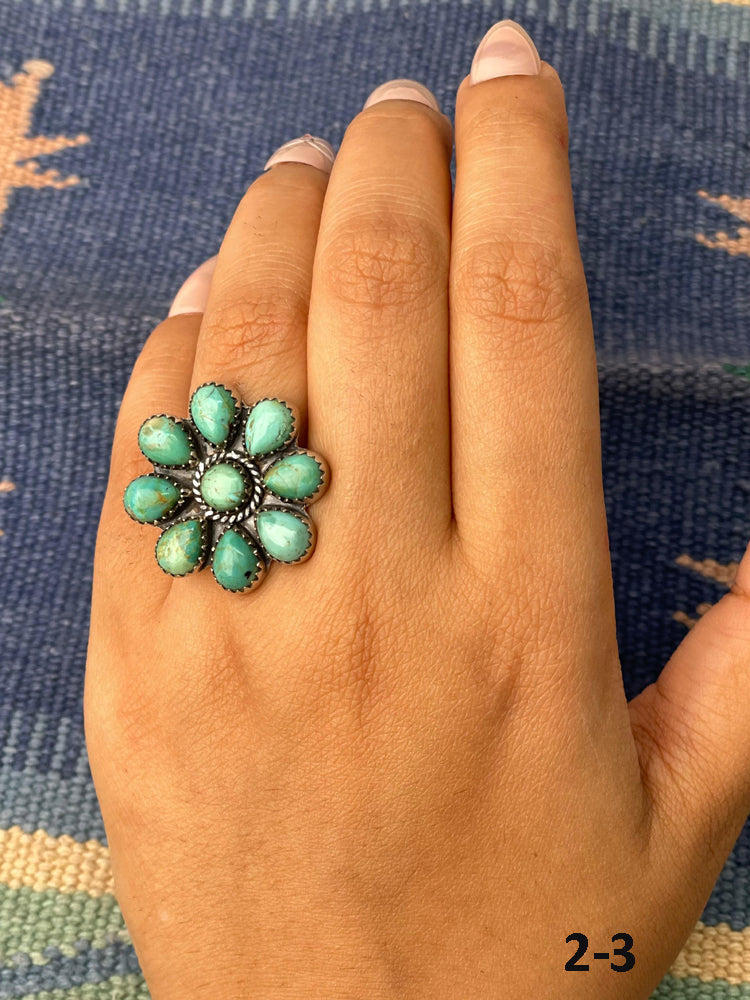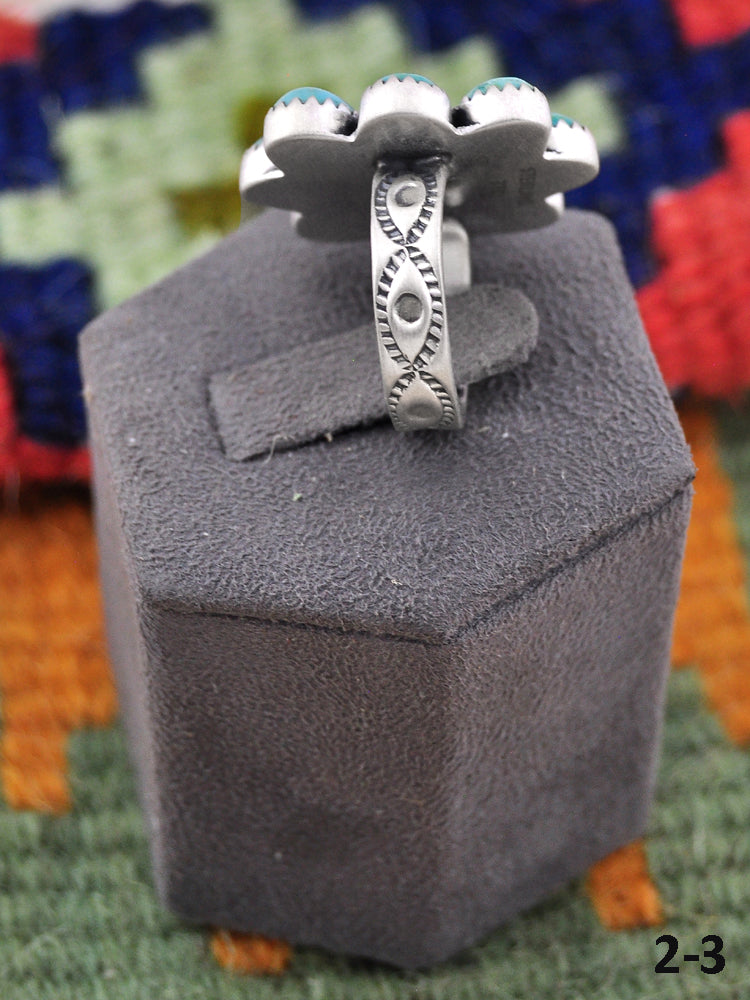 Southwest Made Kingman Turquoise & Sterling Sliver Cluster Adjustable Ring. It measures 1 inch long and 1 inch wide. Signed by the artist and stamped sterling silver.