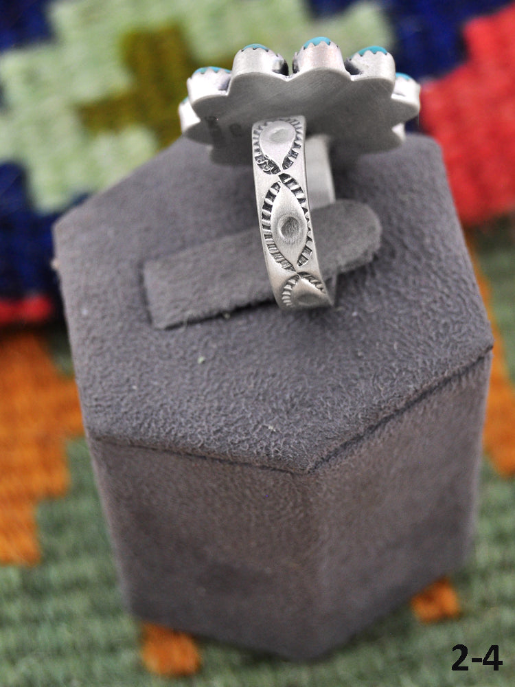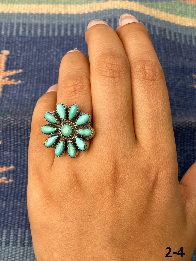 Southwest Made Kingman Turquoise & Sterling Sliver Cluster Adjustable Ring. It measures 1 inch long and 1 inch wide. Signed by the artist and stamped sterling silver.