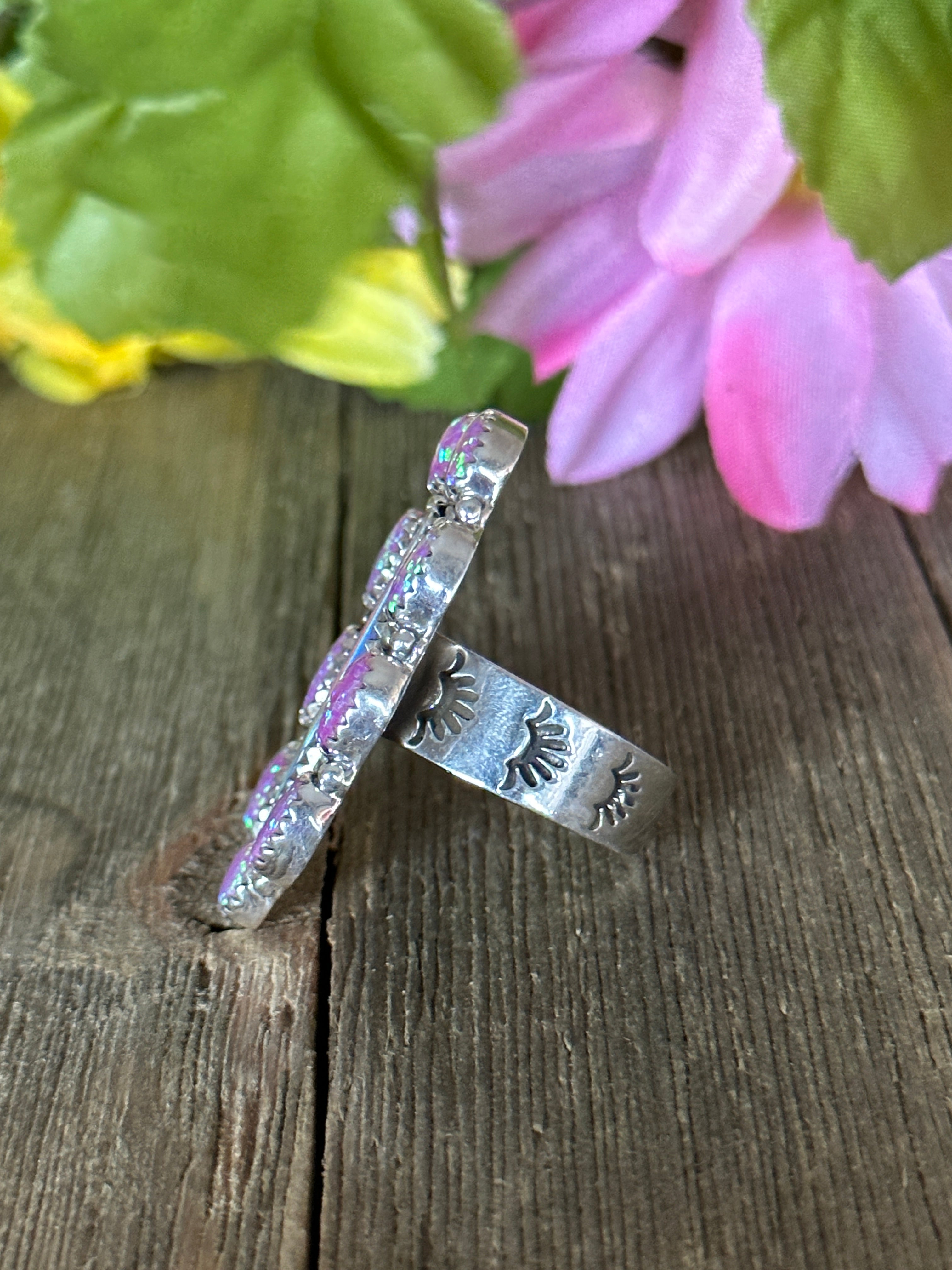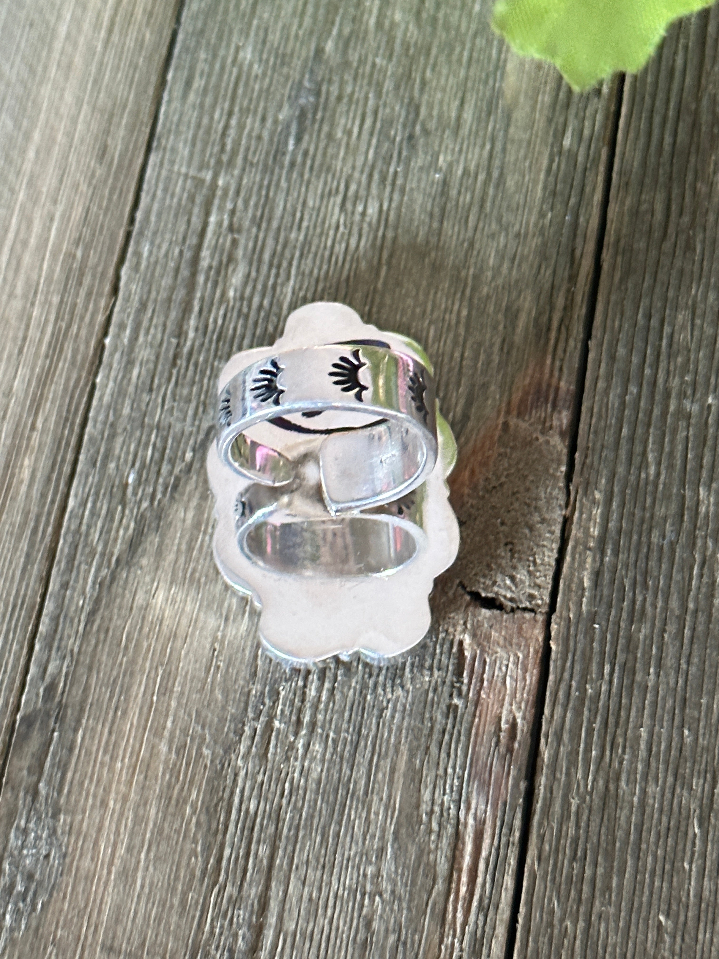 Southwest Handmade Multi Stone & Sterling Silver Adjustable Ring. It measures 1 5/8 inches long and 1 inch wide. Signed by artist and stamped sterling silver.